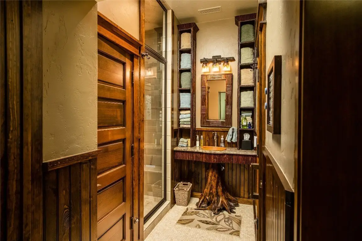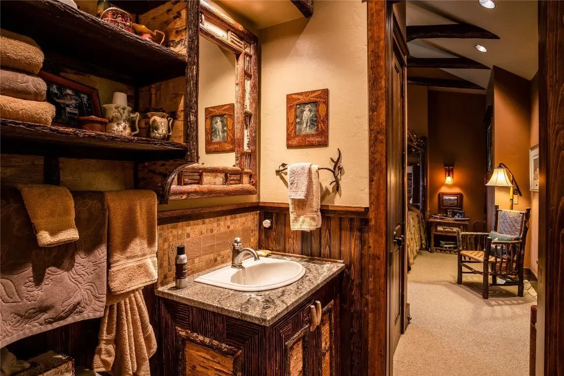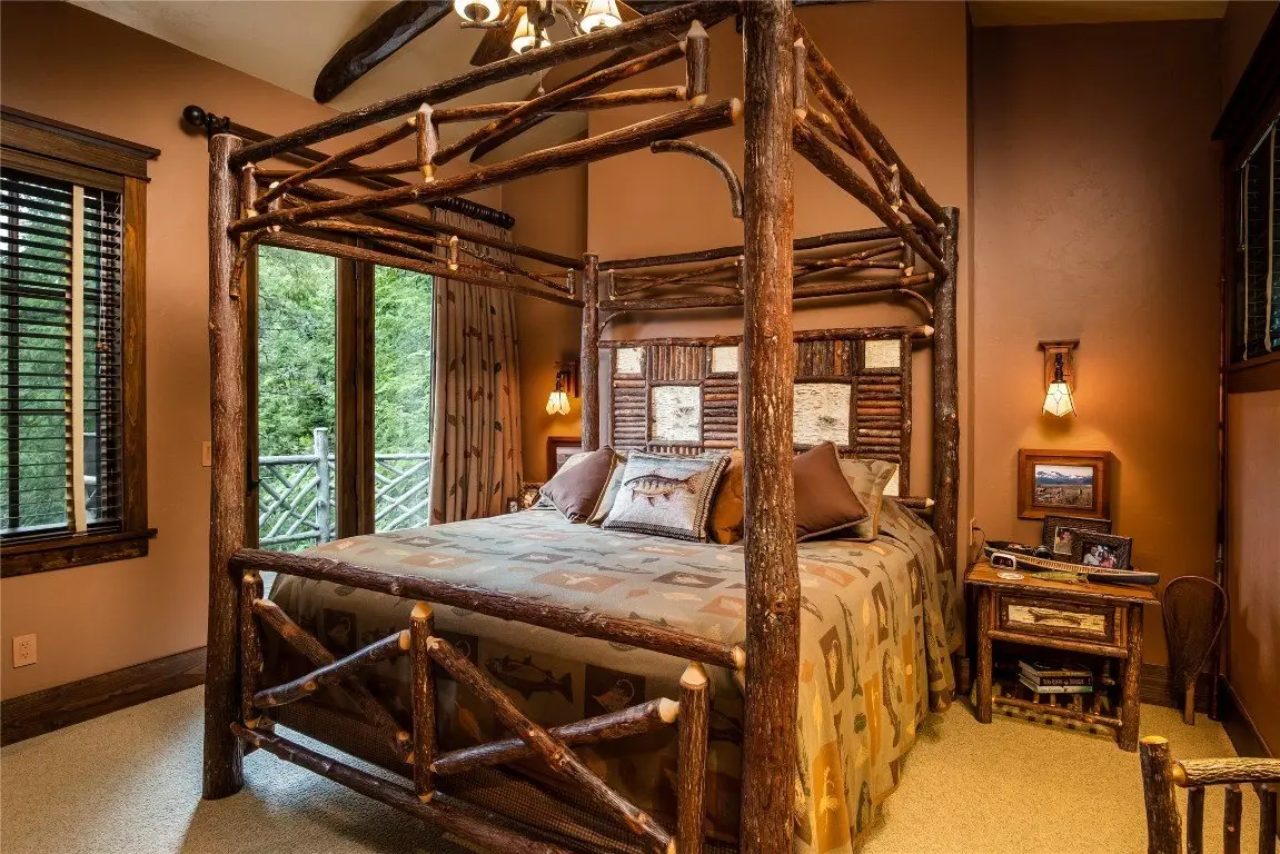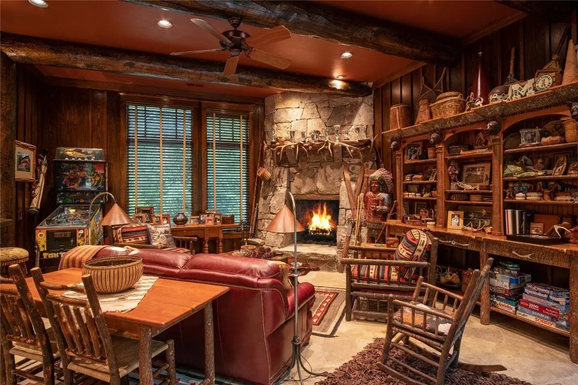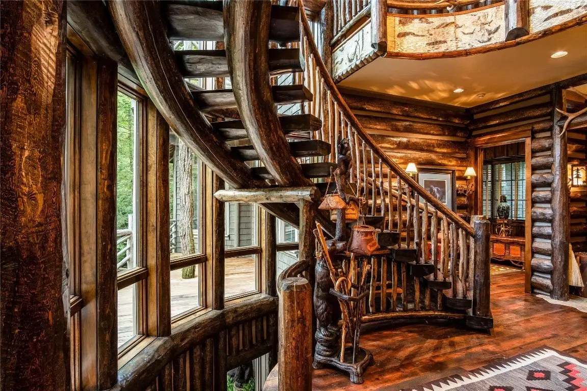 Just minutes from the shopping and fine dining of downtown Cashiers, Blue Bear Camp is the ultimate Adirondack-style mountain lodge. This prime property borders the Nantahala National Forest, ensuring privacy and abundant wildlife. Another world awaits in the dream-like setting amid the wild Chattooga River, flowering landscaping, a sparkling waterfall, and lush forest, all against the stunning backdrop of Whiteside Mountain and Devil's Courthouse. Reminiscent of the great camps in the early 1900s, the rustic decor is warm and welcoming with natural wood details such as pine logs with golden chinking, wax-rubbed reclaimed heart pine floors, and a grandiose circular log staircase surrounding a seven-foot antler chandelier. The staircase is a masterpiece of engineering, constructed from Colorado Ponderosa pine over three months. Much of the custom furniture and details were built by local craftsmen on site. Other unique finishes were created by artisans from across the country, using natural materials such as mica, aged copper, shed elk antlers from Wyoming, Canadian birch bark, wormy chestnut, and turquoise. The stunning stonework and multiple fireplaces throughout the home were built from Tennessee fieldstones, many of which reveal 300,000-year-old fossils. In addition to the private guest quarters with a kitchenette and laundry room, the sprawling three-story home with an elevator offers an abundance of space for family and guests to explore, including a sunroom, library, an artist studio, game room, wine cellar, a resplendent home theater, and a fitness room with a sauna and steam room. Nature lovers will revel in the magical surroundings and fresh mountain air on the covered porch amid sights and sounds of the rushing waterfall. There's something for everyone to enjoy in an area offering residents access to the countless natural resources and opportunities for outdoor recreation such as hiking, fly fishing, biking, skiing, and golf.