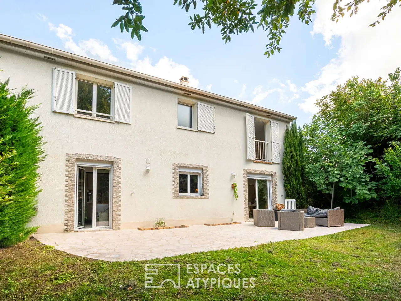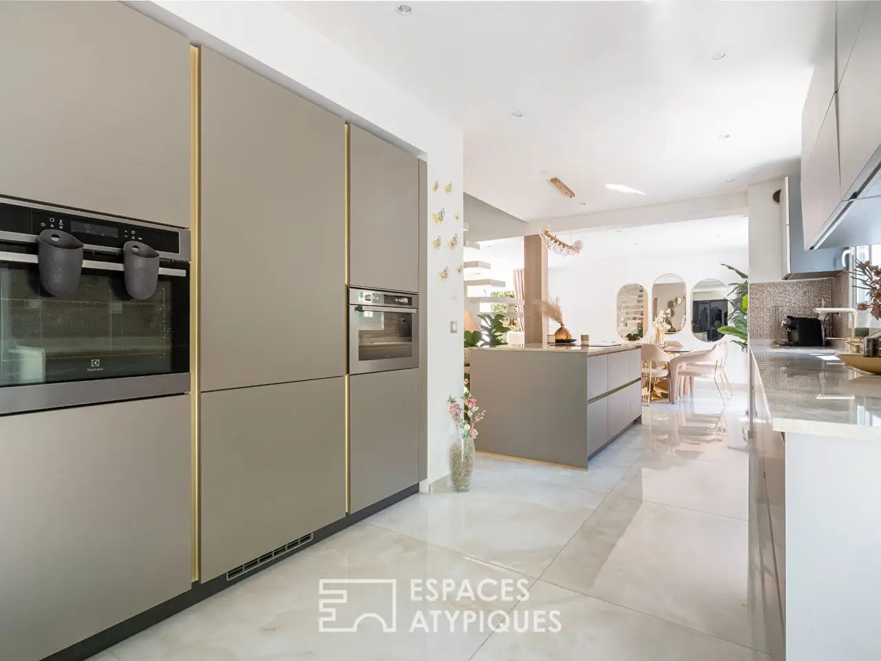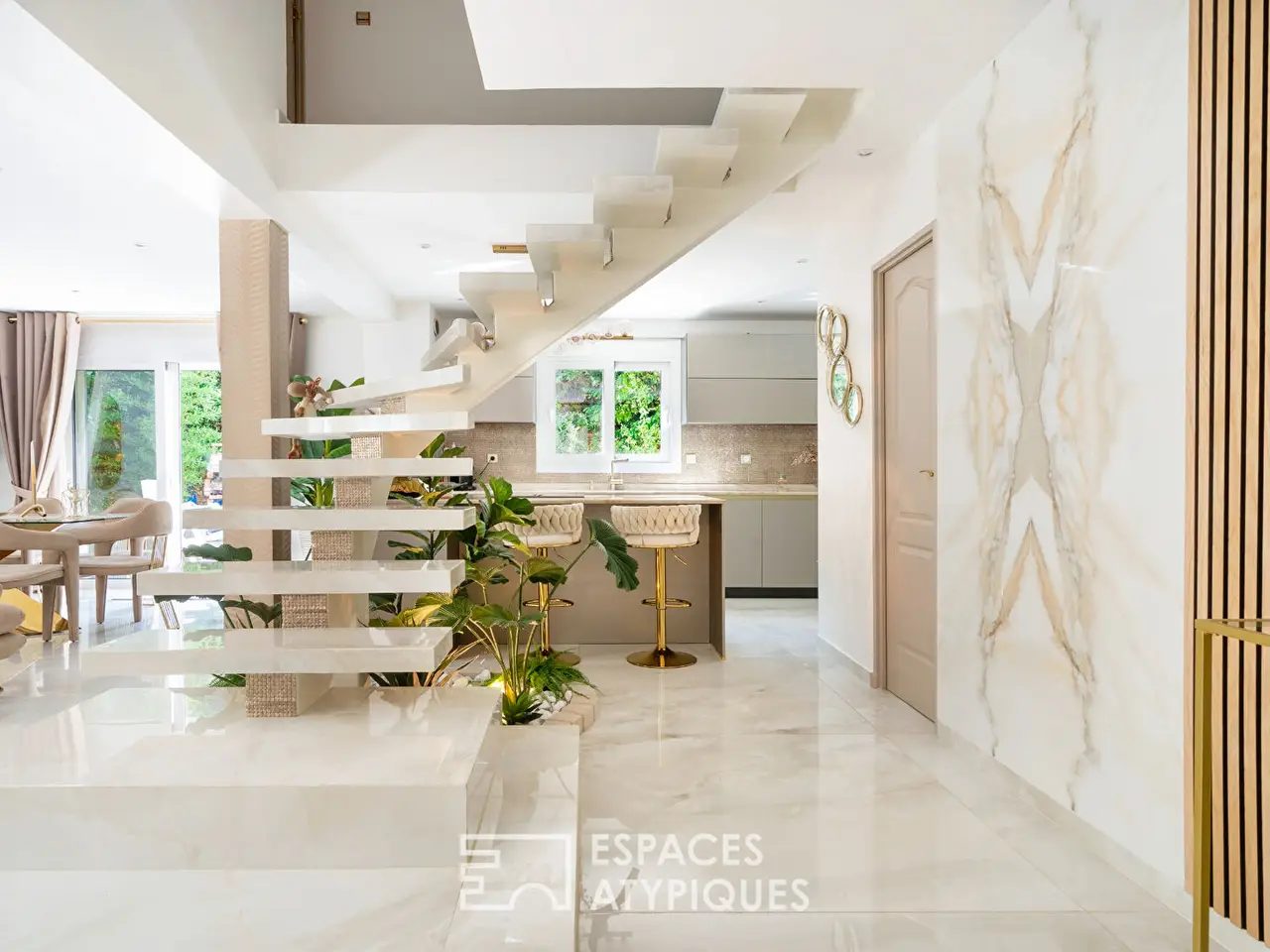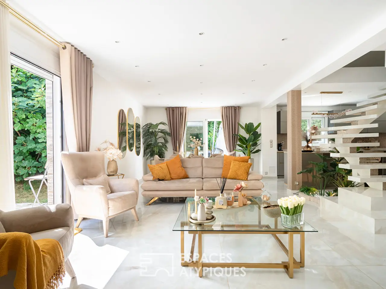 In Thiais, in the sought-after Green Valley development, this 180 m2 family home, completely redesigned by its owners, offers a refined yet welcoming living experience. Nestled on a 587 m2 plot, its understated, elegant lines stand out in a quiet residential area, just a stone's throw from schools and amenities. From the moment you enter, the atmosphere is striking: polished stone floors, powdery colours, a high-end feel and omnipresent light reveal an interior that has been treated with the utmost care. The vast living space, which runs through the property and is bathed in light, plays on transparency and reflections. It features a cosy lounge facing an integrated screen wall, a convivial dining room and a contemporary open-plan kitchen with minimalist lines and fully equipped. The whole space flows harmoniously into the garden, which is not overlooked, offering a natural and intimate extension on sunny days. A pantry, separate WC and garage complete the ground floor facilities. In the centre of the room, a sculptural staircase, seemingly suspended, creates a graphic transition to the upper floor. This level offers two bedrooms with storage space, a shower room with WC, a laundry area, and a sumptuous 40 m2 master suite with a custom-made dressing room and double sink shower room. The top floor houses a fourth bedroom with its own shower room, as well as an attic offering additional storage space. On the practical side, the house is located just a few minutes' walk from: - Nursery, pre-school, primary school, secondary school and sixth form college. - Shops and TVM. - Close to Thiais Village and Belle Épine shopping centre. This house charms with its tranquillity, its complete renovation in a soothing contemporary style, and its functionality designed for the everyday life of a modern family. The house is located in a residential development with quarterly service charges. REF. 12629 Additional information * 6 rooms * 4 bedrooms * 3 shower rooms * 2 floors in the building * Outdoor space : 587 SQM * Parking : 3 parking spaces * Property tax : 2 631 € Energy Performance Certificate Primary energy consumption d : 200 kWh/m2.year High performance housing