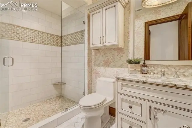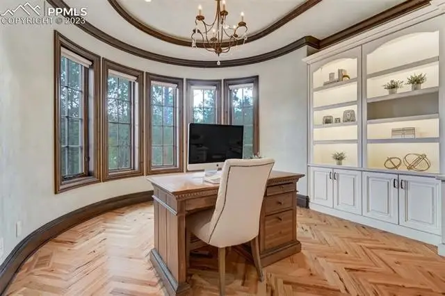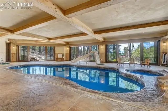Nestled in the trees overlooking a pond in the exclusive gated community of High Forest Ranch, this luxury retreat offers a seamless integration of luxury, technology, and craftsmanship. The grand entrance opens to a custom wood mosaic floor and water feature. Look thru to the great room as the soaring vaulted ceilings with wood trusses, chandelier, and a wall of windows showcase mountain views. The gourmet kitchen is a chef's dream, featuring top-of the line appliances: 2 Bosch dishwashers, beverage fridge, Capital commercial range, pot filler, Miele speed oven and fridge/freezer. Generous center island with counter seating and dining room complete the area. A cozy Hearthroom with tongue/grove ceiling leads to a beautiful light/bright sunroom! Luxurious primary suite is a tranquil oasis with a fireplace, deck access, 2 closets with built in organizers, washer/dryer and a safe. Spa-like bath features a soaking tub with jets, and a fully enclosed steam shower with a 4 shower heads, jets, and Moen controls. Spiral staircase leads to a loft with a water feature and wet bar. The expansive deck is perfect for Colorado year round with a built in grill, fire pit, and plenty of space to enjoy sunsets and views. Upstairs find 3 spacious bedrooms all with private bath and walk-in closets, and 1 of the 3 offices. Basement with a large rec room and amenities provide plentiful opportunity to entertain. Gorgeous hand crafted bar has a Safe room with Fort Knox vault door hidden behind shelving, and a wine room is next to it! Incredible home theater, Poker/game room, exercise room complete the area. Executive style office provides a private entrance and is ideal for client meetings. Indoor pool and spa to enjoy year round, along with a wet bar, and a laundry room/bathroom for convenience. Electric and solar thermal panels are ownedHigh Forest Ranch offers 33 acres of green space, 8 miles of hiking trails, community clubhouse, 2 fishing ponds! *Comprehensive list of technology