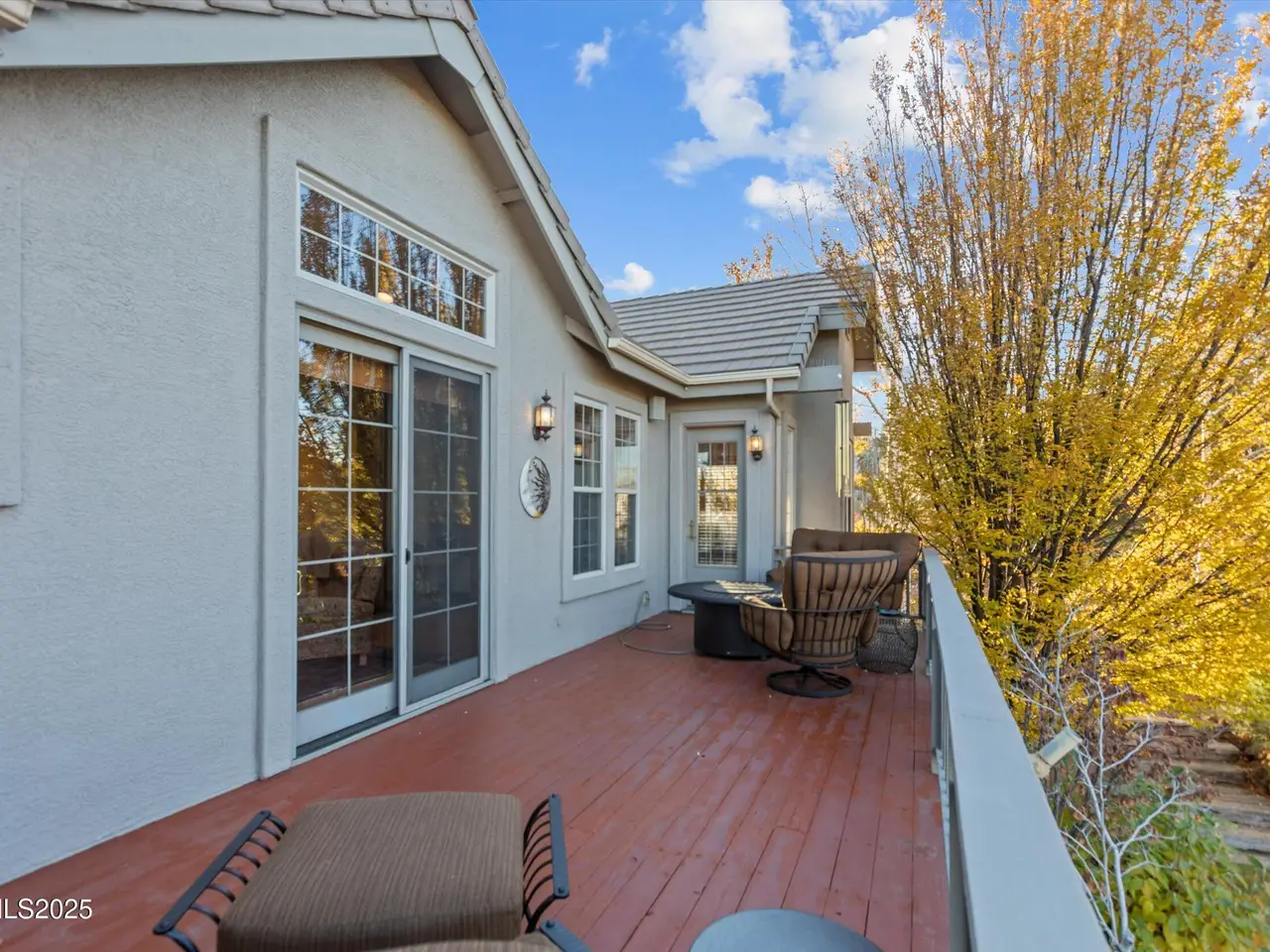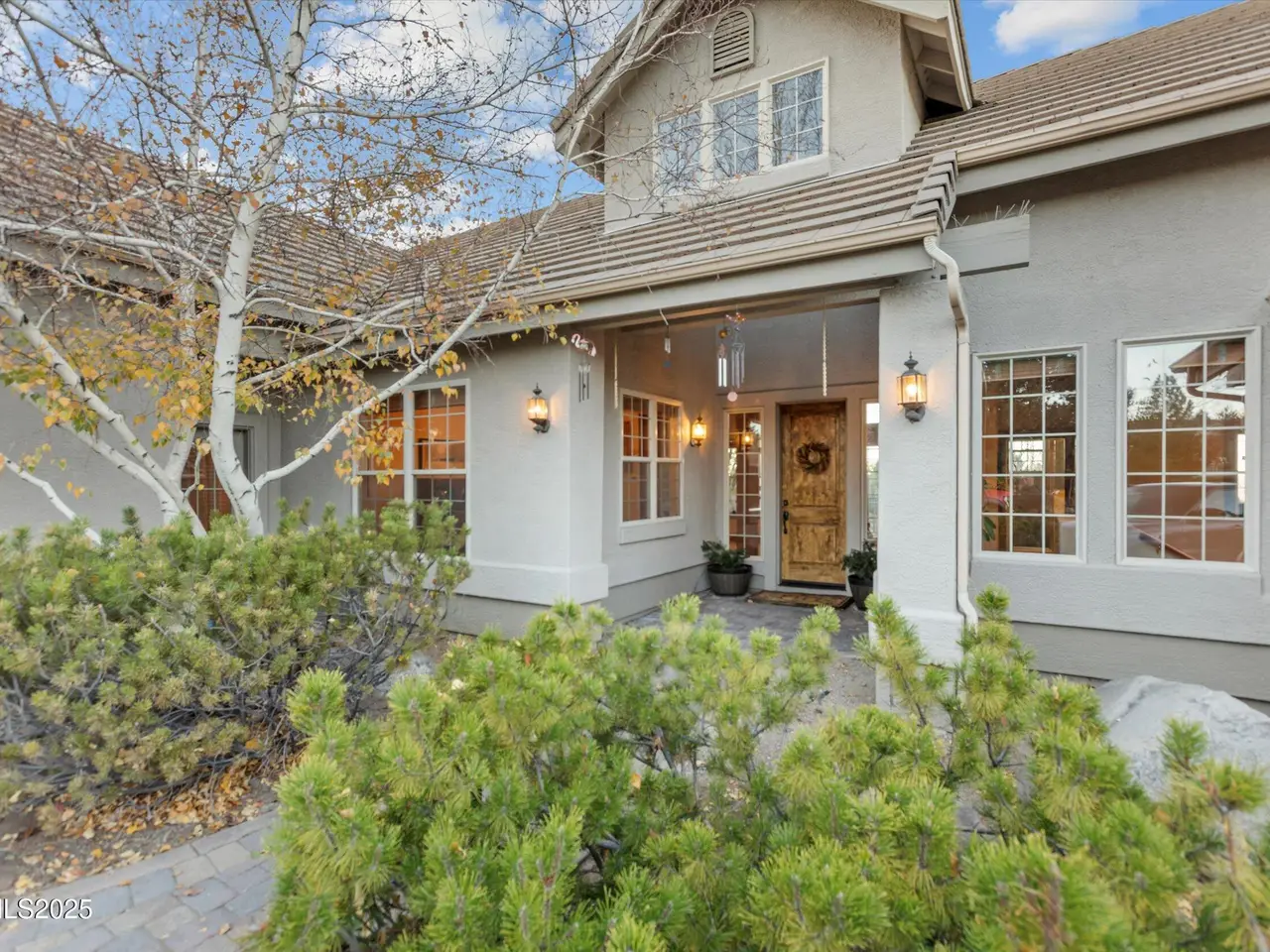 Private cul-de-sac living in Saddlehorn with wide views of Mt. Rose, the Sierra, and the Reno skyline. This custom home blends timeless architecture with a peaceful, elevated setting. Historic reclaimed wood beams from old railroad tunnels deliver distinctive Nevada character. Main-level living features formal living and dining rooms, a welcoming family room, and a well-appointed kitchen with custom cabinetry and excellent storage. The primary suite is also on this level for comfort and ease. Downstairs, two additional bedrooms and a large bonus/media room open to outdoor living areas surrounded by mature landscaping and natural scenery. Saddlehorn parkland borders the property on two sides, providing added privacy, improved sun exposure, and enhanced views. A rare 4-car garage offers outstanding space for vehicles and gear. Residents enjoy walking trails, parks, and community recreation close by, with Galena hiking and shopping minutes away. Mt. Rose Ski Area is just 11 miles up the road. A quiet, scenic location paired with respected custom design. Strong architecture. Everyday convenience. Ready for what's next.