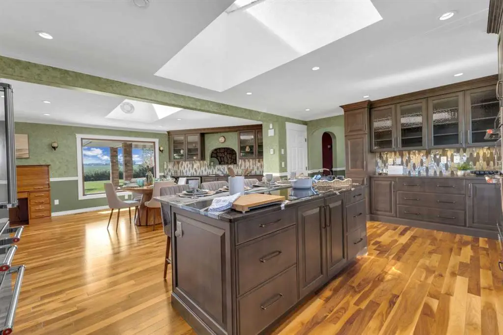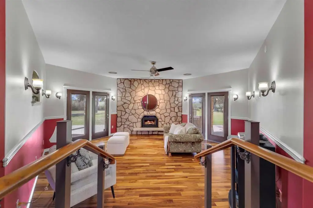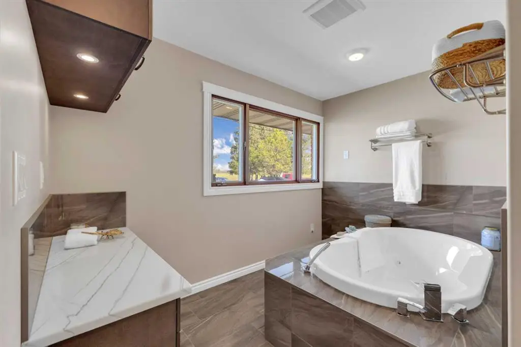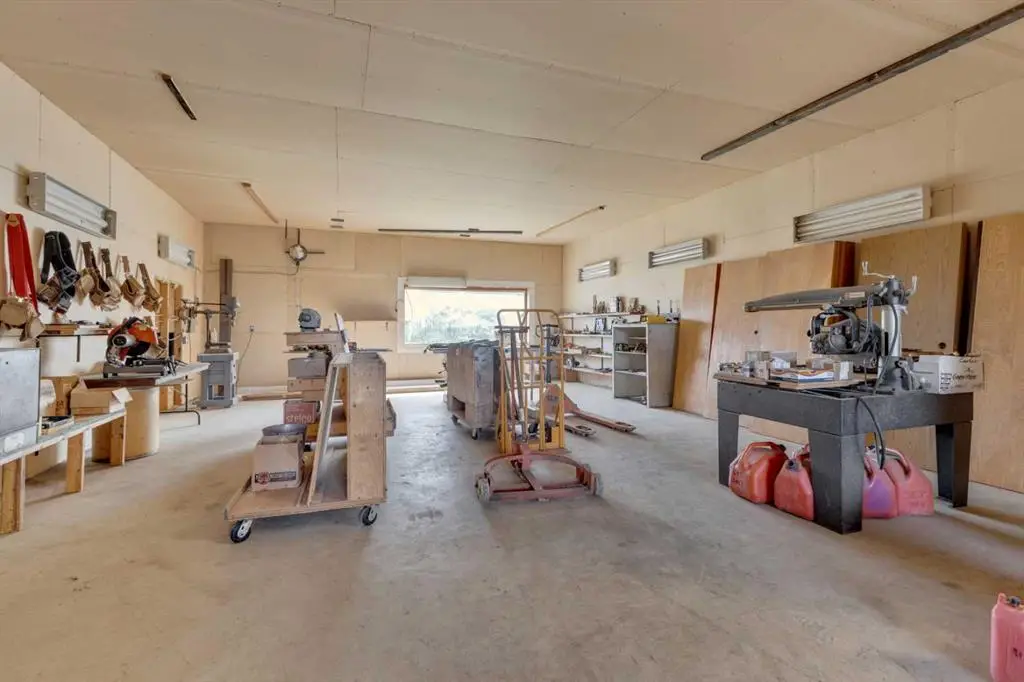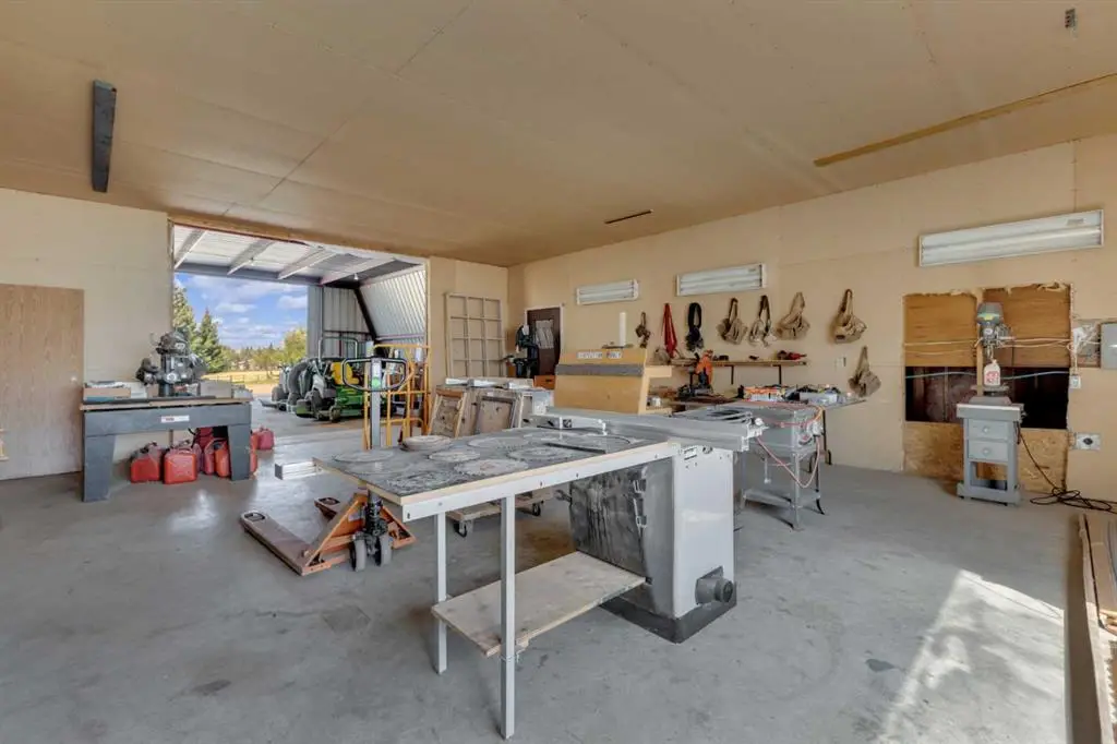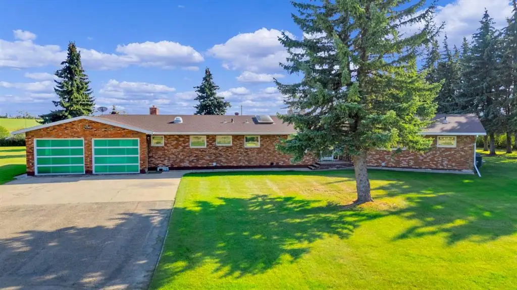 This exceptional property offers 17.92 acres with two residences, a fully finished shop, and multiple outbuildings, located just 1 mile off Hwy 11A on a quiet dead-end road for added privacy, while still providing quick access to both Red Deer and Sylvan Lake. The main home is a spacious bungalow, fully renovated in 2016 with a new roof in 2010. Highlights include hardwood and tile flooring, granite countertops throughout, and an open concept kitchen with a large granite island, black stainless steel appliances, induction cooktop, convection wall oven, warming oven, built in microwave, beautiful cabinetry, and a stunning tile backsplash that flows through the kitchen and dining area. The living room features a wood-burning fireplace, while the sitting room offers a gas fireplace. The primary suite includes a walk-in closet and a luxury ensuite with full bathroom and a deep soaker jet tub in its own private area. Two additional main floor bedrooms, a full bathroom, a half bathroom and the laundry area complete the main level. The basement is nearly finished with a large recreation room, cold room, and utility room with two furnaces, water softener, and A/C. The attached oversized double garage is heated with radiant heat. A second residence, a 2014 manufactured home, offers 3 bedrooms, 2 full bathrooms, air conditioning, washer/dryer, a walk-in pantry, a primary suite with walk-in closet, and a deep corner jetted tub. Outbuildings include a 60’ x 100’ heated shop with radiant heat, three oversized doors (16’ and 14’), bathroom with urinal, washer/dryer hookup, concrete floors in excellent condition, and 220V power in shop (3), quonset (2) and garage (1). Additional buildings include a 70’ x 40’ Quonset with concrete floor, power, and roughed-in underfloor heating, plus five sheds. Both the shop and Quonset feature durable metal roofing. Approximately 16 acres are currently seeded to barley under a gentleman’s agreement until mid-September. This rare offering combines two residences, extensive outbuildings, privacy on a dead-end road, and a prime location close to town — the opportunities here are truly endless.