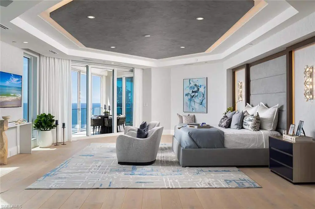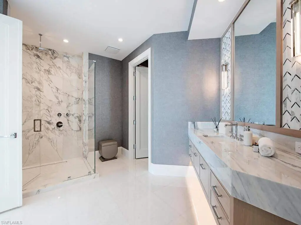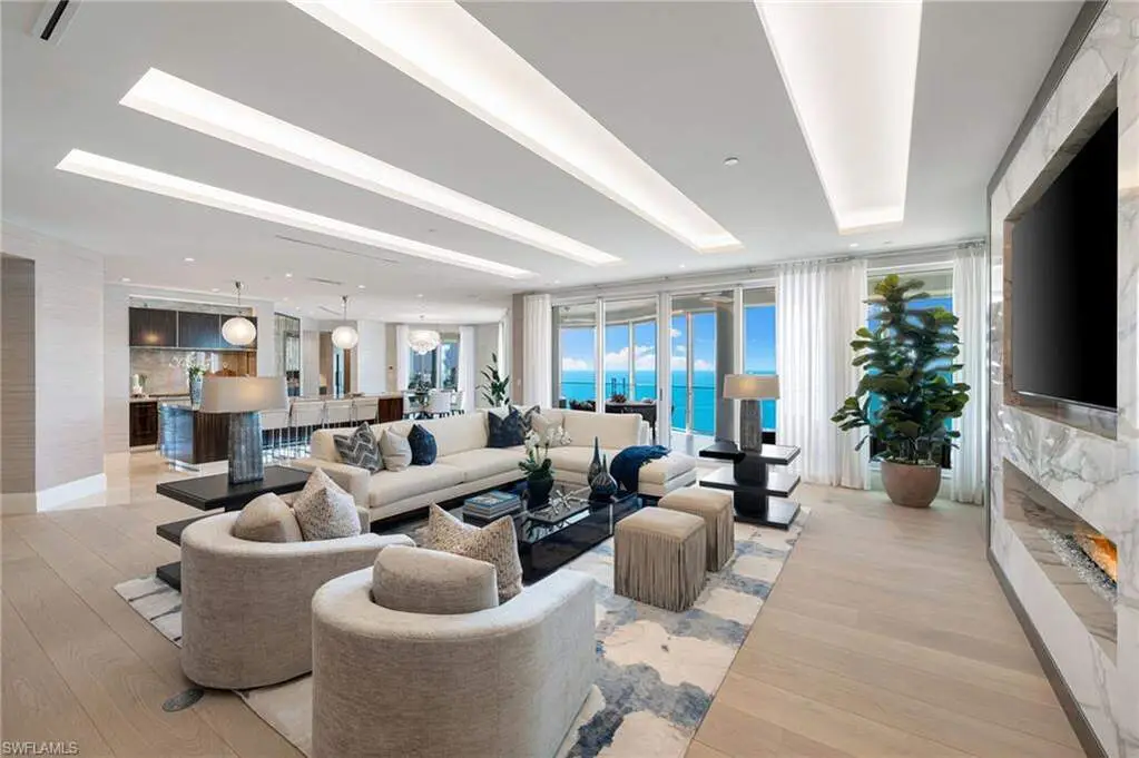 Since inception, residences at The Regent have been synonymous with luxury, yet no other offering has exhibited such quality, efficiency, and superior design as this. The "no expense spared" remastering of this gulf-front penthouse was a collaboration of the locally favored Borelli Construction and Calusa Bay Design, and personifies a sleek yet comfortable elegance that is rarely achieved. Encompassing over 12,100-plus square feet of living space, the residence includes multiple spacious living areas, an entertainment bar, five bedrooms, one of which hosts a kitchenette and is ideal for extended guests / live-in aide, five full and two half bathrooms, a richly outfitted study and private bar, a theater room, a club room equipped with a private fitness studio, nearly 1,700 square feet of outdoor terraces, as well as a rarely-found three-car garage. The truly gourmet kitchen was designed by renowned Mick DeGiulio and hosts fumed-eucalyptus custom cabinetry, brand-new top-tier gas appliances, a Galley sink, and precious stone countertops. Tucked away and offering the utmost in privacy, the master retreat exceeds the standards of luxury with its scenic sugar sand vistas, ample space for relaxation, as well as its truly luxurious His / Her bathrooms and dressing rooms. While it is impossible to name every enhancement in this comprehensive renovation, a few notable features include white oak flooring, a water-vapor fireplace, as well as luxurious wall coverings, and custom millwork throughout. Life at the Regent is a testament to refined living, as residents benefit from being only steps to the calm, turquoise waters of the Gulf of Mexico and Venetian Village, as well as only a mere few minutes from Waterside Shoppes and all that Downtown Naples has to offer.