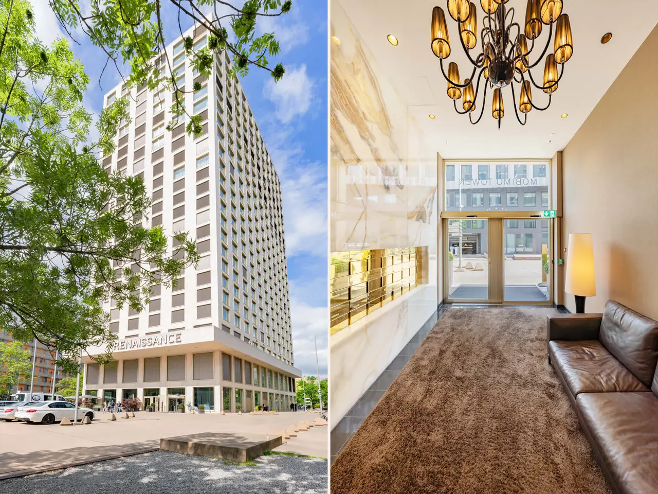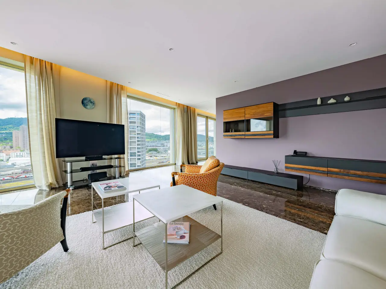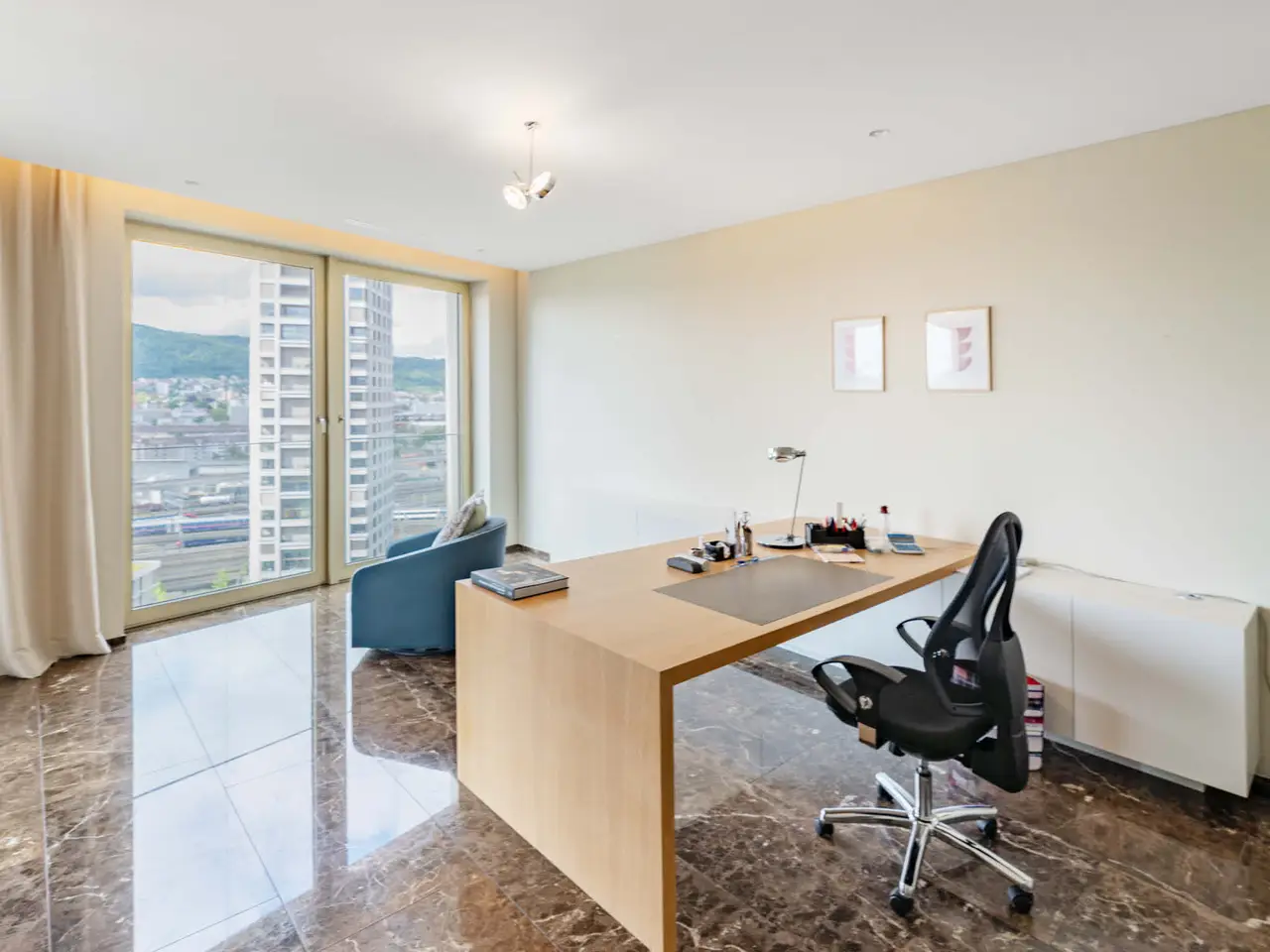 Elevated high above the vibrant cityscape, this extraordinary 5.5-room residence offers refined urban living in Zurich’s iconic Renaissance Tower. Located on the 15th floor, the approximately 300 m² apartment combines panoramic views, modern loft-like architecture, and an unbeatable city location. The expansive living area with floor-to-ceiling windows flows seamlessly into a sleek, designer kitchen—perfect for both entertaining and everyday luxury. Two beautifully appointed bedrooms each feature ensuite bathrooms and soaring ceilings, with one oriented southwest and the other facing east from the entry hall. A sliding door reveals a stylish study or library adjacent to the main living space. A spacious utility room completes the layout, offering comfort and practicality. Zurich’s Hardbrücke train station and tram line 4 are just steps away, providing direct access to the main station and city center. The nearby highway connects you swiftly to the lake, mountains, and Zurich Airport—just 20 minutes away. Designed by the acclaimed Swiss firm Diener & Diener and completed in 2011, the 81-meter Renaissance Tower blends private luxury living with the semi-public amenities of the Renaissance Tower Hotel, making it a bold architectural landmark in Zurich-West.