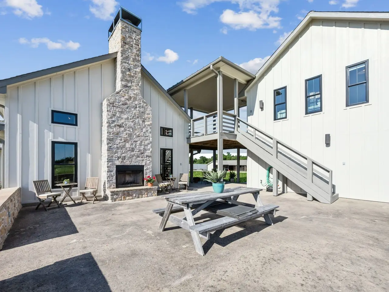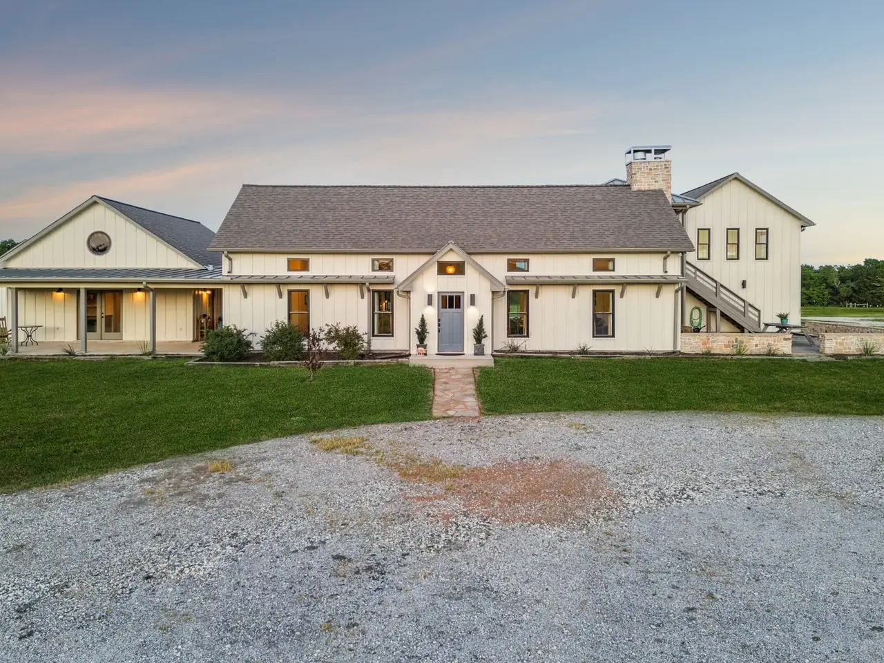 Welcome to Circle B Retreat, a rare 46-acre ag-exempt ranch just 50 miles from Dallas, perfectly planned to escape the city. Creatively designed with a nod to the Hill Country, this carefully planned ensemble of buildings is connected by an extensive wrap-around porch and courtyard encouraging easy indoor - outdoor flow. Inside, slate floors extend through the main living area with vaulted ceilings and a stone fireplace. The kitchen is built to host large gatherings with an expansive island and extra-large pantry for storage. A separate office with mini-split offers flexibility, while multiple dwellings make it a perfect multi-generational living setup. A working art studio offers lots of space for creative activities or could easily be converted to sleeping spaces. Enjoy expansive sky views, sunsets, stars, and reflections in the pond from the outdoor fireplace and open patio area. The private drive wraps around the home and barn providing unlimited parking. The sturdy, pole-built, 5-stall barn with tack and storage rooms, shelters horses and other animals, and - or a place to store ATVs or dirt bikes. Wooded spaces invite exploration, and the homes set-back location ensures privacy and safety for kids and animals. Evenings bring chirping frogs and the coyote chorus under the Texas stars. Welcome home!
