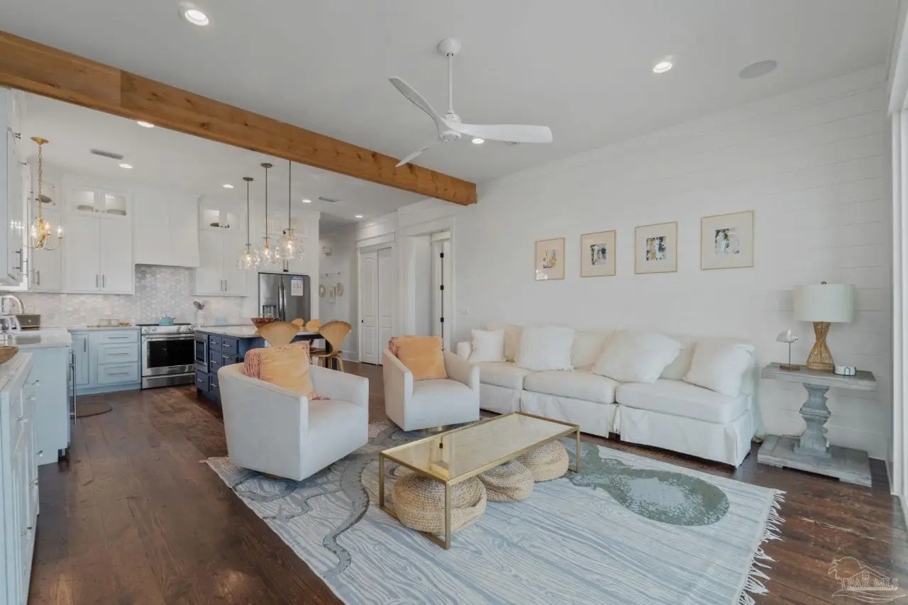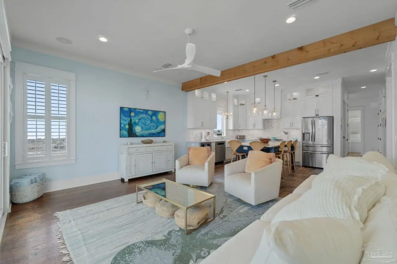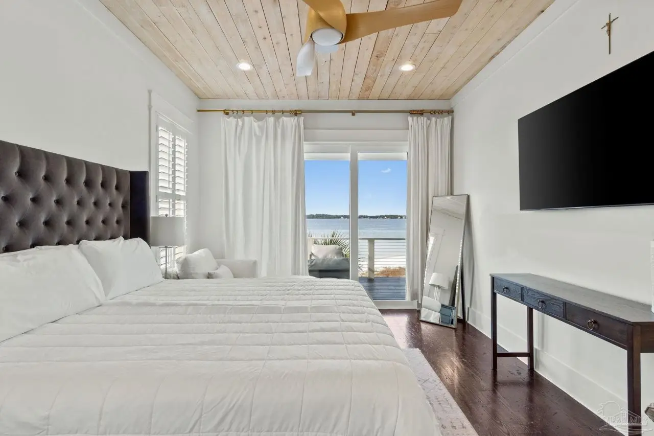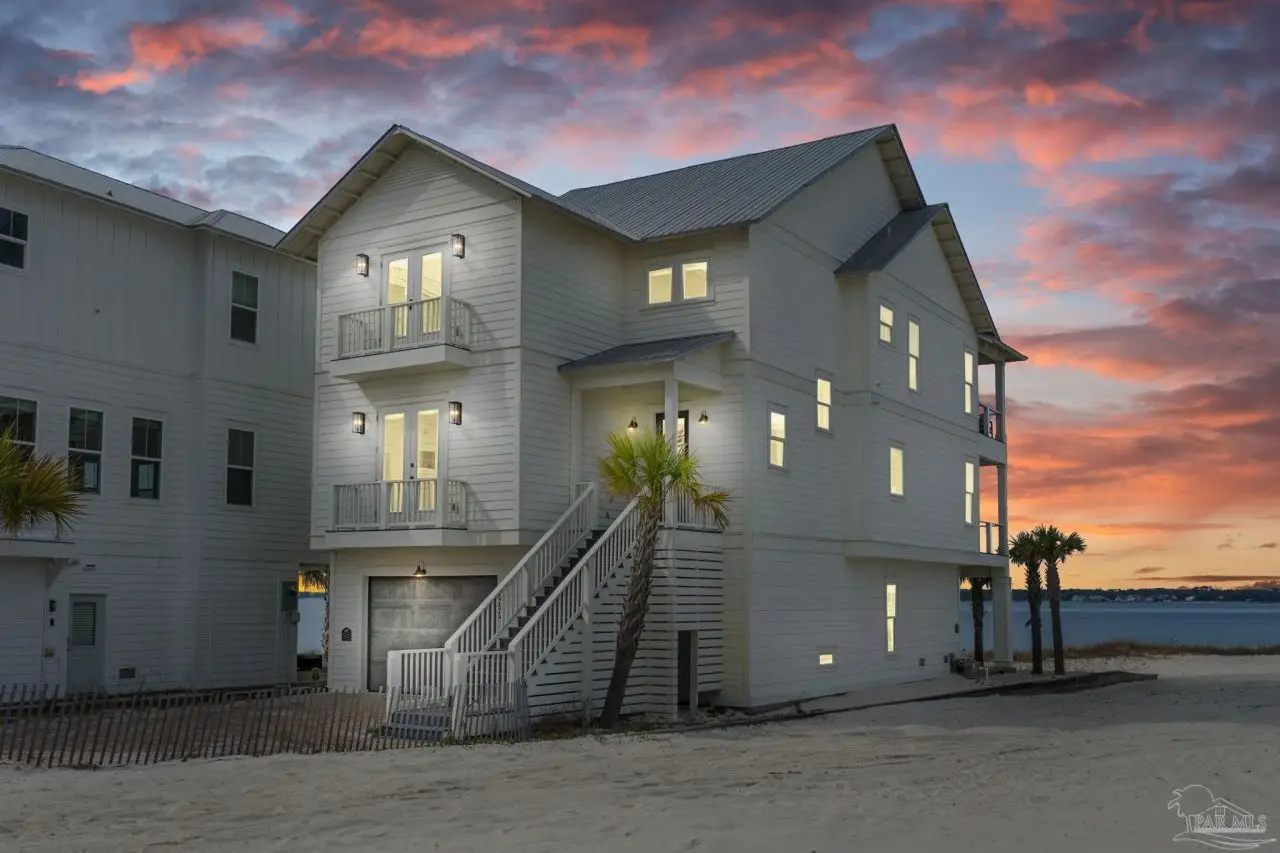 Experience the beauty of Sound-front living in this exceptional Navarre Beach retreat. Perfectly positioned within the private gated community of By the Sea, this custom-built home captures the best of coastal life with over 110 feet of direct waterfront, serene views across the Santa Rosa Sound, and effortless access to the Gulf-just a short stroll or golf cart ride away. Inside, soaring ceilings and wide-plank distressed pine floors create a warm, open feel that complements the coastal surroundings. The home features five bedrooms, each with its own ensuite bath, plus an additional half bath. Two spacious primary suites-one on the main floor and another upstairs-offer peaceful water views, soaking tubs, seamless glass showers, and double vanities. Large windows and glass doors flood the living spaces with natural light and open to covered balconies overlooking the Sound, creating a seamless flow between indoor and outdoor living. The kitchen and main living area are designed for gathering, featuring quartz and marble countertops, soft-close cabinetry, whitewashed cedar accents, and shiplap details. Enjoy the convenience of whole-home audio and video with WiFi control, custom window treatments, and refined lighting throughout. On the top floor, a flexible bonus room with a trundle bed adds extra sleeping space for guests, while a half bath in the garage provides added convenience for beach days. Sold fully furnished with high-end decor (with limited exclusions), the home is ready to enjoy from day one. Outside, flagstone pathways lead to your private stretch of Sound-front beach-perfect for kayaking, paddleboarding, or simply unwinding as the sun sets over the water. The By the Sea community also offers a pool and hot tub for owners and guests. Thoughtfully designed and impeccably maintained, 1464 Seaside Circle is more than a home-it's a rare opportunity to experience the laid-back luxury and natural beauty that define life on Navarre Beach.