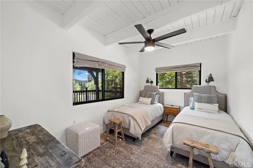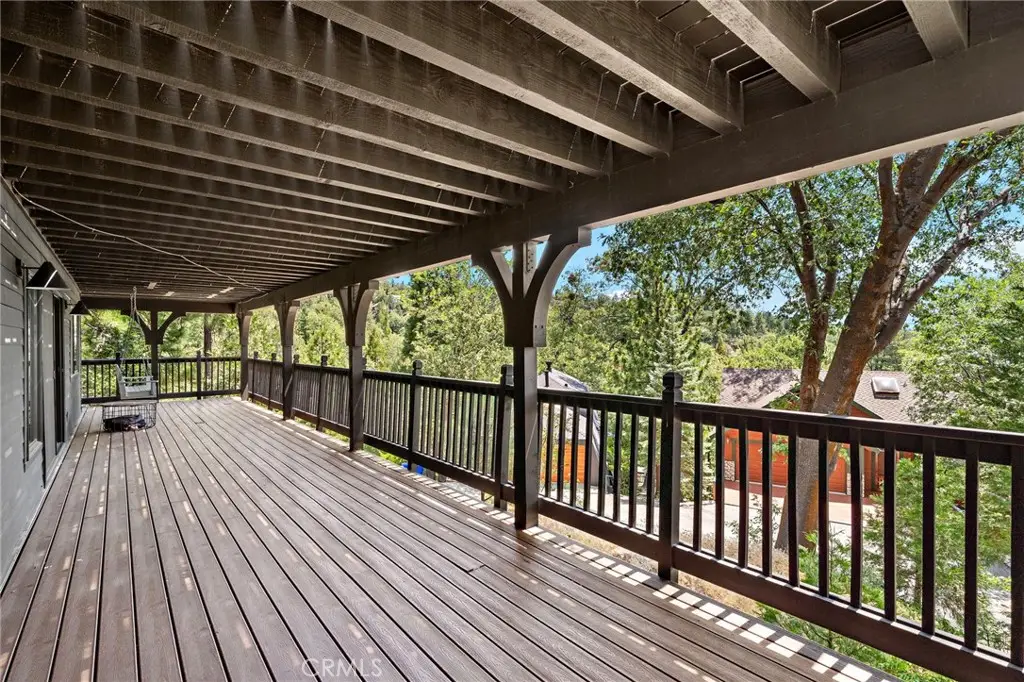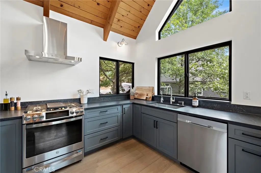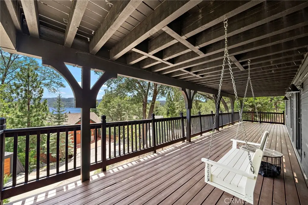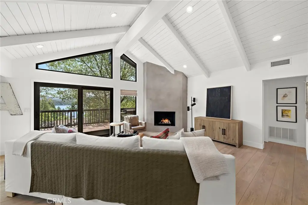 This stunning 4-bedroom, 3.5-bath mountain retreat combines modern upgrades with timeless lodge-style charm, offering captivating lake views from nearly every window. Thoughtfully remodeled in 2020-2021, the home features a bright open floor plan perfect for both comfort and entertaining. The main level showcases a dramatic great room with vaulted ceilings, expansive windows, recessed lighting, and a cozy gas fireplace that opens to a large entertainer's deck. The remodeled kitchen is a chef's dream with stainless steel appliances including a refrigerator, shaker-style cabinetry, pantry with pullout shelves, granite counters, peninsula with seating, and large windows framing the view. Two primary suites with spa-inspired baths--one on the main level and another on the lower level--provide privacy and flexibility, while two additional bedrooms and a spacious family room with a second fireplace and walk-out access to the lower deck with a swinging bench create the perfect retreat for family and guests. Outdoor living shines with two expansive decks crafted in durable Trek decking, ideal for gatherings, dining, or simply enjoying the mountain air and lake views. Additional highlights include dual HVAC and A/C systems with split thermostats, vinyl flooring throughout, inside laundry with washer and dryer, a finished pull-through two-car garage with automatic doors on both sides, and ample guest parking. Sold mostly furnished for a true move-in ready experience, this home is ideally located just above the trails of North Bay Cove with lake rights, peaceful morning walks, sunset strolls, and easy access off Bay Road with level parking. Just minutes from Blue Jay and Lake Arrowhead Village shops and dining, this exceptional property offers the perfect blend of modern amenities, mountain appeal, and lake lifestyle--whether as a primary residence, weekend escape. The home is also licensed as an active Airbnb!