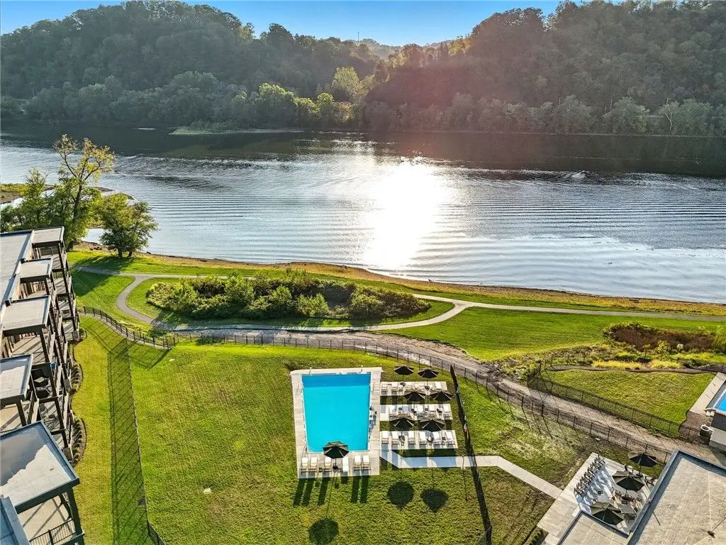 Discover The Brooks, a new resort-style condominium building along the Allegheny River within The River's Edge community. The Brooks condominiums promise an unmatched living experience with breathtaking views. This larger 2nd floor unit, spanning 1,471 sq ft, is located in the north wing of the building. Enjoy breathtaking water vistas from the living area & bedrooms, enhanced by tall windows & spacious covered balcony. A beautifully designed kitchen awaits, showcasing an oversized island, stainless appliances & sleek quartz countertops. Adjacent is a versatile den, perfect as eat-in kitchen or home office. Resort-style amenities include a large lobby with water views, meeting rooms, fitness center, & outdoor infinity pool. Indoor garage parking or private garage available for add'l cost. HOA fee includes water, sewer, trash, cable, internet, building maint/insurance. Property not yet assessed. Renderings/pictures shown for illustration purposes only/photos may not be of unit listed.