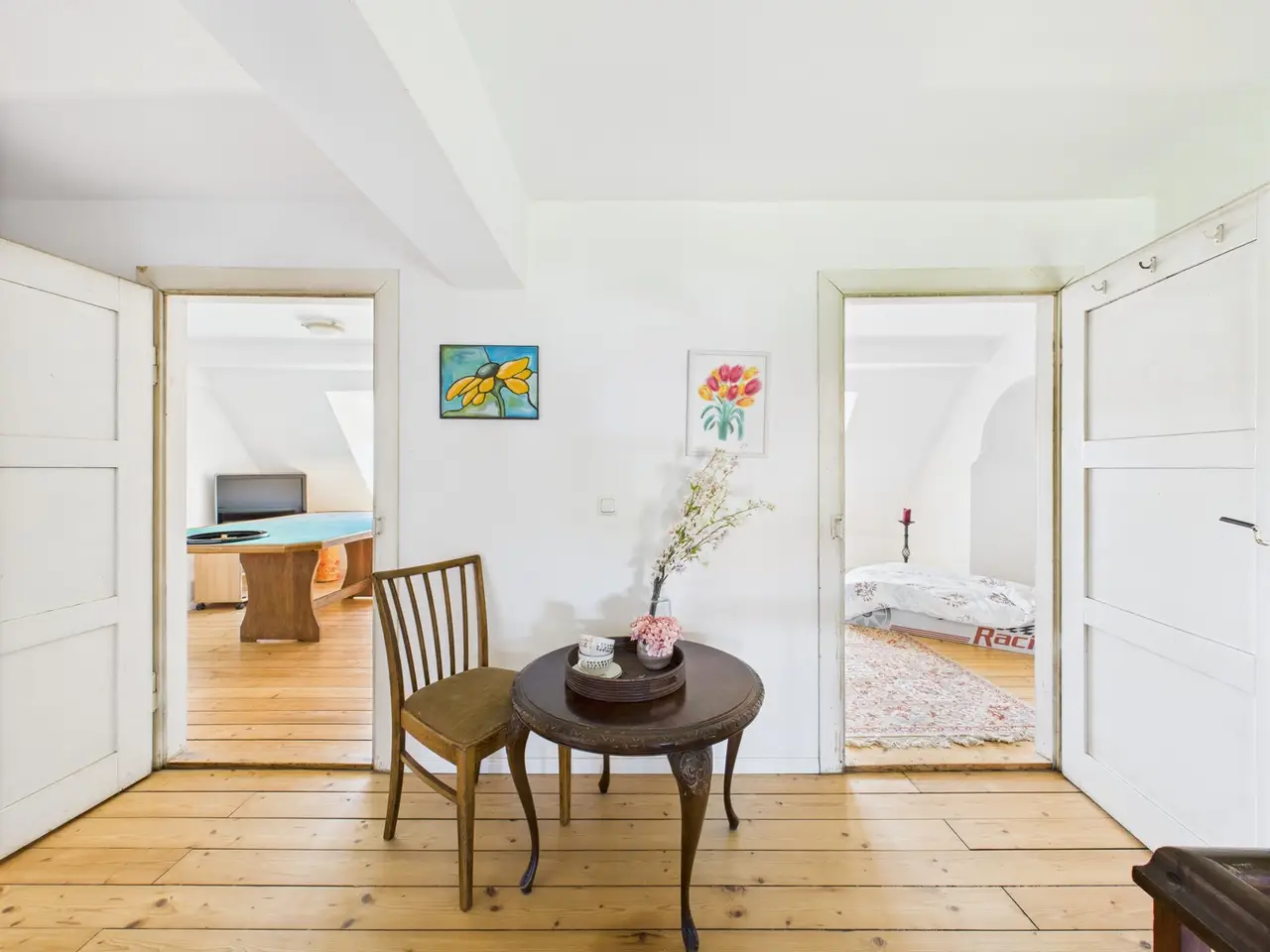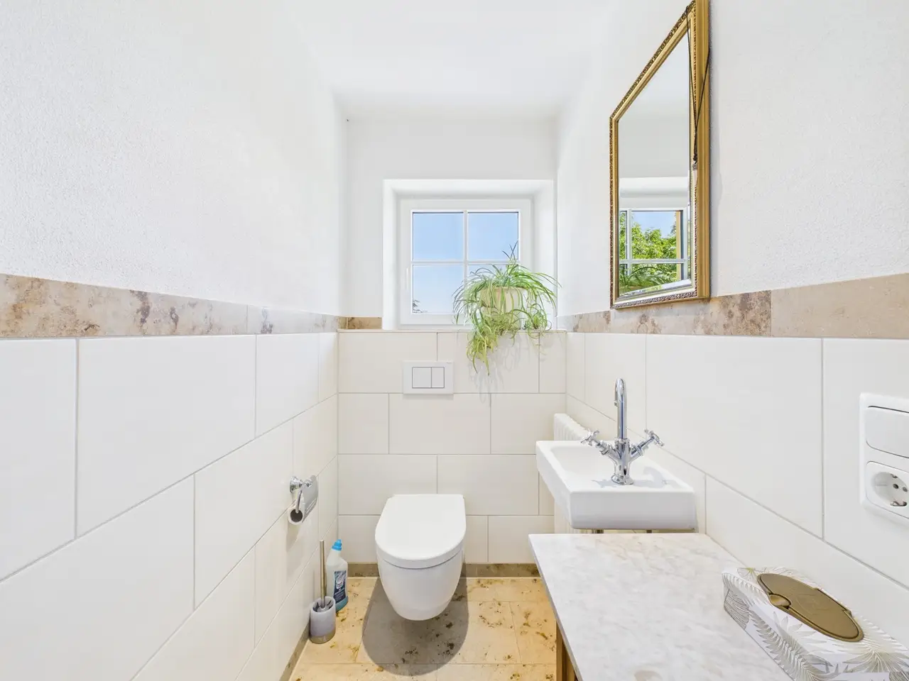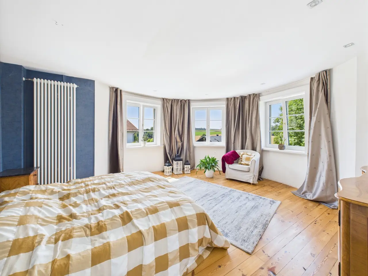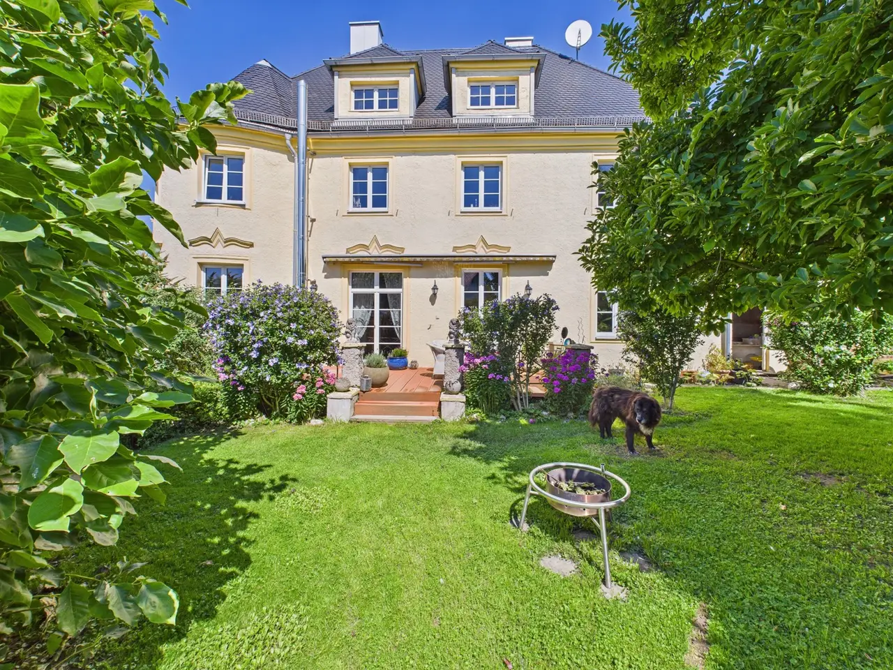 Stately country villa in neoclassical style - stylishly renovated in a prime location in Altfraunhofen This country villa built in 1920 in the style of late historicism with neoclassical accents sits enthroned in an elevated location. It combines prestigious architecture with rural charm and has been extensively modernized in recent years - including a new heating system, completely renewed electrical and plumbing installations, high-quality bathrooms with Jura marble and underfloor heating, new windows and patio doors, a fireplace in the dining room and an elaborate roof renovation with plain tile and copper details (2016). With around 300 m² of living space and a total of 11 spacious rooms - including six bedrooms - the villa offers plenty of room for family, guests and individual usage concepts. High ceilings, large windows and historic details such as stucco elements, wooden staircases and the striking tower lend the rooms a special atmosphere. The property stands on a 1,650 m² plot with a park-like garden, fruit trees and a historic fountain. The south-facing terrace offers a magnificent view of the hilly landscape of Lower Bavaria and the church of St. Nikolaus. Shopping facilities, school, sports facilities and local amenities are all within walking distance. Thanks to the successful combination of historic building fabric and contemporary technology, the villa is in very good condition and has plenty of potential for further enhancement. A rare offer for lovers of sophisticated architecture - solidly built for generations.