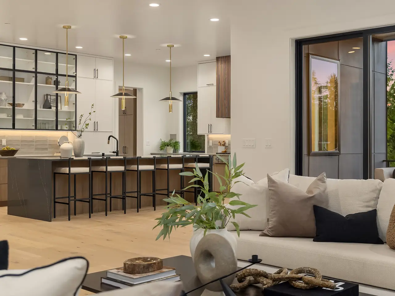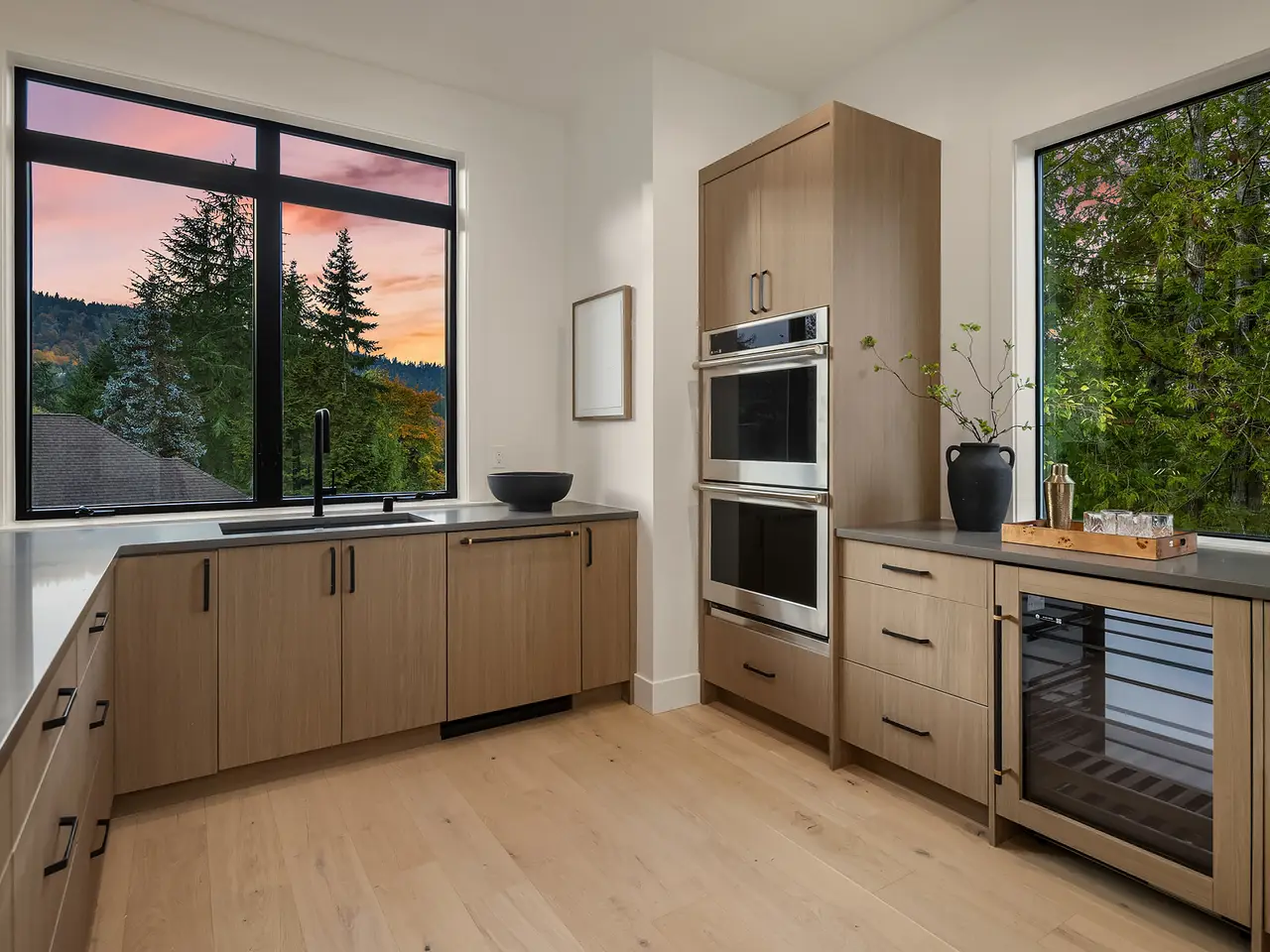 Perched above Issaquah's lush tree line w westerly views, this newly built Veristone Homes balances modern elegance w natural tranquility. A grand entry opens to sunlit interiors illuminating wide-plank oak floors. The chefs kitchen impresses w an 11ft double waterfall island, Hestan range w pot filler, Monogram appliances, & full scullery, inviting gatherings & quiet moments alike. Downstairs, herringbone floors flow through the spacious lower level featuring media room & studio w 2nd kitchen & private, no-stairs entry - ideal for guests or extended living. Upstairs, 4 ensuites include a serene primary suite w heated floors, soaking tub, & windows framing peaceful green vistas. Turf yard, covered patio, & refined finishes complete this home.