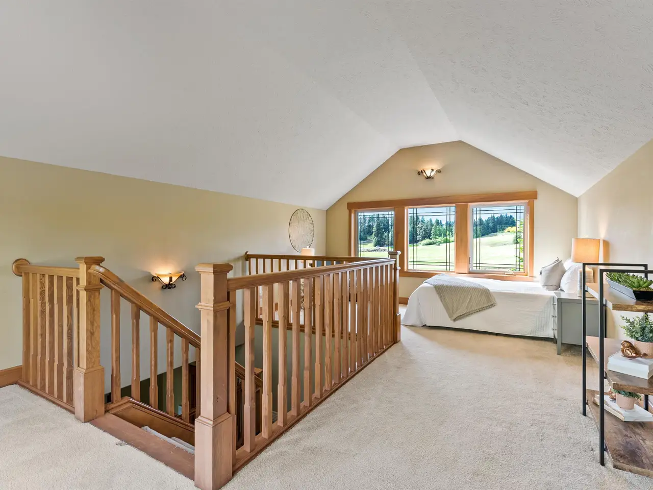 This stunning modern craftsman home, set on 10 acres, offers a unique blend of craftsmanship and contemporary design, creating a stylish yet functional living space while preserving the charm of the original style. An abundance of windows throughout showcases beautiful pastoral views, complemented by professional landscaping, fresh exterior paint, & breathtaking sunsets. The cozy atmosphere is enhanced by a striking stone fireplace, hardwood floors, exposed beams, and natural wood trim. The living, dining, and kitchen areas flow together seamlessly. The culinary kitchen boasts high-end stainless steel appliances, stone counters, two sinks, and a gas range. Main floor living includes a primary suite with doors leading to a patio, and an expansive laundry room offers ample storage. Upstairs, a versatile loft serves as an extra bedroom or reading nook, while the daylight lower level features two additional bedrooms, rec room, bar area and more storage. This remarkable home is a must-see!!