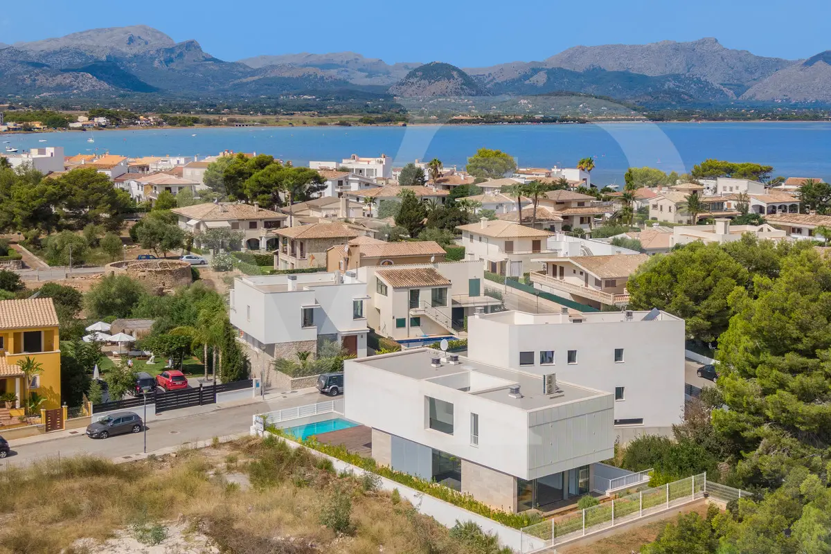 Beautiful newly completed villa just steps from the beach in Alcudia. This bright luxury villa built with high quality materials and distributed over two floors, has three spacious bedrooms, three bathrooms one en suite, living/dining room, a magnificent open plan kitchen with modern appliances. From the kitchen you can access a terrace with fantastic mountain views. The whole house has large windows allowing the entry of natural light and of course panoramic views. The villa offers a large first floor terrace leading to a large and magnificent swimming pool, a private two car garage and a laundry room. The location of this fantastic villa allows you to enjoy the beach and the historic center of Alcudia, where the market in Mallorca's own style is just a few minutes away. The old town of Alcudia, one of the most attractive historical points in Mallorca. The 14th-century medieval city walls, the ruins of the ancient Roman city of Pollentia and the church of Sant Jaume attract hundreds of visitors every year interested in architecture, culture and history. Just a few kilometers away is the port of Alcudia, which offers a wide range of entertainment and gastronomy. Apart from its natural beauty, Alcudia offers a good location close to the paradisiacal beaches of Alcudia Bay and Pollensa and easy access to the motorway that connects the whole island. Contact us for more information or to view this modern villa in an exclusive area in the northwest of Mallorca.