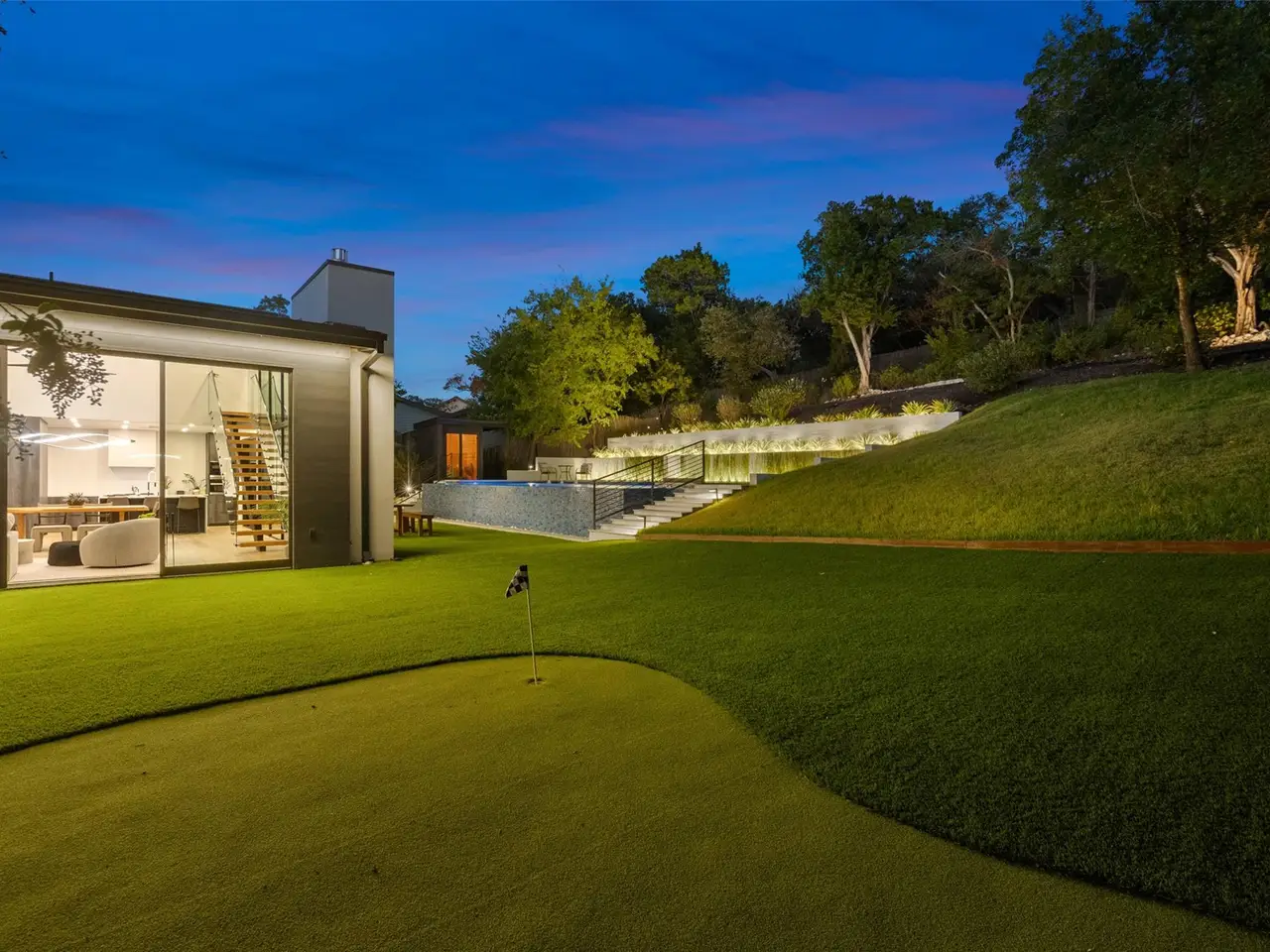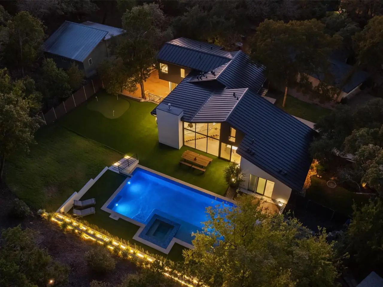 Welcome to 2503 Dip Cove in Barton Hills, a modern forever home designed by Garwood Architecture and built by Petrini Custom Homes. Set on a quiet cul-de-sac on nearly half an acre, this five-bedroom, four full and two half-bath residence offers 3,510 square feet of refined living with an emphasis on craftsmanship and enduring style.Inside, wide-plank French white oak floors and floor-to-ceiling windows create bright, airy interiors. A sculptural staircase anchors the open-concept living area, while 10' Western sliding doors extend the main level to a generous outdoor terrace. The chef's kitchen features a waterfall-edge quartz island, Miele appliances, and an integrated wine fridge, which flows seamlessly into the dining and living spaces centered around a 72" travertine-wrapped modern fireplace.The primary suite is privately located in its own wing and offers a spa-inspired bath with Kallista touchscreen controls, dual rainfall showers, and a sculptural soaking tub. A boutique-style wardrobe and independent climate system enhance comfort. Four additional bedrooms include integrated storage, with two ensuite baths. A two-story guest apartment provides a secondary primary suite, prep kitchen, living area, and private entrance.Outdoors, resort-style amenities include a 20' x 40' infinity pool, integrated spa, eight-seat sauna, outdoor shower, and putting green. A pre-designed 1,100-sqft cabana offers potential for a gym, studio, or entertainment pavilion. Terraced landscaping and LED lighting elevate the setting after sunset.Additional features include an integrated Apple Home system, home water filtration, three HVAC units with dehumidifiers, dual tankless water heaters, and a 12-zone irrigation system. Private, quiet, and meticulously crafted, this home offers modern luxury in one of Austin's most desirable neighborhoods.