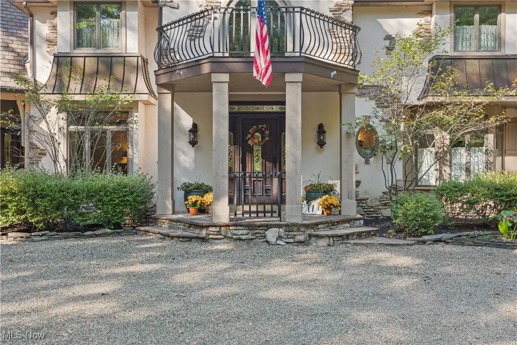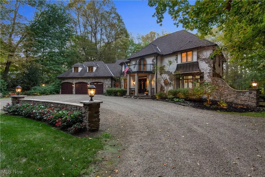 Private location on a 2-acre cul-de-sac overlooking the scenic 23-mile perimeter of the LaDue Reservoir. Stone pillars are the starting point to a long driveway leading to a grand rounded portico entrance w/beautifully crafted wrought iron railing. Open foyer with soaring ceilings, adjacent to a formal dining room featuring a bow window + built-in window seat. Great room w/floor-to-ceiling windows, beamed ceilings, gas fireplace w/mantle and hearth! Great design w/4 bedrooms including 2 owner's suites + 5 baths. The chef's kitchen showcasing premium cabinetry, high-end appliances, and a professional chef's sink flows seamlessly into the breakfast area and hearth room w/stone fireplace. Additional living spaces include a cigar porch w/peaked ceilings + tile flooring, detailed office, and a fabulous, functional laundry room with a separate front entrance, barn doors, additional closet space, and a walk-in pantry. The 2nd-floor primary suite offers custom stonework and 3rd-floor dressing suite (22'x15')! This private retreat is accessed by a spiral staircase featuring custom built-ins, a walk-in closet, and 2 wardrobe closets. An additional upstairs bedroom includes 2 walk-in closets +full bath. 2nd-floor great room, w/skylights + a separate staircase to the kitchen, offers flexible space! The newly finished lower level is styled like a luxury sports bar, w/full wet bar, large rec area, and a full bath. Perfect for friends/family or game-day fun. Amazing outdoor living w/continuous water views + private walkway to the reservoir. Backyard features include a Trex composite deck w/an electronic retractable awning, an expansive patio, a built-in outdoor kitchen, a tranquil pond with a waterfall, an outdoor shower, and a storage shed. The entire property is enhanced by LED landscape lighting, including along the driveway for a dramatic approach to your front door. This one-of-a-kind home combines timeless craftsmanship, luxurious amenities, an opportunity not to be missed.