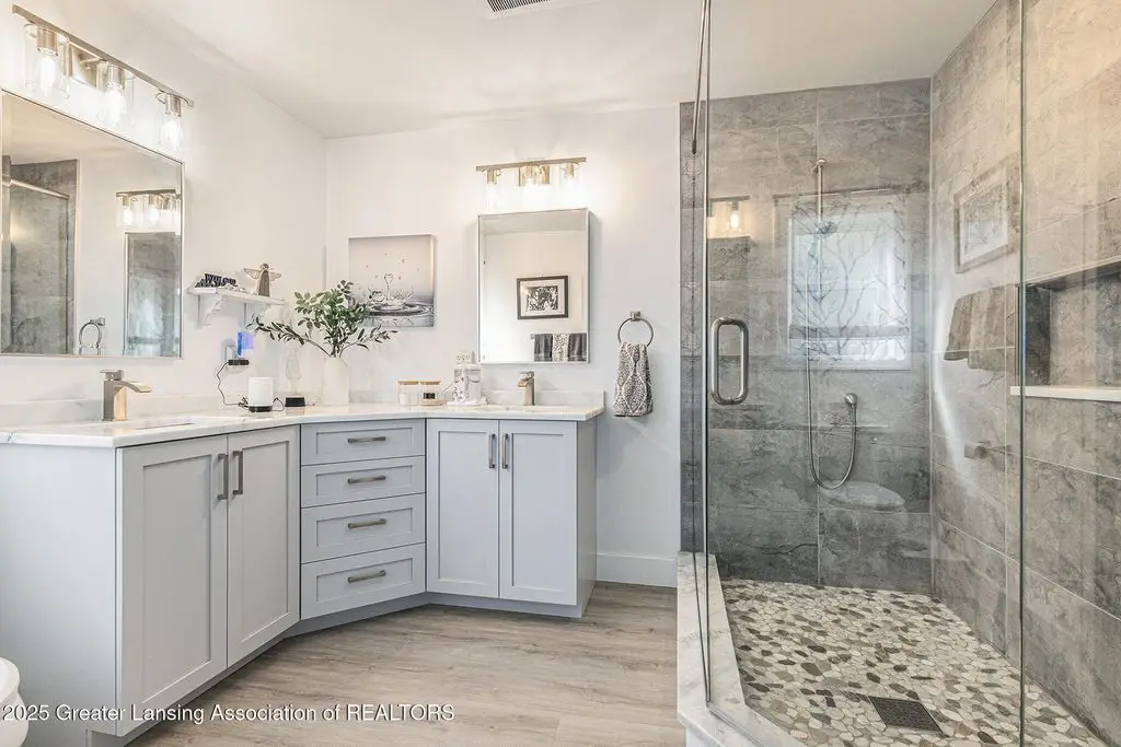 If you've been searching for a one-of-a-kind home on the Huron chain of lakes, this is it! The entire 3,216 square foot two-story home has been professionally and tastefully updated on the exterior and interior. Features five bedrooms, 3.5 bathrooms, main floor primary suite is massive with soaring ceilings, a cozy built in fireplace surrounded by shelves, a huge custom built WI closet, large bathroom w/dual sinks, tiled walk-in shower and granite countertops, complete with door to your own private covered concrete patio with recessed lighting and ceiling fan. 2nd floor features remodeled primary suite with fireplace, updated bath with dual sinks, tiled walk-in shower, closet and additional laundry area. Three additional spacious bedrooms and a full bath are located on the second level. Gorgeous kitchen with SS appliances and quartz countertops that wraps around to the spacious open dining/living room area facing the lake and new Trex deck with recessed lighting and ceiling fans. Three-car detached finished, heated garage with stairs to a loft for extra storage. All new concrete drive, (lots of parking) patio space and sidewalk to dock/lake. Within the last few years this home has had all new flooring throughout, a new roof (house and garage), new siding, new two-zoned unit furnace and air conditioning, new water heater, too many upgrades to mention. Basically a brand new home with 49 feet of lake frontage, an outdoor shower convenient for rinsing yourself or your pets after a lake day/swim. Also includes generator that is wired to run the entire house.
