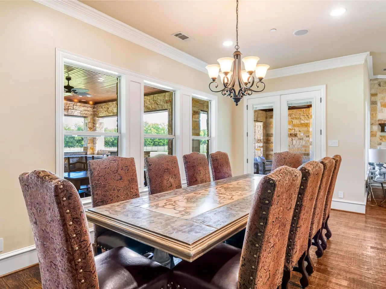 Nestled on nearly 13 acres in the highly sought-after Tanner Creek community of Sunnyvale, this one-of-a-kind custom estate offers over 5,500 sq. ft. of refined country living. Designed with both comfort and entertainment in mind, the home centers around a gourmet chef’s kitchen that seamlessly connects to the expansive living and dining areas, as well as a media room and game roomperfect spaces for family gatherings or casual entertaining. From these rooms, step out onto the oversized covered patio, complete with an outdoor kitchen, ideal for alfresco dining or game-day gatherings. Step outside to take in serene backyard views from the oversized covered patio, complete with an outdoor kitchen, ideal for alfresco dining or game-day gatherings. The main level showcases a spacious owner's suite alongside a guest bedroom with a private bath, plus a dedicated office off the entryway. Additional highlights on the first floor include a wine cellar and a fully vented storm shelter for peace of mind. Upstairs, you'll find a large second living area with built-in dual desks, two guest bedrooms each with ensuite baths, and a flexible bonus room that can serve as an optional fifth bedroom. Every detail of this home was crafted for style and function, making it truly a rare find in Tanner Creek.