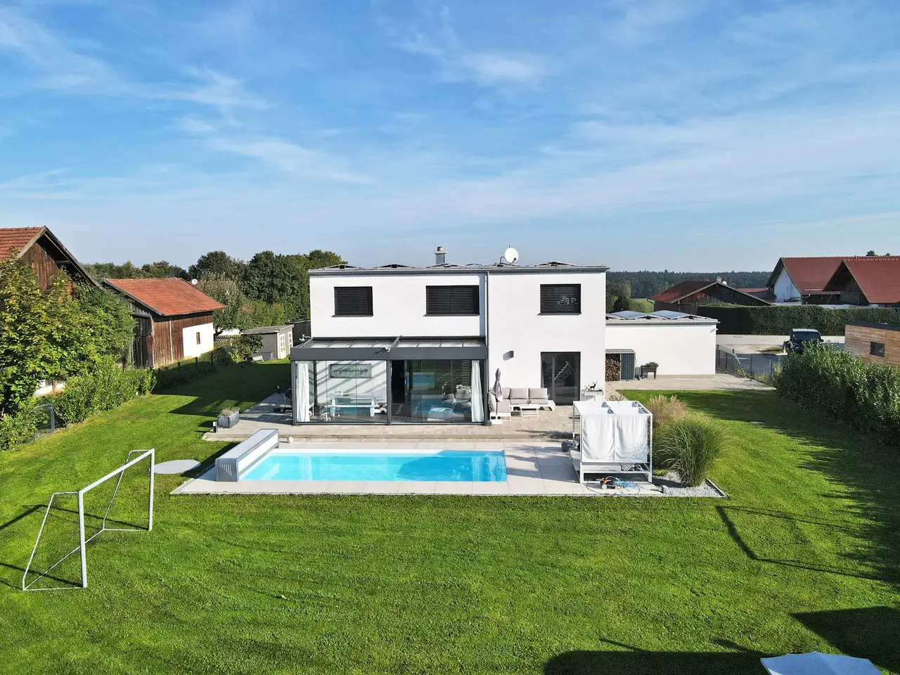 This modern and lovingly designed property, built in 2015, stands on a spacious plot of 1,570 m², idyllically located on the outskirts of a village in the municipality of Adlkofen. The detached house with an impressive living space of 230 m² not only offers a panoramic view of the picturesque hilly landscape, but also plenty of space and options for a comfortable and contemporary lifestyle. As soon as you enter the house, the open design is noticeable: the spacious living area with an open kitchen invites you to spend sociable evenings. A special highlight is the elegant fireplace, which provides cozy warmth. The high-quality materials such as large-format tiles and elegant oak parquet flooring create a stylish atmosphere, which is complemented by loving furnishing elements such as the cozy seating window. The winter garden offers a wonderful transition from inside to outside and lets a lot of light into the house. Outside, a wonderful saltwater pool awaits you, perfect for warm summer days, as well as a charming garden playhouse for the little ones. Technically, the house is state-of-the-art: a powerful photovoltaic system with 28.12 kWp covers a large part of the energy requirement, while a modern heat pump keeps heating costs low. In addition, a decalcification system ensures soft water throughout the house. The aluminum-plastic windows with Venetian blinds and shutters offer optimal protection and comfort. A special wellness highlight is the sauna in the bathroom, which allows you to relax luxuriously in your own four walls. The video intercom system, the electric entrance gate and the double garage underline the features of the house. This spacious and perfectly planned single-family home offers modern living comfort at the highest level - ideal for families who value plenty of space, a view and a lovingly designed environment.