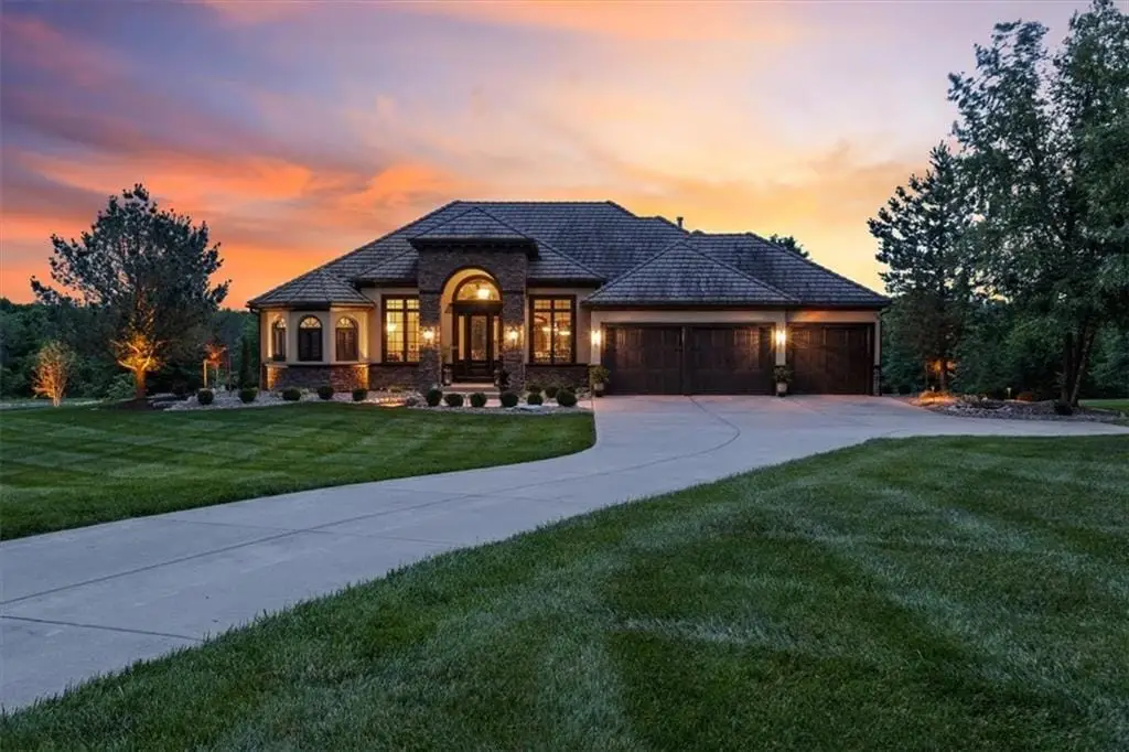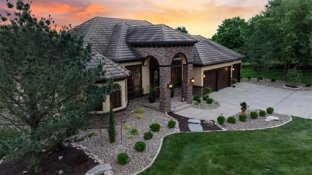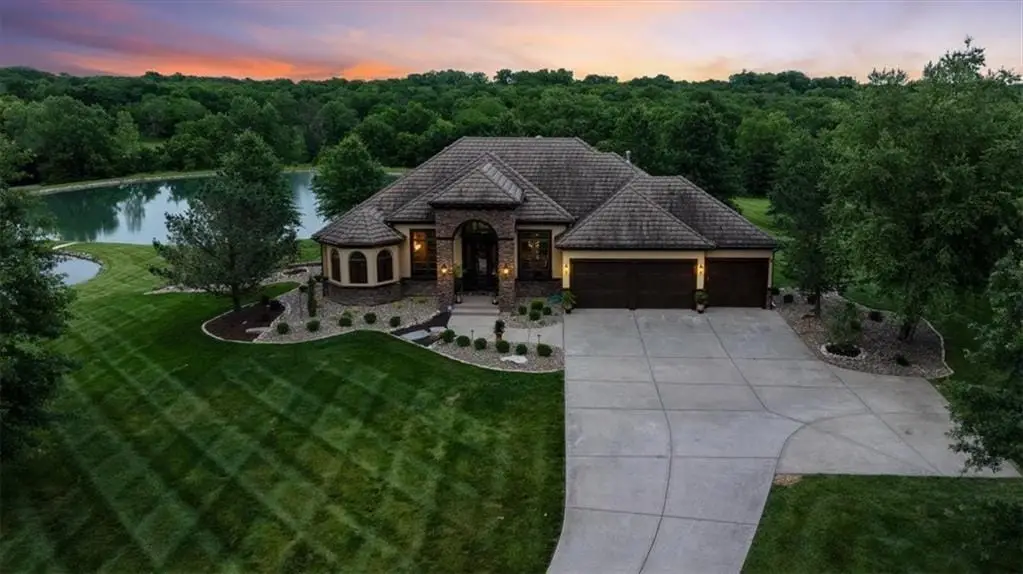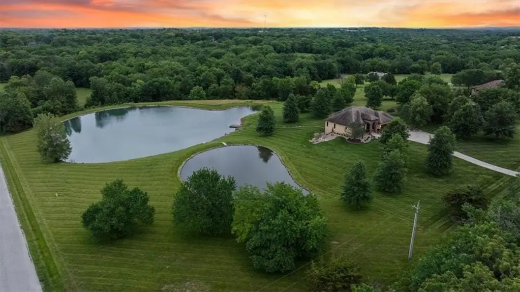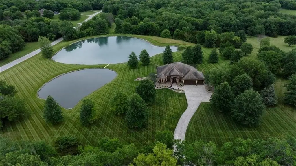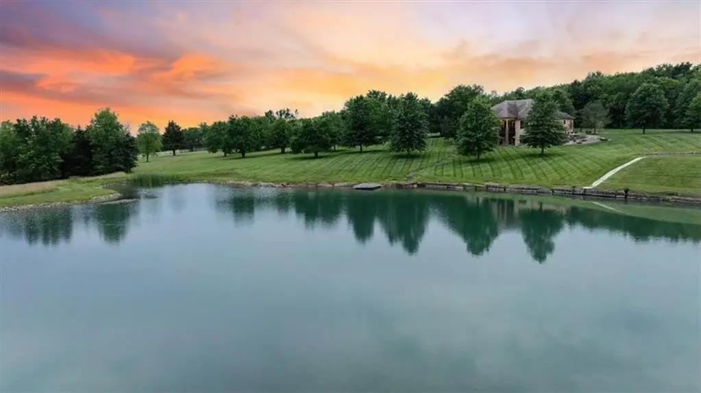 Tucked away in a serene, park-like setting, this stunning custom-built estate offers a rare blend of privacy, luxury, and breathtaking natural beauty. Perfectly positioned on just over 10 acres, the home overlooks picturesque, fully stocked ponds surrounded by mature trees, meticulously maintained grounds, and a backdrop of nature. A covered deck with an outdoor fireplace provides the perfect place to unwind while enjoying the peaceful views, and expansive windows throughout the home bring the beauty of the outdoors in. Inside, you'll find high-end finishes, an open-concept layout ideal for entertaining, and a walkout lower level that leads to a private patio and dock. The thoughtfully designed layout allows plenty of space to add a pool, garden, or additional outdoor features to truly make this your own. A detached 36x48 outbuilding provides the perfect space for a workshop, storage, or hobby area. Whether you're sipping coffee on the deck, casting a line from the dock, or enjoying an evening under the stars, this property is designed for both relaxation and entertainment. With convenient access to Raymore, Lees Summit, and Kansas City, it offers the best of both worlds - secluded countryside living with city amenities just minutes away. This one-of-a-kind property is a rare opportunity - schedule your private tour today!