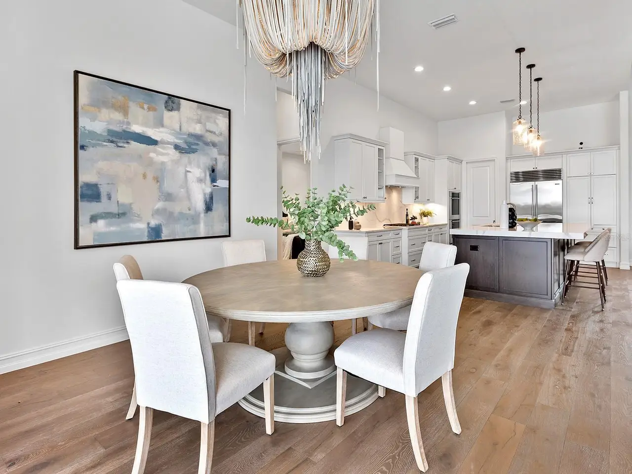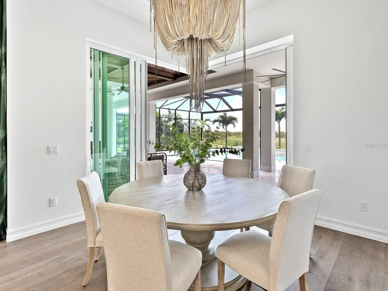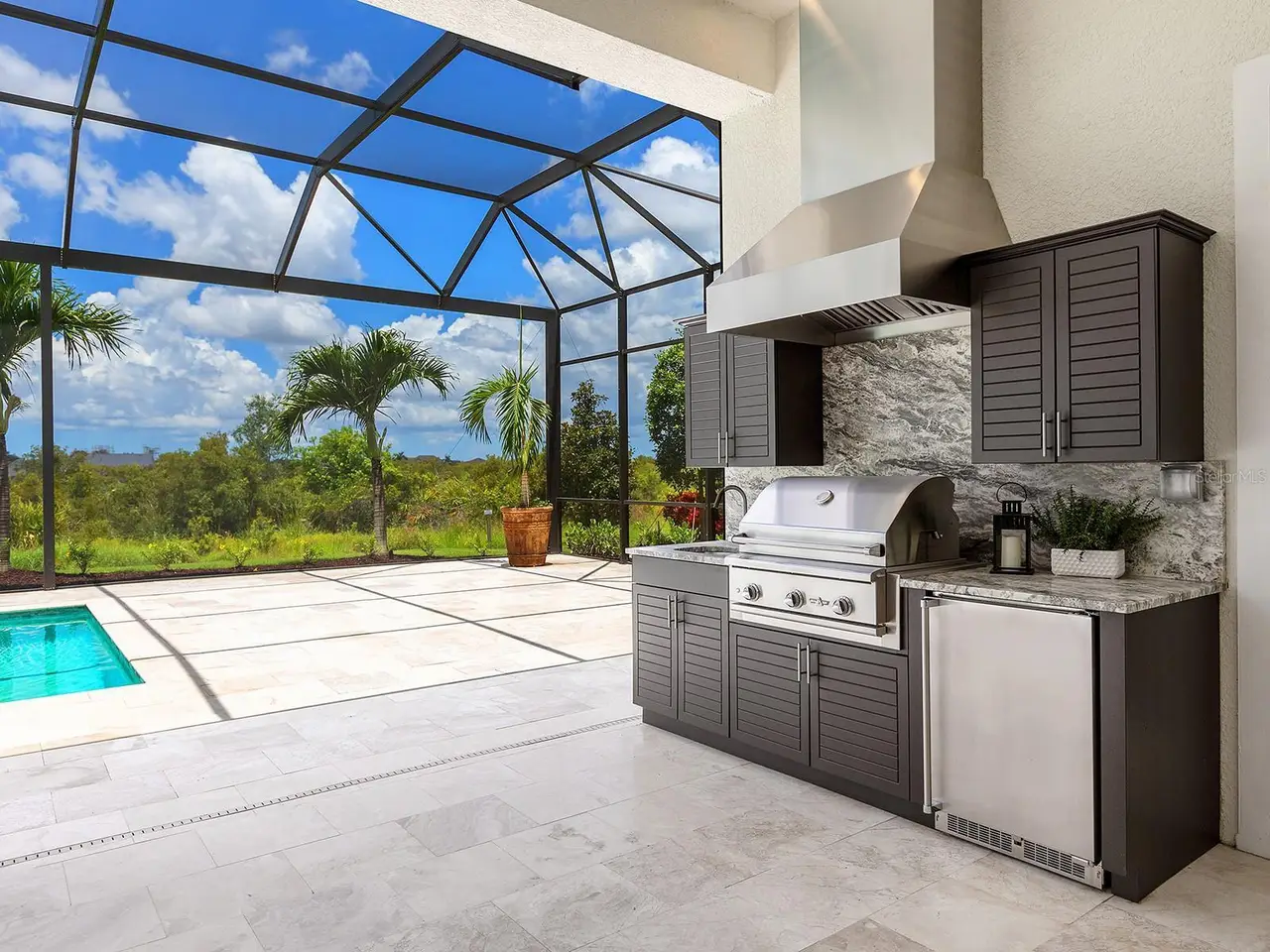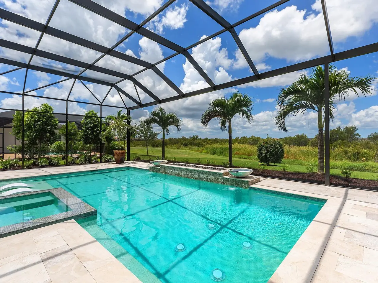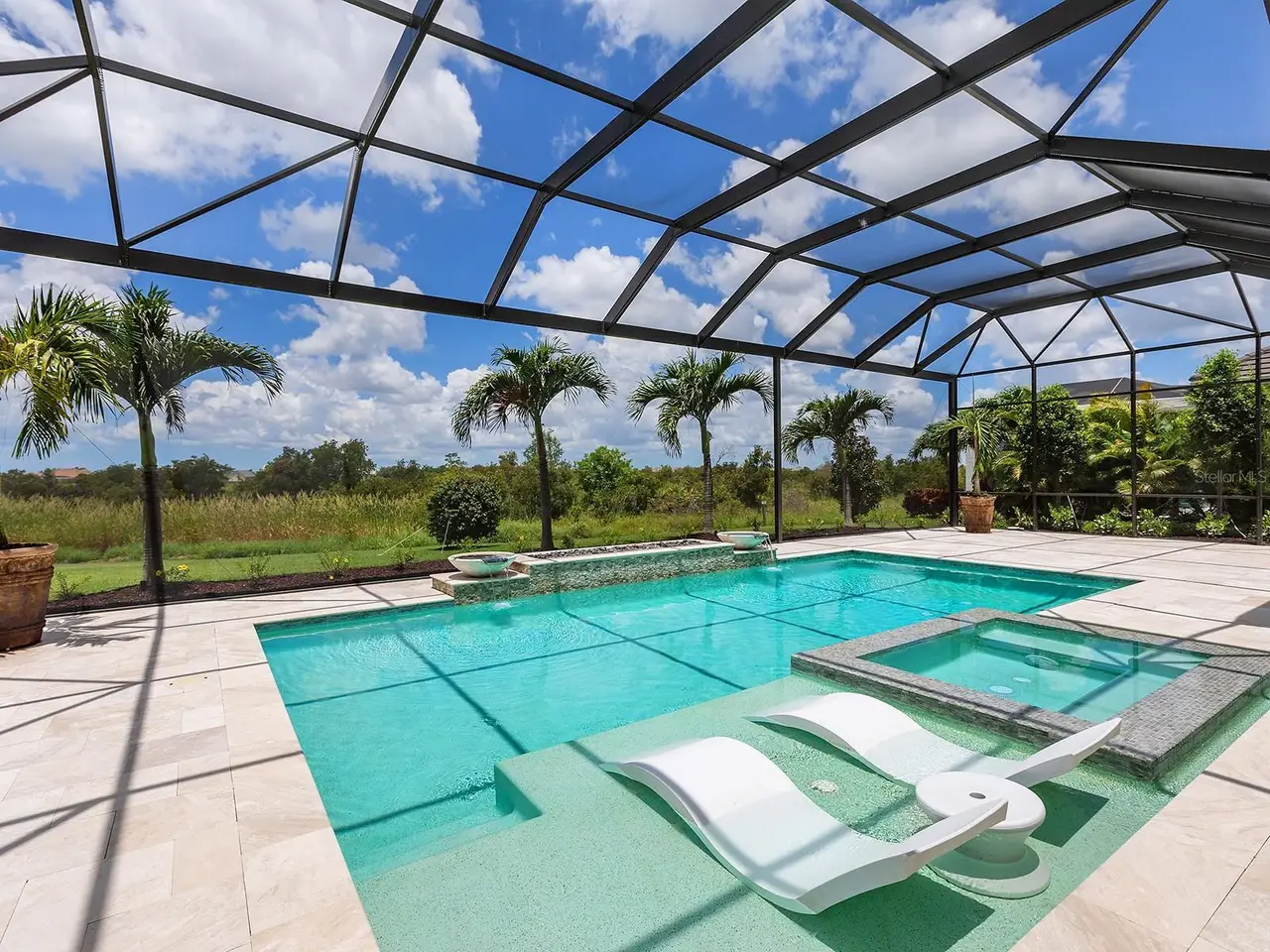 Prestigious living in The Lake Club of Lakewood Ranch is within reach! Nestled among towering palms and verdant landscaping is this completely, custom Madison II home built by Stock Luxury Homes in 2021. The lush Florida conservation wetland provides a beautiful backdrop for the western rear exposure with spectacular sunsets. This entire residence had every detail carefully hand-selected to evoke a luxurious and comforting residence including oak hardwood flooring, cove crown molding and custom ceilings, high-end designer light fixtures, plantation shutters, and top-of-the-line functional selections in every room. Superior details and a sense of security continue with high-end construction, impact doors and windows throughout, additional remote control hurricane screens on the lanai, 22kw whole-house generator, surge protector, and whole-house water filtration system. The central great room is the heart of the home with custom coffered ceiling, custom built-in display shelving and entertainment cabinetry, and a full wall of impact sliding glass doors to the lanai. Enjoy a modern open-concept floor plan that flows effortlessly throughout the living areas and out onto the marble paver lanai. With beautiful and private views of the preserve, the lanai offers a serene space to gather around the gas fireplace and under wood ceilings, take in the views from panoramic screen enclosure, or dine by the outdoor kitchen. The custom saltwater pool offers a sunken 360-edge spa, sunshelf, Nebula lights built into the screen enclosure to create a starlight effect above, and a built-in fire bar feature plus water bowls – you won’t find another lanai like this at any other home. The luxurious lifestyle continues indoors with the executive kitchen that is expertly outfitted with high-end appliances including Wolf gas cooktop, Miele dishwasher, Sub-Zero refrigerator, and dual Wolf wall ovens. The custom cabinetry offers complimentary two-tone colors, thick quartz counters with full-height backsplash, pots and pans drawers, additional integrated pantry tower, and a walk-in pantry with shelving. The adjacent dining room has custom ceilings, disappearing corner impact sliders, and a breathtaking designer chandelier. Work from home in the study equipped with dual built-in desks with glass tops, file drawers, and display shelving. The primary suite sparkles with designer wallpaper, custom ceilings, impact French doors to the lanai, and impressive dual walk-in closets with custom closet systems. The spa-like bathroom gives you a five-star experience with dual vanities, make-up space, linen closet storage tower, modern freestanding soaking tub, and walk-in shower with rain shower head. Guests will find similar comfort in two guest suites with their own private en-suite bathrooms. The spacious rear bonus room is ideal for gathering with a custom dry bar with quartz counters, mirrored backsplash, display cabinetry, and two Sub-Zero wine refrigerators. There is also a dedicated full pool bathroom with walk-in shower and exterior lanai access, plus a guest powder bathroom. A functional laundry room, mudroom-style garage entry, spacious 3-car garage and oversized driveway complete this impressive home. You’ll also enjoy a lower property tax bill than other homes because the debt portion of the CDD Lakewood Ranch Stewardship has been PAID OFF. The Lake Club is an exclusive premier, gated community with a Grande Clubhouse, restaurant, pool, tennis, pickleball and more.