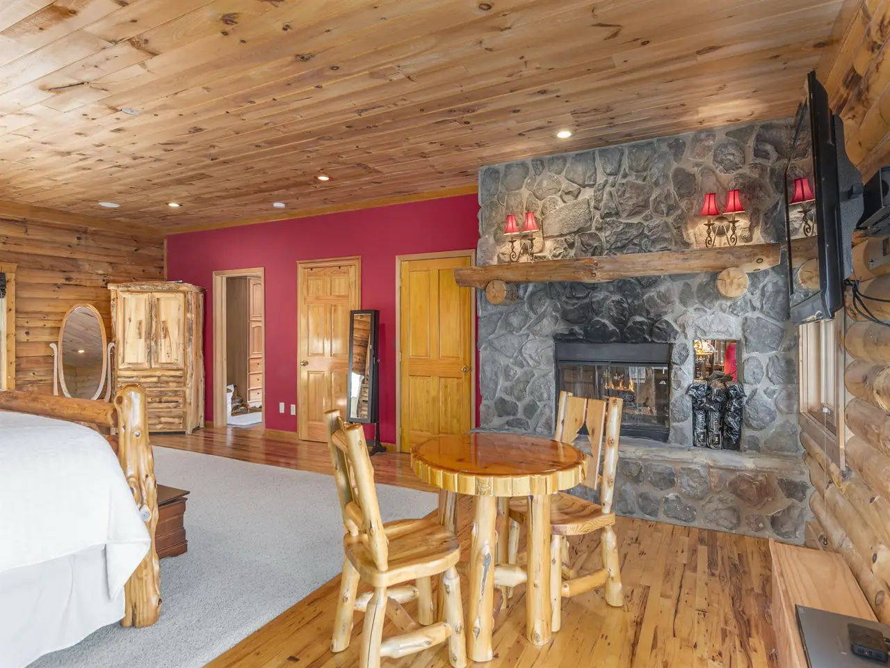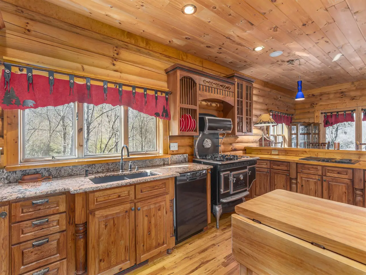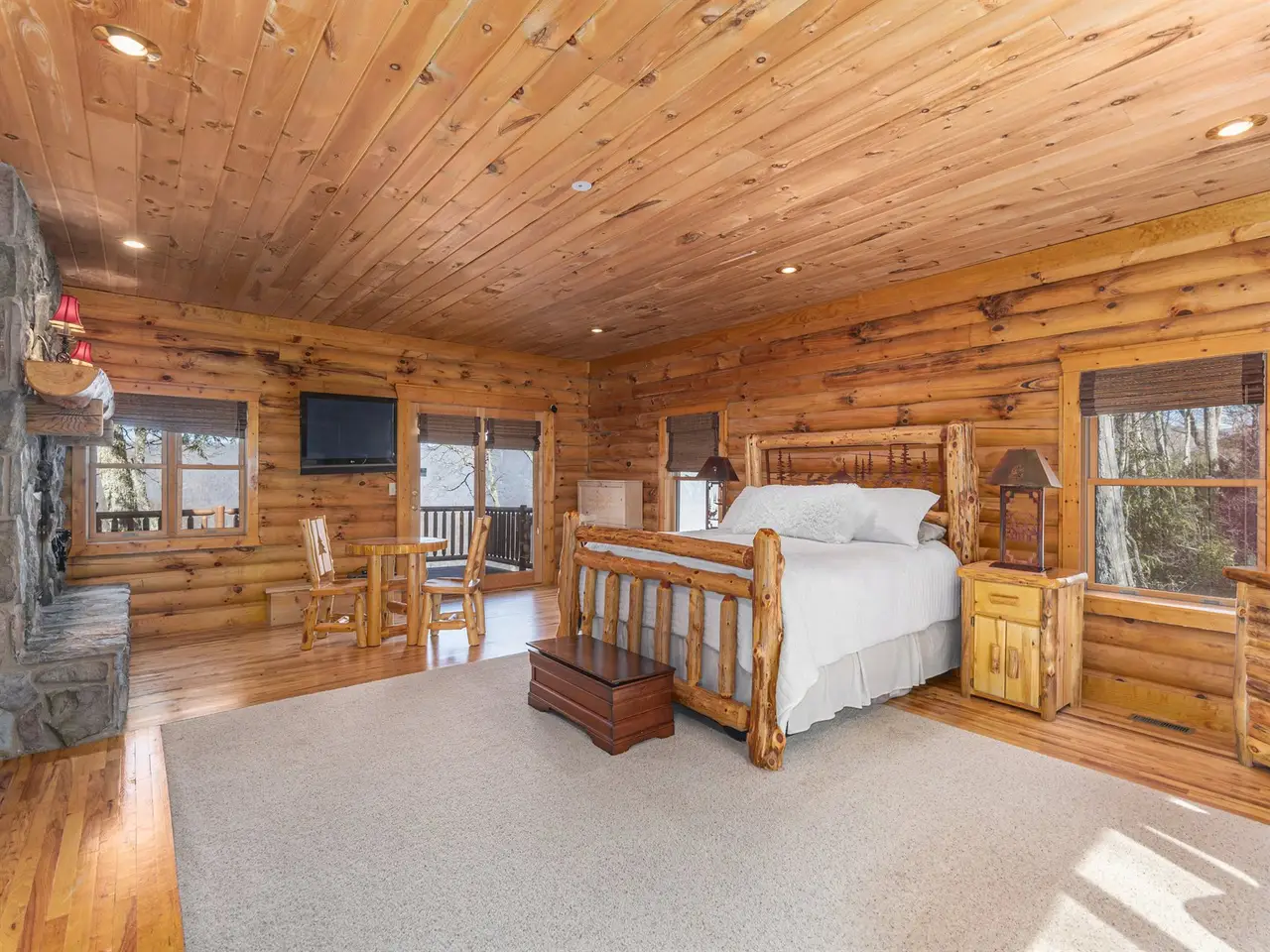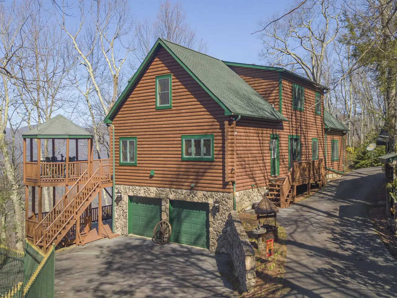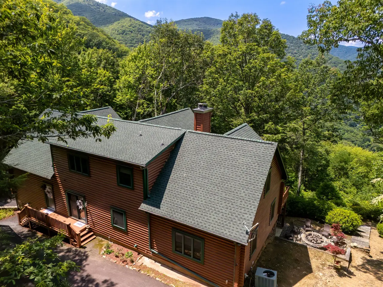 Experience the pinnacle of Maggie Valley mtn living in this custom lodge-like log home, nestled at a breathtaking 4200' elevation. Set on over 3 acres, the home offers privacy and inspiring views. Inside, discover high-end custom finishes throughout. The expansive open-plan living area features a stunning stone fireplace, and the large windows frame awe-inspiring views. Huge primary bedroom suite on the main also enjoys a fireside setting, along with direct access to the sprawling deck. Upstairs you'll find two more bedrooms, bathroom, and a large loft overlooking the 2-story great room. Ideal for entertaining, the lower level boasts a den with pool table/fireplace/bar, bonus rooms, garage, and abundant storage space. Outside, you'll find ample deck space to enjoy the cool summer temps. Newly stained/sealed exterior and new roof ensures lasting beauty/durability. Below the home is a small site-built cabin, perfect as a playhouse or hobby space. 600 sq ft detached studio/workshop is ideal for creative/practical pursuits. Paved roads lead to the gated property. Adjoining included parcel makes a great buffer... or an additional build site with big views! This gated property has so much to offer, and it is your opportunity to own a piece of Blue Ridge paradise.