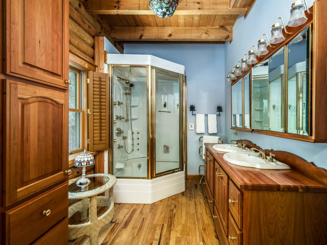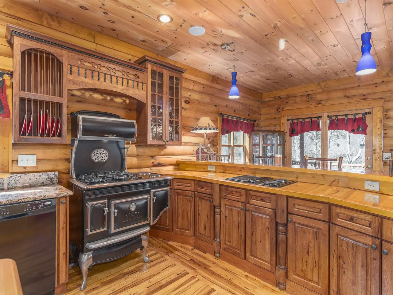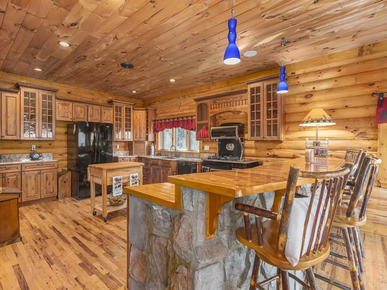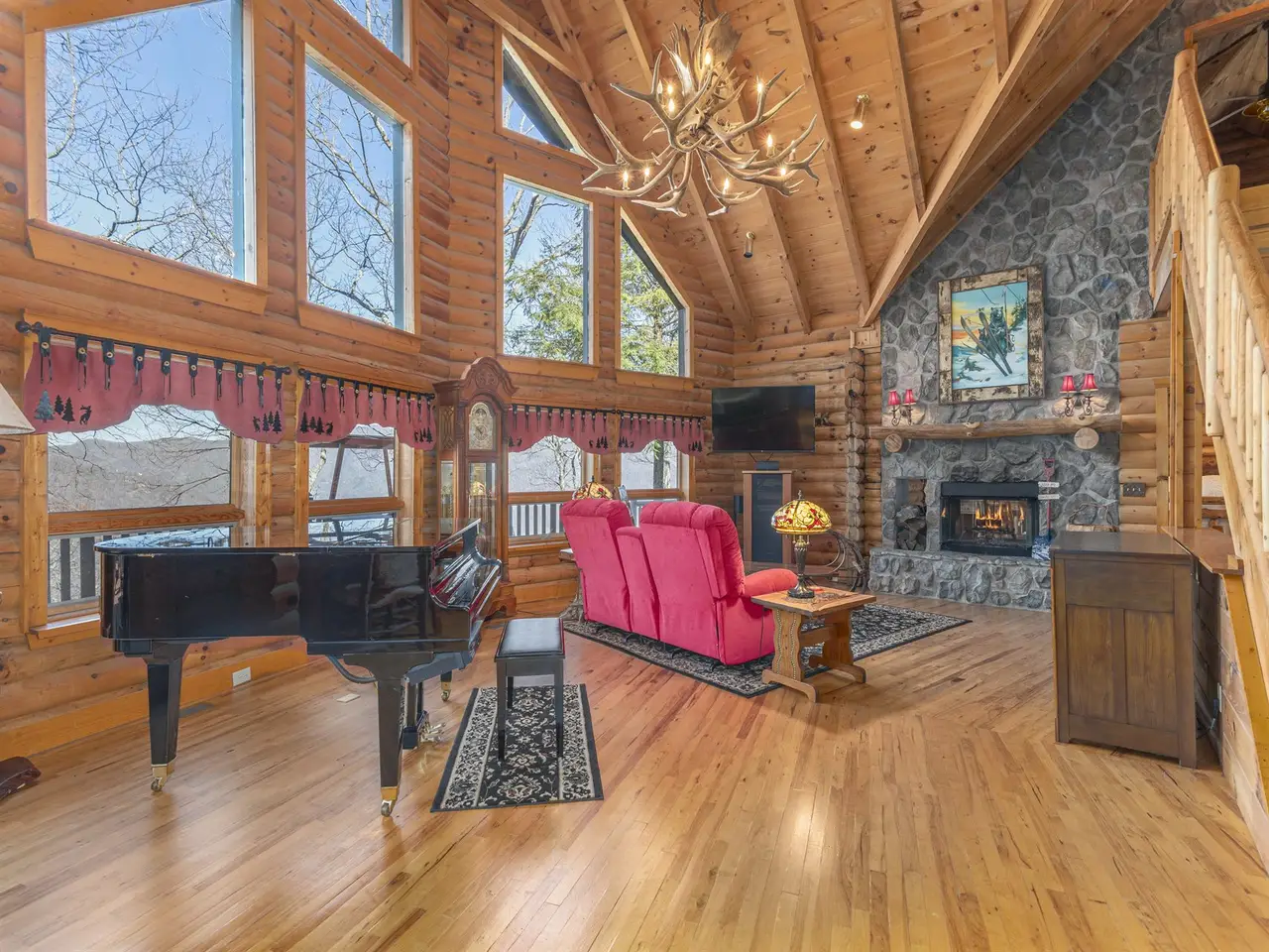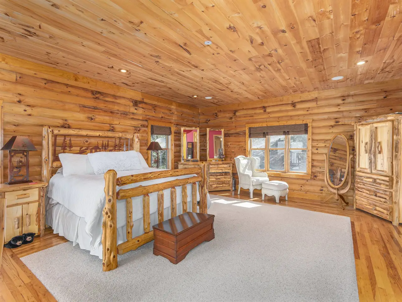 Experience the pinnacle of Maggie Valley mtn living in this custom lodge-like log home, nestled at a breathtaking 4200' elevation. Set on over 3 acres, the home offers privacy and inspiring views. Inside, discover high-end custom finishes throughout. The expansive open-plan living area features a stunning stone fireplace, and the large windows frame awe-inspiring views. Huge primary bedroom suite on the main also enjoys a fireside setting, along with direct access to the sprawling deck. Upstairs you'll find two more bedrooms, bathroom, and a large loft overlooking the 2-story great room. Ideal for entertaining, the lower level boasts a den with pool table/fireplace/bar, bonus rooms, garage, and abundant storage space. Outside, you'll find ample deck space to enjoy the cool summer temps. Newly stained/sealed exterior and new roof ensures lasting beauty/durability. Below the home is a small site-built cabin, perfect as a playhouse or hobby space. 600 sq ft detached studio/workshop is ideal for creative/practical pursuits. Paved roads lead to the gated property. Adjoining included parcel makes a great buffer... or an additional build site with big views! This gated property has so much to offer, and it is your opportunity to own a piece of Blue Ridge paradise.