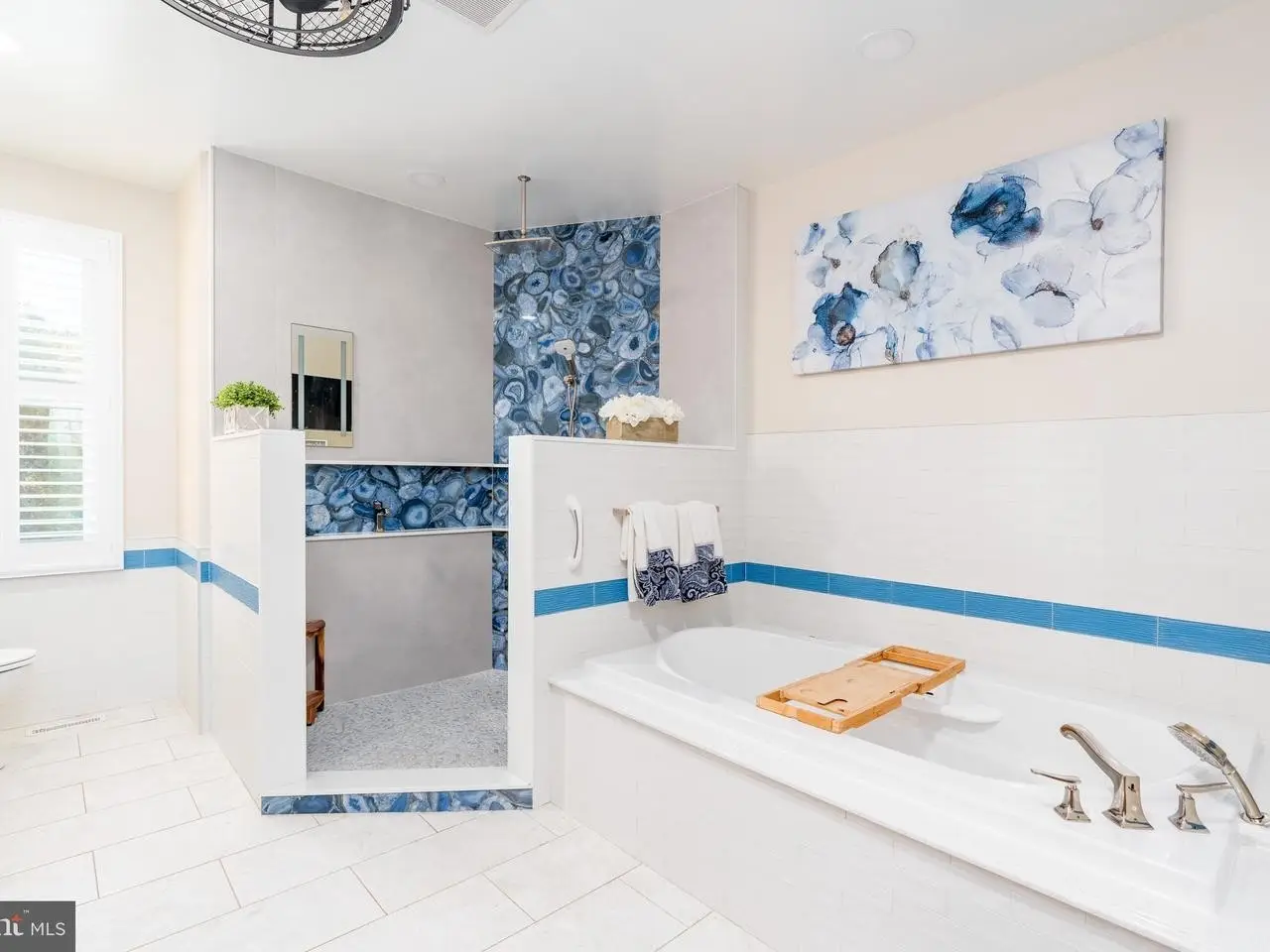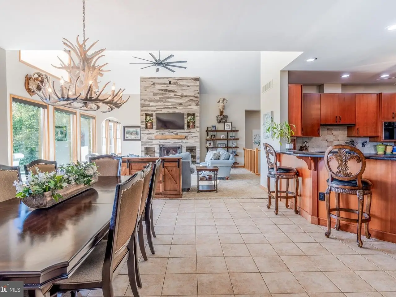 • Wood-burning fireplace with custom tiled floor-to-ceiling