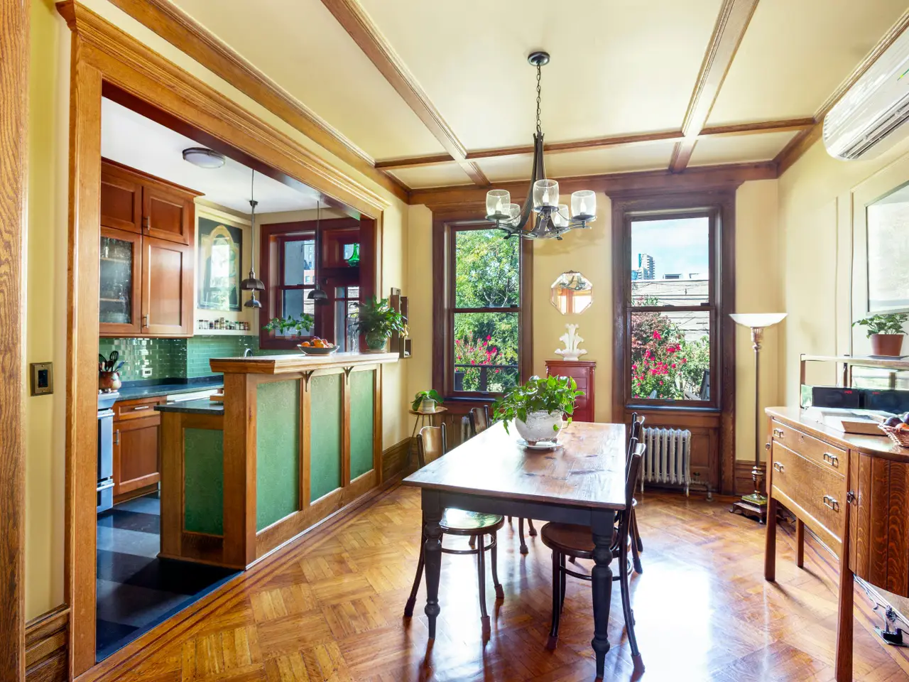 Gorgeous inside and out, this 1910 single-family townhouse is a winner! Lovingly cared for by the current owners over the last 20 years, it's small wonder that it has been included in the PLG House Tour. With its pretty limestone facade, the 1910 home is nestled on a leafy, tree-lined block. Beautifully maintained and preserved, the home retains its pre-war details: all wood moldings, doors, and window surrounds have been stripped and varnished. There are lovely glass-front built-in cabinets in the both the living room and formal dining room. The home's parlor vestibule welcomes you into the large south-facing front living room with its 11-foot-high ceilings and a bay window. There you'll find a handsome mantled decorative fireplace with twin arts and crafts glass-fronted cabinets on each side. Through this room's pocket door arch is the formal dining room with its coffered ceiling. Also on this floor is a split system for cooling in summer, with compressor cleverly hidden beneath the Trex and Ipe wood rear deck, accessed directly through the rear kitchen door.  The renovated double-galley kitchen includes stainless steel appliances: Electrolux stove/oven, Samsung refrigerator and a dishwasher. On the corresponding island peninsula/pass-through counter is a small cocktail sink and plentiful storage in the cabinets beneath. The adjacent windowed dining room has views onto the landscaped rear garden and its two decks, one near and the other at the back of the property.  On the second floor, you will find three bedrooms and a handsome renovated bath with soaking tub and shower, glass-tiled walls and marble accents, floor, and tub surround. There is also covered walls, an electric towel warmer and a pretty vintage-style porcelain pedestal sink. This floor has a stained-glass skylight above the staircase stairwell and three bedrooms, each with closets and a dressing passage with cabinetry between the two larger bedrooms.  The finished basement level functions as a multi-use room, with a washer and dryer; a full second tiled bathroom with shower; a work area and slop sink; a closet and room for storage; multiple cupboards; and a separate entrance under the front stoop entrance. A door at the rear of the basement provides access to the rear garden.  The property boasts mature, well-established gardens in the front and back, all on automated drip systems to minimize your time watering.