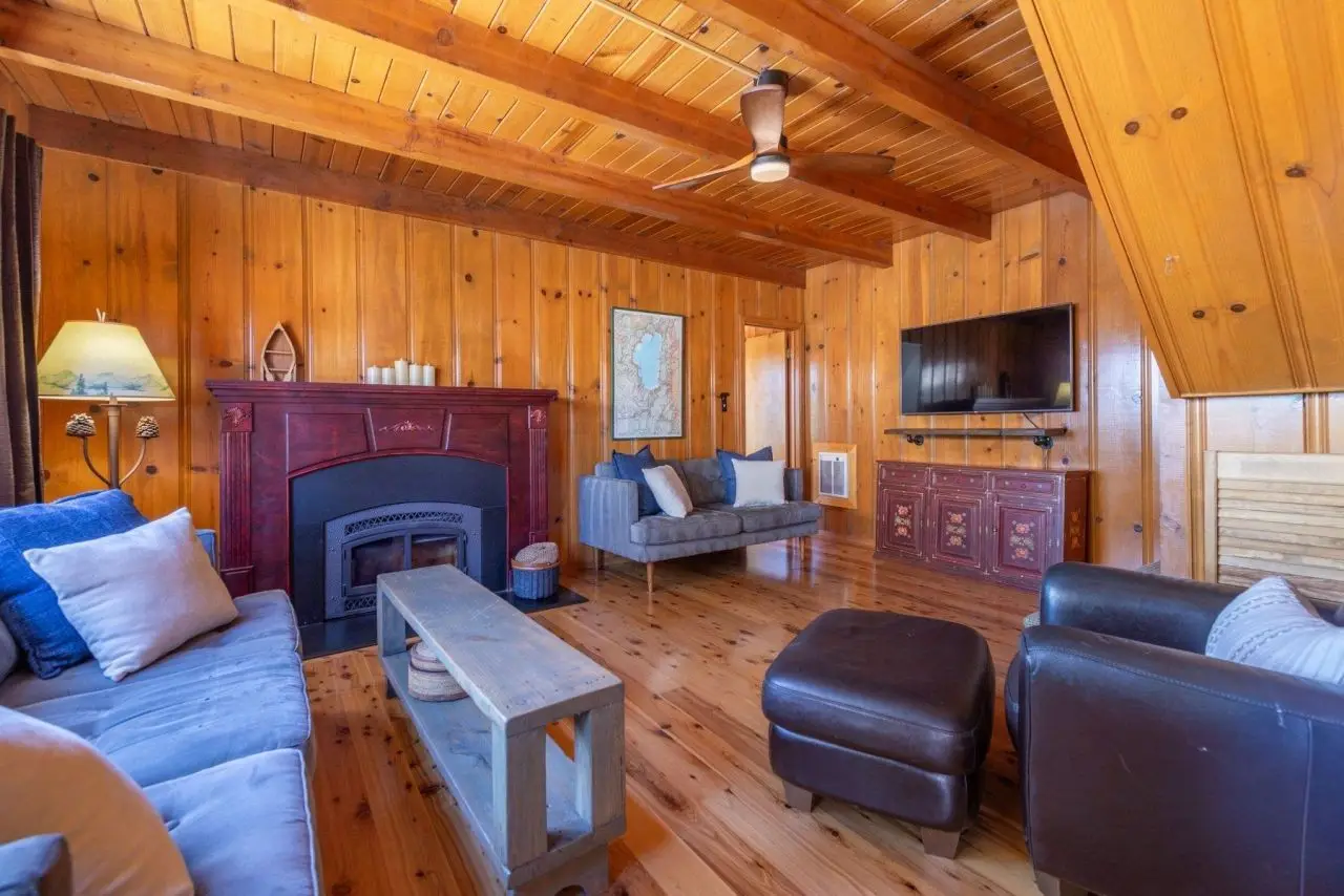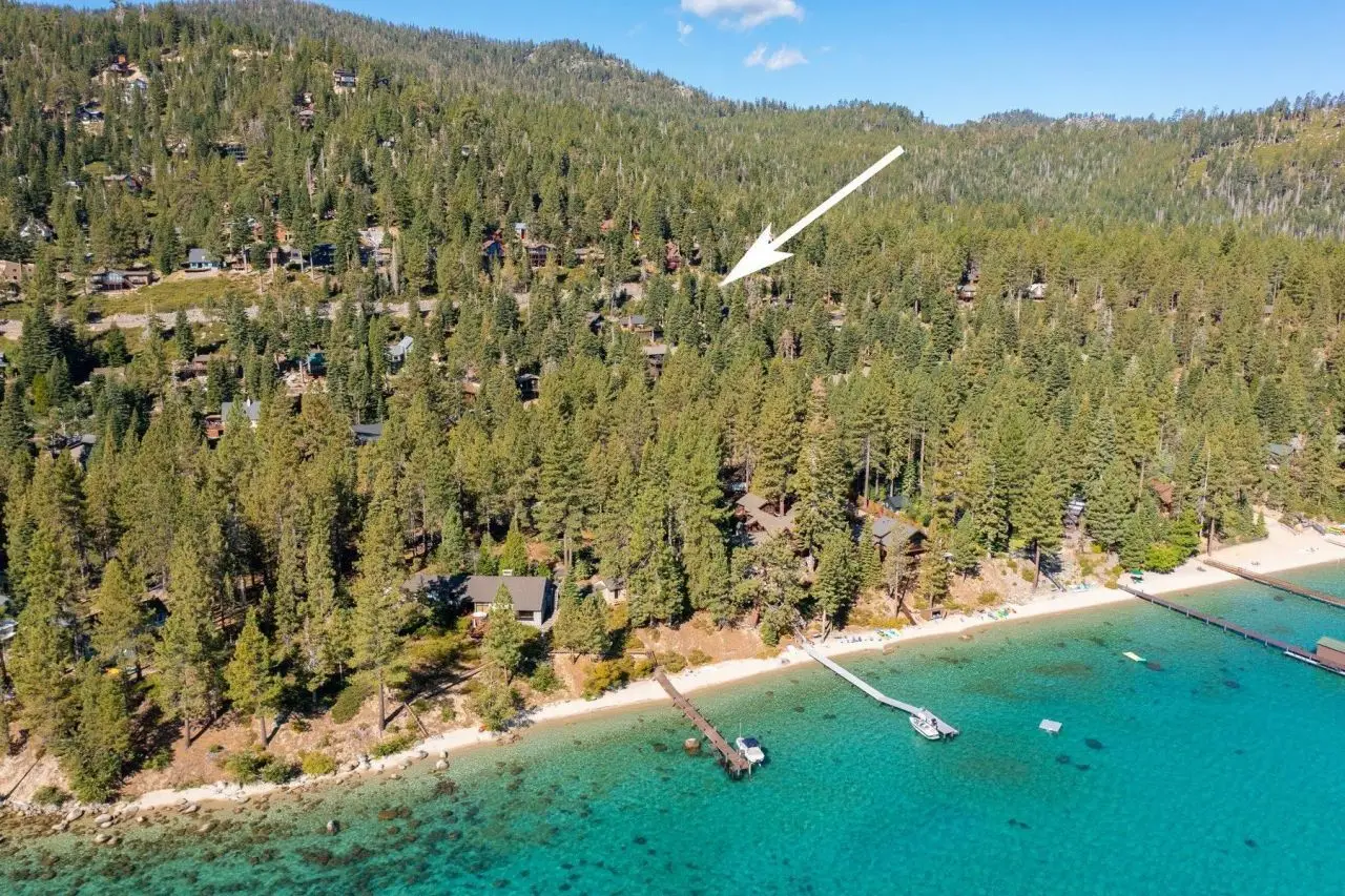 This four-bedroom, two-bathroom cabin is located below the highway on the coveted lower Rubicon loop. Just a short walk from a private path leading to Rubicon's white-sand HOA beach, shared pier, buoy field, and volleyball court, this property offers rare and easy lake access. The cabin embodies the charm of 'Old Tahoe with warm wood interiors, a cozy fireplace, and a layout designed for gathering and relaxation. The open kitchen and dining area create a welcoming space, while the expansive upper deck extends the living space outdoors, perfect for lounging and entertaining. Lake views can be enjoyed from the deck, living room, master suite, and lower-level guest room. The driveway easily accommodates three cars, and a large storage shed at the top provides ample space for gear. An exterior closet with a stackable laundry unit adds convenience.