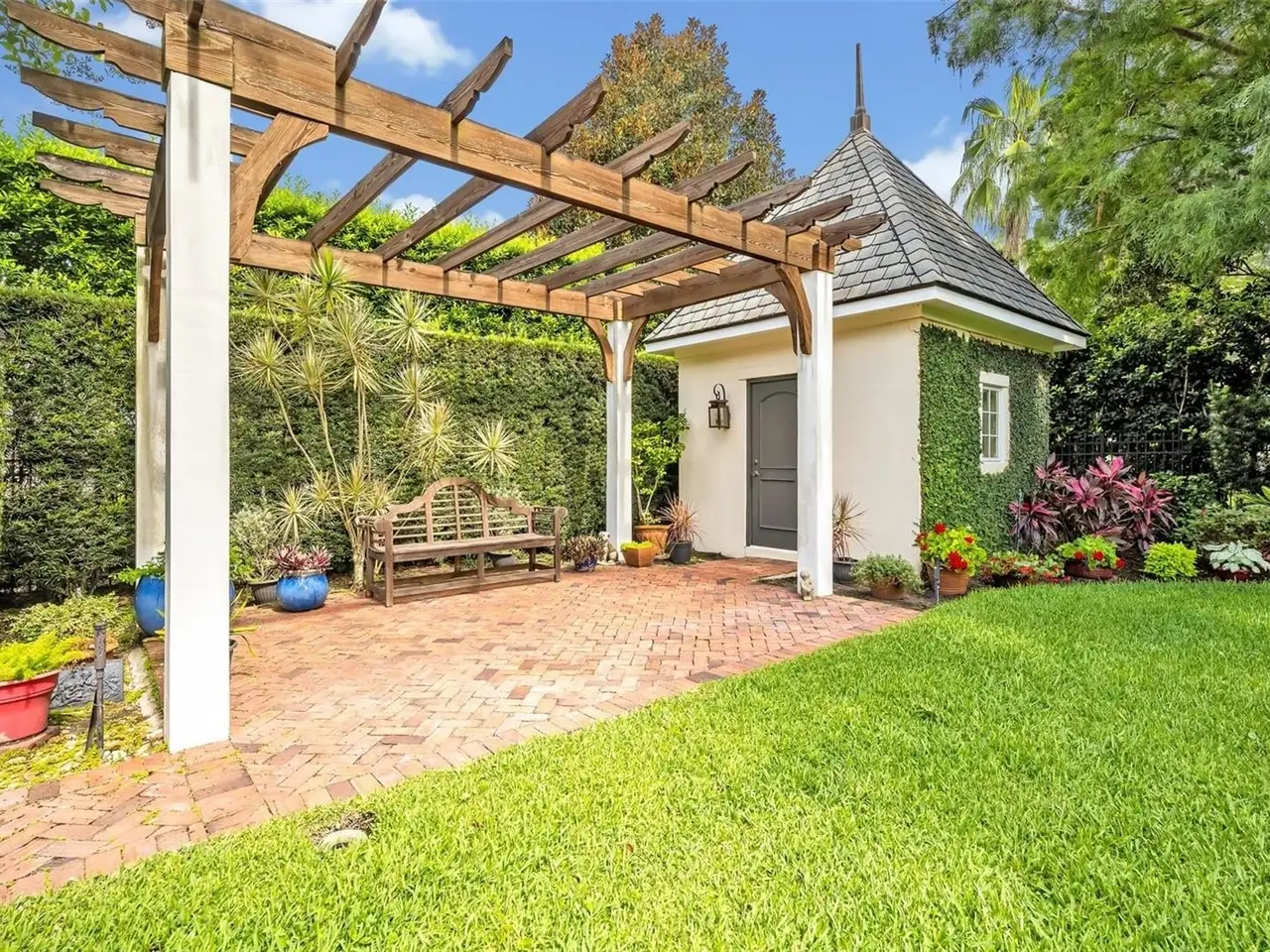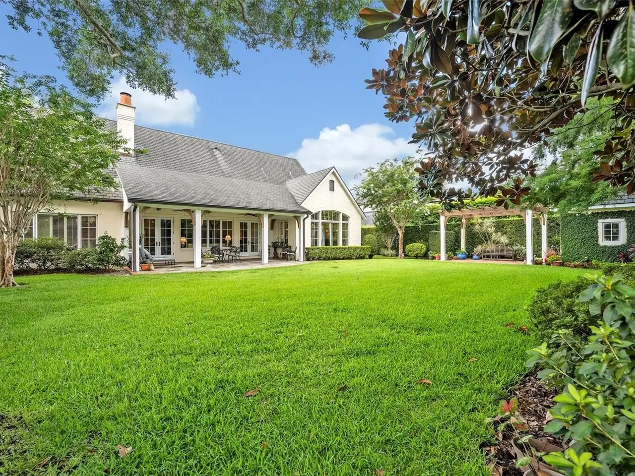 Stunning custom residence in the highly sought-after Windsong community, built by Hal George of Parkland Homes and designed by architect Steve Feller. This one-owner home blends timeless architecture with exceptional craftsmanship and thoughtful design. From the moment you arrive, the storybook curb appeal is undeniable—brick exterior and driveway, lush landscaping, and charming gardens create a warm welcome. Inside, luxury finishes abound: herringbone wood floors, crown molding, cased openings with arched doorways, custom built-ins and plantation shutters. The highly functional floor plan offers a downstairs owners’ suite plus a secondary bedroom (currently used as an office) with adjacent full bath. Upstairs, a spacious bonus room anchors two private bedroom suites. Soaring 10’ ceilings enhance the sense of space, with lots of natural light. The gourmet kitchen is a chef’s dream, featuring wood custom cabinetry, stainless steel appliances including a six-burner gas cooktop and Dacor double ovens, and an oversized island with sink. The kitchen flows seamlessly into the sunlit dining room with a dramatic vaulted 14’ beamed ceiling, comfortably seating 15. Set on a generous 0.38-acre lot, the outdoor living is equally impressive. The resort-style backyard showcases a covered patio with Pennsylvania Bluestone pavers, tongue-and-groove ceiling, and a charming detached garden house for storage. A serpentine wall winds gracefully through the landscaped grounds, offering privacy and charm. Additional highlights include an oversized two-car garage, indoor laundry with sink, and abundant storage throughout. A rare opportunity to own a meticulously maintained, beautifully appointed home in one of Winter Park’s most desirable communities.
