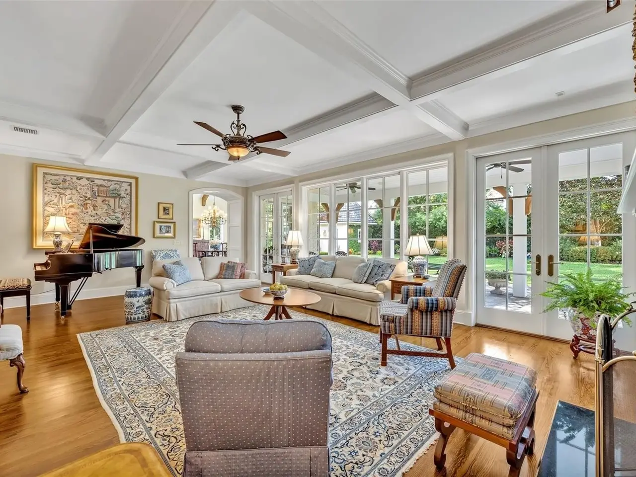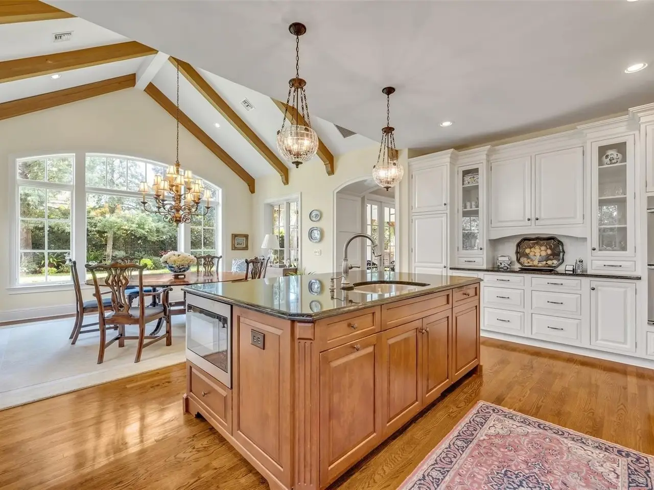 Vaulted 14’ beamed ceiling