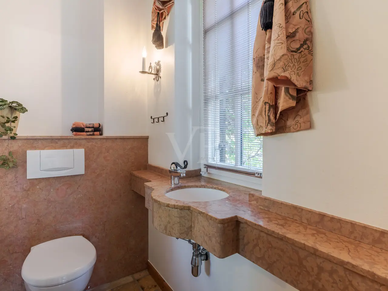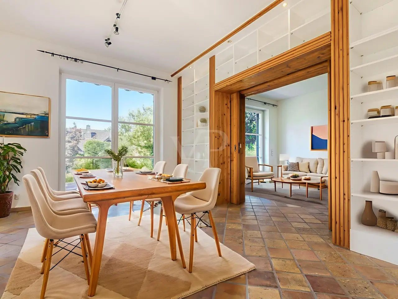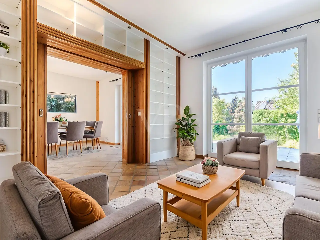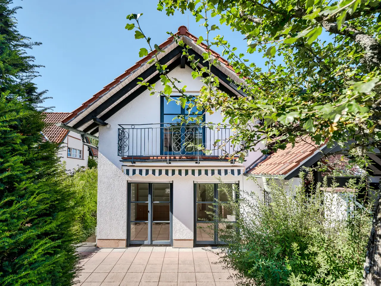 Just a few steps - and you are in the middle of the Taunus forest. Whether hiking, cycling or enjoying nature: here your leisure paradise starts almost on your doorstep. A wide range of leisure activities (such as tennis, horse riding, gliding, etc.) and the short journey time to Bad Homburg or Frankfurt will quickly convince you of Obernhain's location. Here in this sought-after residential area of Wehrheim-Obernhain, in a quiet and family-friendly environment, you will find this very special two-family house, which consists of two separate house halves, each with separate entrances. This results in a variety of possible uses: Living and working under one roof, as a multi-generational house - each for themselves and yet together, or for owner-occupation and partial letting to third parties, which offers attractive financing options. The solidly built house with two storeys and a full basement is in excellent condition with high-quality fittings and selected materials. There are 8 rooms in total, including 4 bedrooms and 2 bathrooms. Floor-to-ceiling window elements and the comfortable ceiling height of 2.93 m ensure light-flooded rooms and a pleasant living ambience and provide views of the romantic garden and the plants around the house from all rooms. A terrace adjoining the living area across the entire width of the house offers ideal conditions for enjoying the garden, which is virtually secluded in summer, as well as peace and privacy. Special features of the garden-side half of the house: The antique, French cotto flooring throughout the first floor exudes a very special charm and is complemented on the upper floor by solid country house floorboards in oiled oak. The light-flooded studio/bedroom is adjoined by a balcony that offers a romantic view of the garden. The daylight bathroom on the upper floor has a shower, bathtub and a double washbasin in Rosso Sardo with a ceiling-high mirror element. The first floor is dominated by the large, open living and dining area with access to the terrace, which can be separated by a sliding door. The current room divider, which can be used as shelving, can easily be removed, allowing for flexible use. Special features of the front building: Here, too, you can expect high-quality fittings with natural stone floors on the first floor (Jura banded), various built-in wardrobes including a mirrored wardrobe and also a room divider between the living and dining area, which can be easily removed. On the upper floor there are two further living/bedrooms, one of which has a dressing room and a daylight bathroom. From the balcony adjoining the bedroom, you have a wonderful view of the greenery. The technical equipment has a lot to offer, such as underfloor heating on all living levels, fiber optic connection, lightning and surge protection, as well as an alarm and water protection system in the garden-side house. Last but not least, the existing lighting with designer lamps reflects the special ambience. The boiler room in the basement is accessible from both houses and secured by lockable fire doors. The overall attractive design is also continued outside. Even the entrance area to the two halves of the house and the garden, in pink sandstone and the folding shutters, give the exterior of this house ensemble a very special flair. The low-maintenance garden behind the house with rose and shrub beds and a unique sandstone sculpture by the fountain invites you to linger and daydream. A spacious double carport with two additional parking spaces rounds off the offer. The property is available immediately. Get in touch with us today. We look forward to your inquiry.