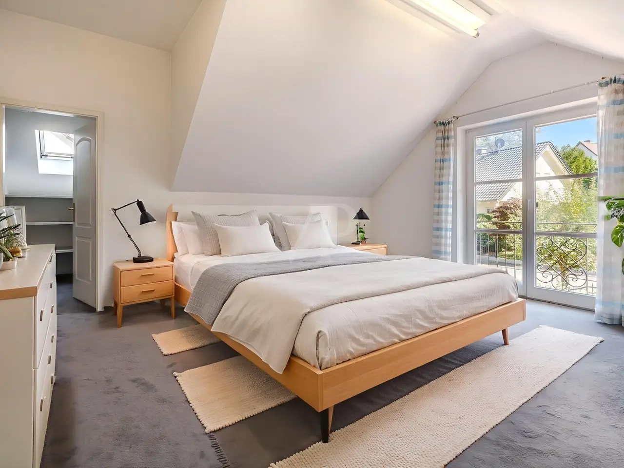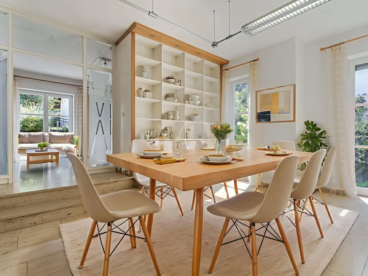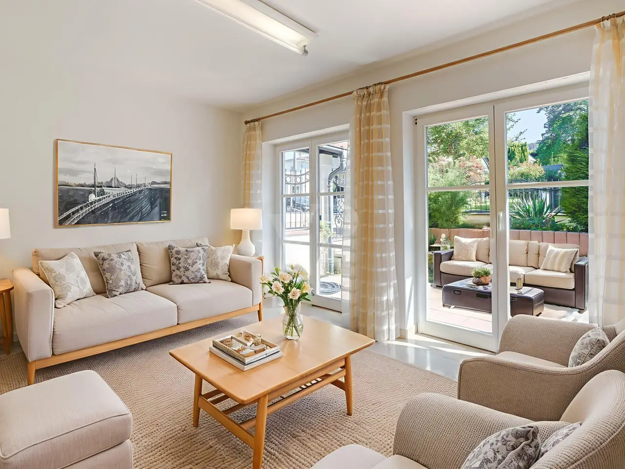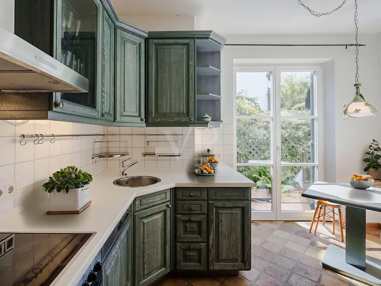 Just a few steps - and you are in the middle of the Taunus forest. Whether hiking, cycling or enjoying nature: here your leisure paradise starts almost on your doorstep. A wide range of leisure activities (such as tennis, horse riding, gliding, etc.) and the short journey time to Bad Homburg or Frankfurt will quickly convince you of Obernhain's location. Here in this sought-after residential area of Wehrheim-Obernhain, in a quiet and family-friendly environment, you will find this very special two-family house, which consists of two separate house halves, each with separate entrances. This results in a variety of possible uses: Living and working under one roof, as a multi-generational house - each for themselves and yet together, or for owner-occupation and partial letting to third parties, which offers attractive financing options. The solidly built house with two storeys and a full basement is in excellent condition with high-quality fittings and selected materials. There are 8 rooms in total, including 4 bedrooms and 2 bathrooms. Floor-to-ceiling window elements and the comfortable ceiling height of 2.93 m ensure light-flooded rooms and a pleasant living ambience and provide views of the romantic garden and the plants around the house from all rooms. A terrace adjoining the living area across the entire width of the house offers ideal conditions for enjoying the garden, which is virtually secluded in summer, as well as peace and privacy. Special features of the garden-side half of the house: The antique, French cotto flooring throughout the first floor exudes a very special charm and is complemented on the upper floor by solid country house floorboards in oiled oak. The light-flooded studio/bedroom is adjoined by a balcony that offers a romantic view of the garden. The daylight bathroom on the upper floor has a shower, bathtub and a double washbasin in Rosso Sardo with a ceiling-high mirror element. The first floor is dominated by the large, open living and dining area with access to the terrace, which can be separated by a sliding door. The current room divider, which can be used as shelving, can easily be removed, allowing for flexible use. Special features of the front building: Here, too, you can expect high-quality fittings with natural stone floors on the first floor (Jura banded), various built-in wardrobes including a mirrored wardrobe and also a room divider between the living and dining area, which can be easily removed. On the upper floor there are two further living/bedrooms, one of which has a dressing room and a daylight bathroom. From the balcony adjoining the bedroom, you have a wonderful view of the greenery. The technical equipment has a lot to offer, such as underfloor heating on all living levels, fiber optic connection, lightning and surge protection, as well as an alarm and water protection system in the garden-side house. Last but not least, the existing lighting with designer lamps reflects the special ambience. The boiler room in the basement is accessible from both houses and secured by lockable fire doors. The overall attractive design is also continued outside. Even the entrance area to the two halves of the house and the garden, in pink sandstone and the folding shutters, give the exterior of this house ensemble a very special flair. The low-maintenance garden behind the house with rose and shrub beds and a unique sandstone sculpture by the fountain invites you to linger and daydream. A spacious double carport with two additional parking spaces rounds off the offer. The property is available immediately. Get in touch with us today. We look forward to your inquiry.