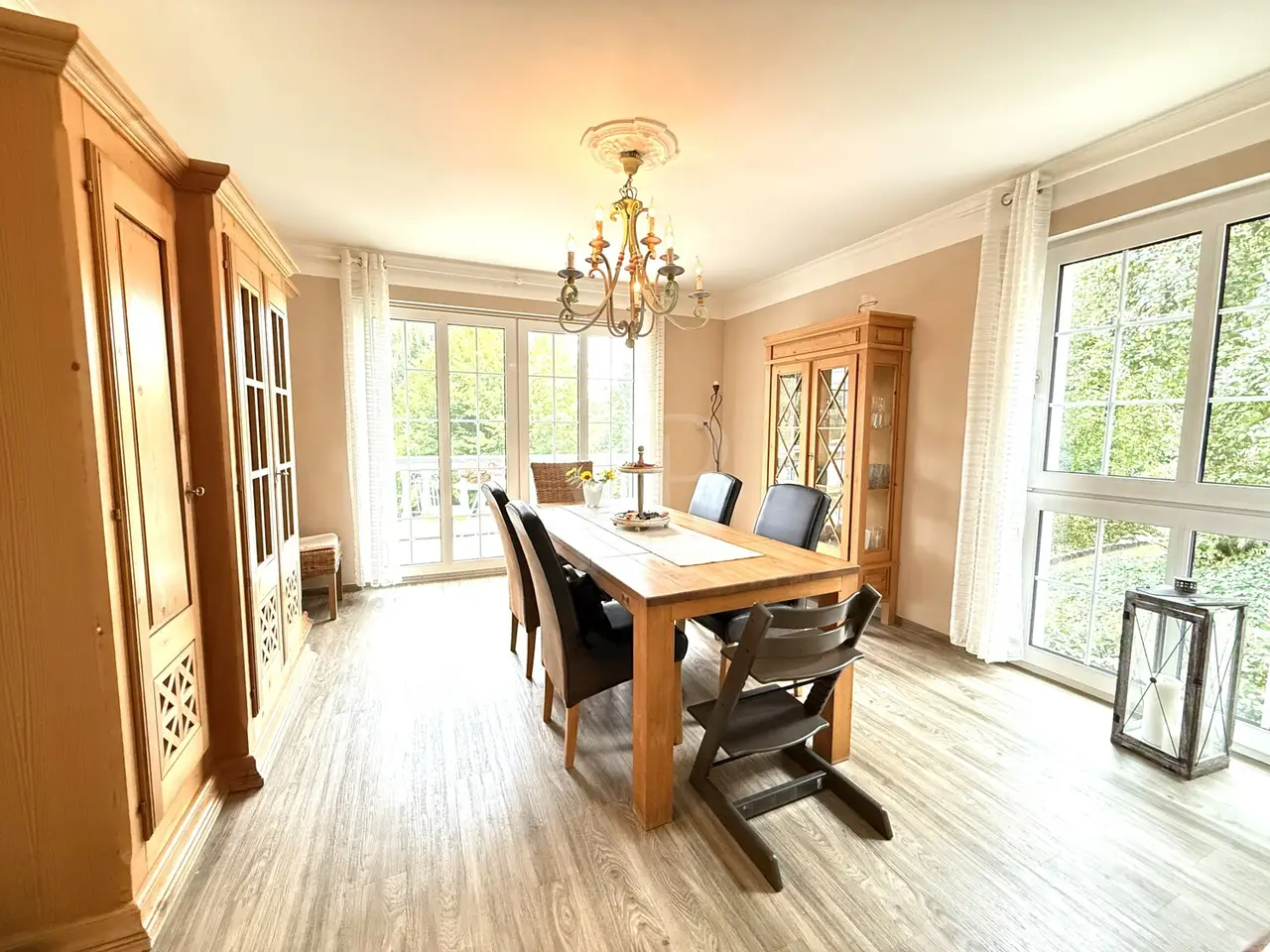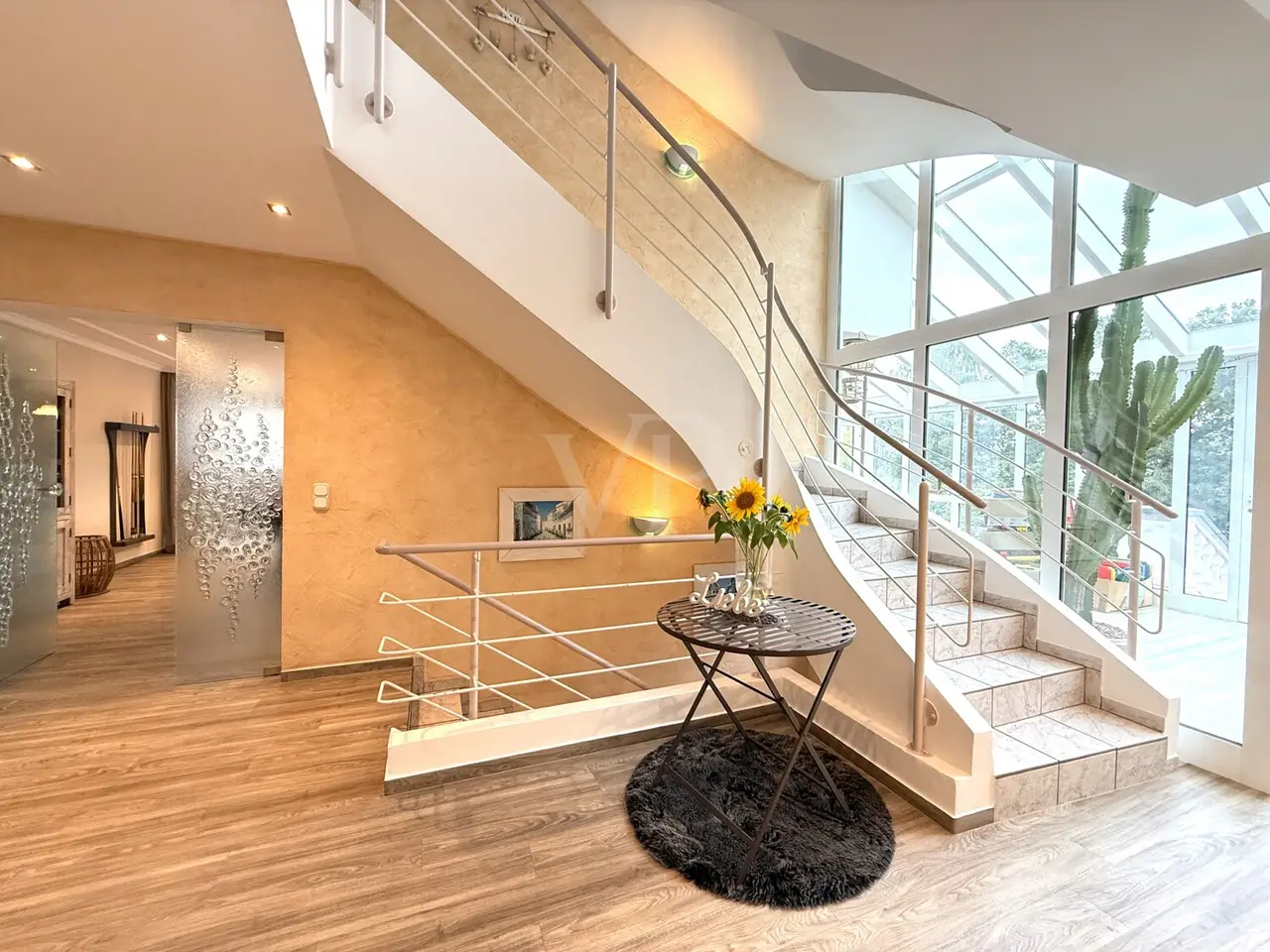 This impressive villa was built in 1993 and extensively modernized. It is situated on a plot of approx. 3,250 m² with a spacious garden, several outdoor areas and a variety of high-quality features. The living space is approx. 505 m² and is distributed over a total of 9 rooms, including 7 bedrooms and 4 bathrooms, making the property suitable for a wide range of uses. On the first floor, you will find a bright, spacious living and dining area with a contemporary room layout. A conservatory (approx. 7 m x 3.5 m) offers a wide view of the greenery and creates a pleasant living climate all year round. Both modern underfloor heating and a wood-burning stove provide cozy warmth. The high-quality fitted kitchen is generously equipped and allows for comfortable working and socializing. The first floor is rounded off by a guest WC, which was renovated in 2024. There are several bedrooms on the upper floor and in the attic, some with their own en-suite bathrooms. Ceiling spotlights provide atmospheric lighting. The spacious roof terrace on the first floor and six further balconies invite you to spend relaxing hours outdoors. The basement impresses with a usable area of approx. 193 m² (of which approx. 37 m² can be used as living space) and offers further special highlights: a wellness area with steam sauna and Finnish sauna (manufactured by Kalfs), a plunge pool and a separate guest WC. There is also an indoor pool with a pool bar. The indoor pool is equipped with a walk-in panel that can be lowered upwards into the ceiling, creating a multi-purpose room measuring approx. 5.5m x 14m and allowing for further possible uses. For outdoor sports activities, there is a heated outdoor pool measuring approx. 5 m x 8 m, a pool terrace and an outdoor shower. A covered outdoor kitchen, a pizza oven and a barbecue cotta garden house allow for extended cooking and barbecue evenings with friends and family. You can enjoy the view of the large garden pond from the private lakeside terrace. The technical equipment in the house is perfectly coordinated: A modern solar system with 17 kW output and 10 kW storage, a new main switch cabinet, central vacuum cleaner system, electric access gate, a wallbox (11 kW) for electric vehicles and a 6,000-liter cistern for domestic water use underline the sustainable character of this property. A carport, three individual garages and a total of six outdoor parking spaces are available for vehicles. The pitched roof above the garages offers further attractive storage space. This well-kept villa combines spaciousness, modern technology and a well thought-out space and usage concept in a quiet, green location - ideal for discerning prospective buyers who value quality, versatility and privacy. We would be happy to arrange a personal viewing for you. Our colleagues at VON POLL Finance will be happy to assist you with individual financing solutions!