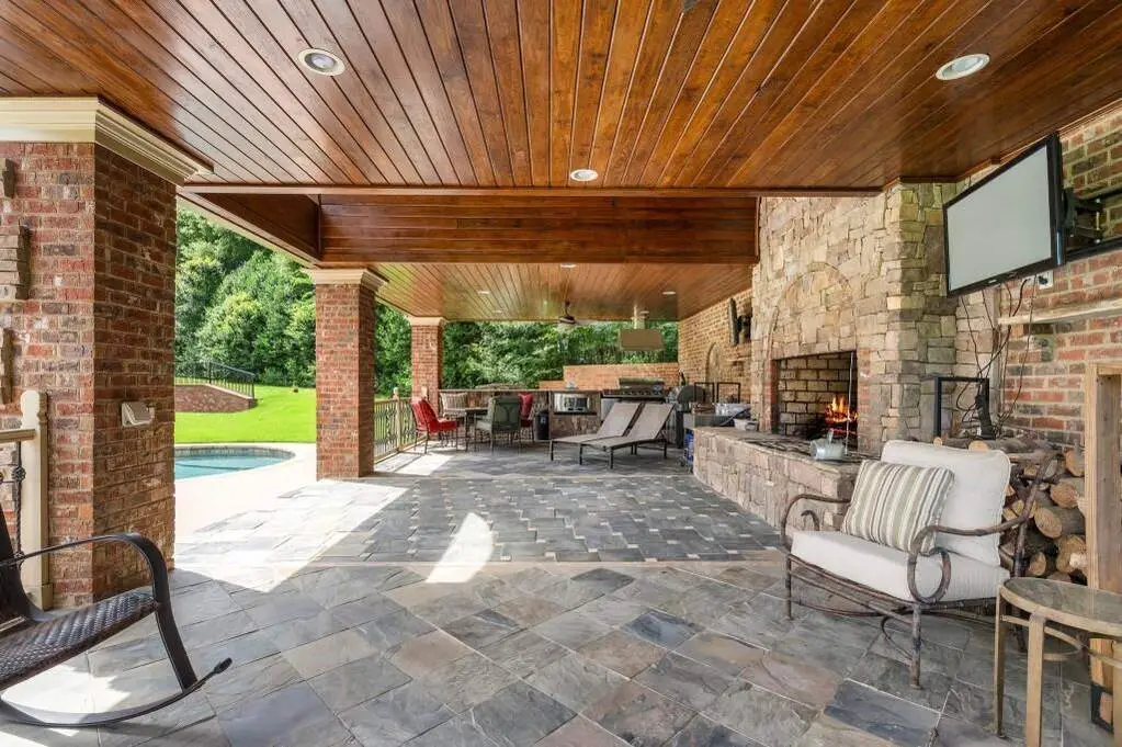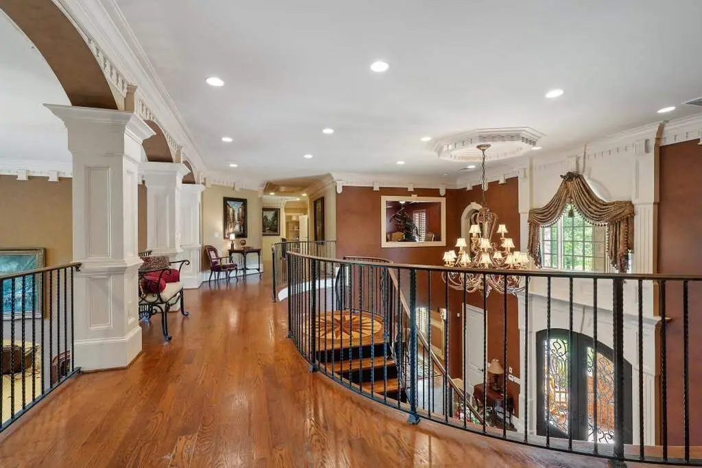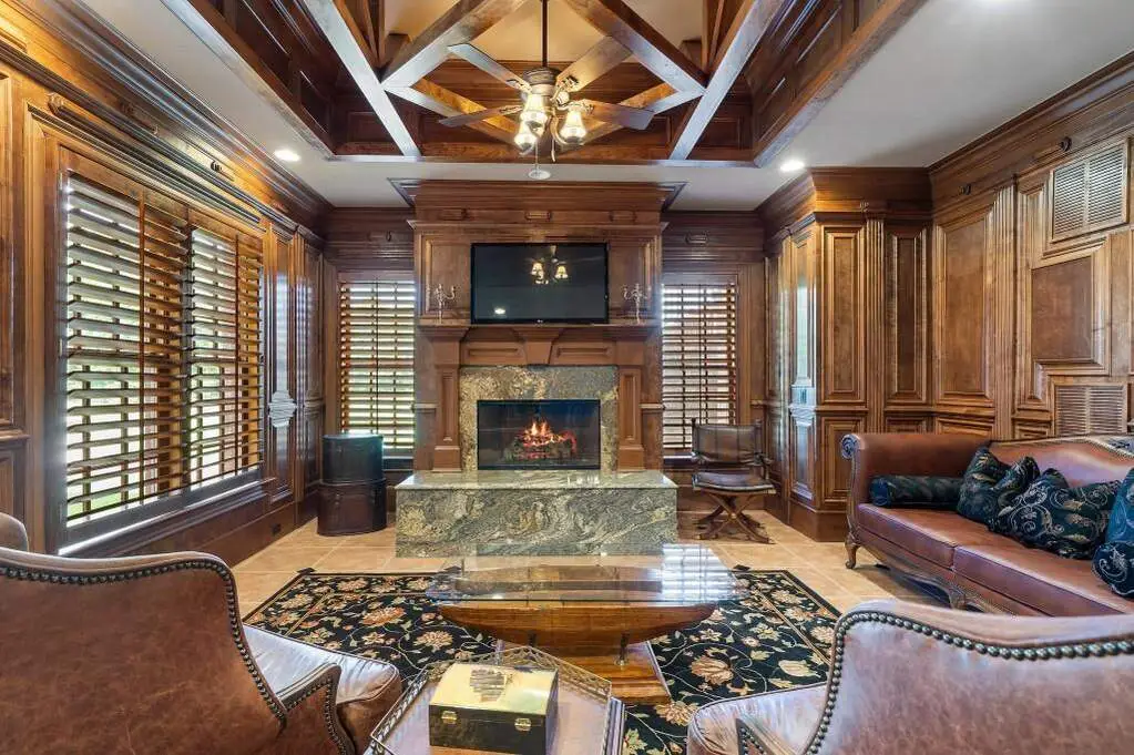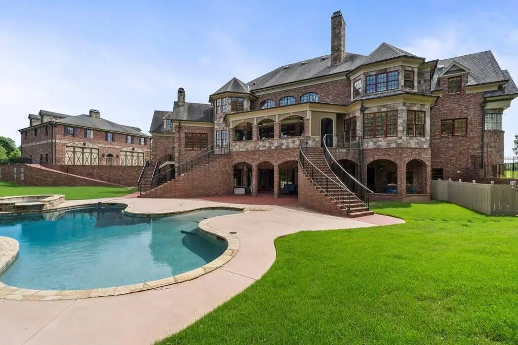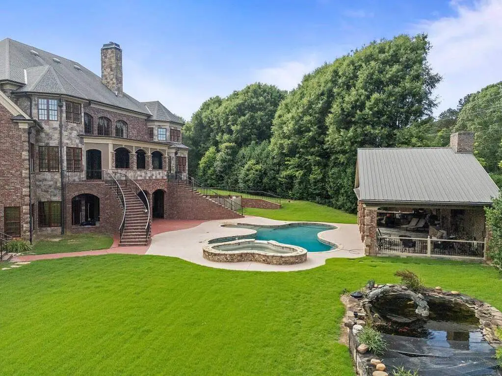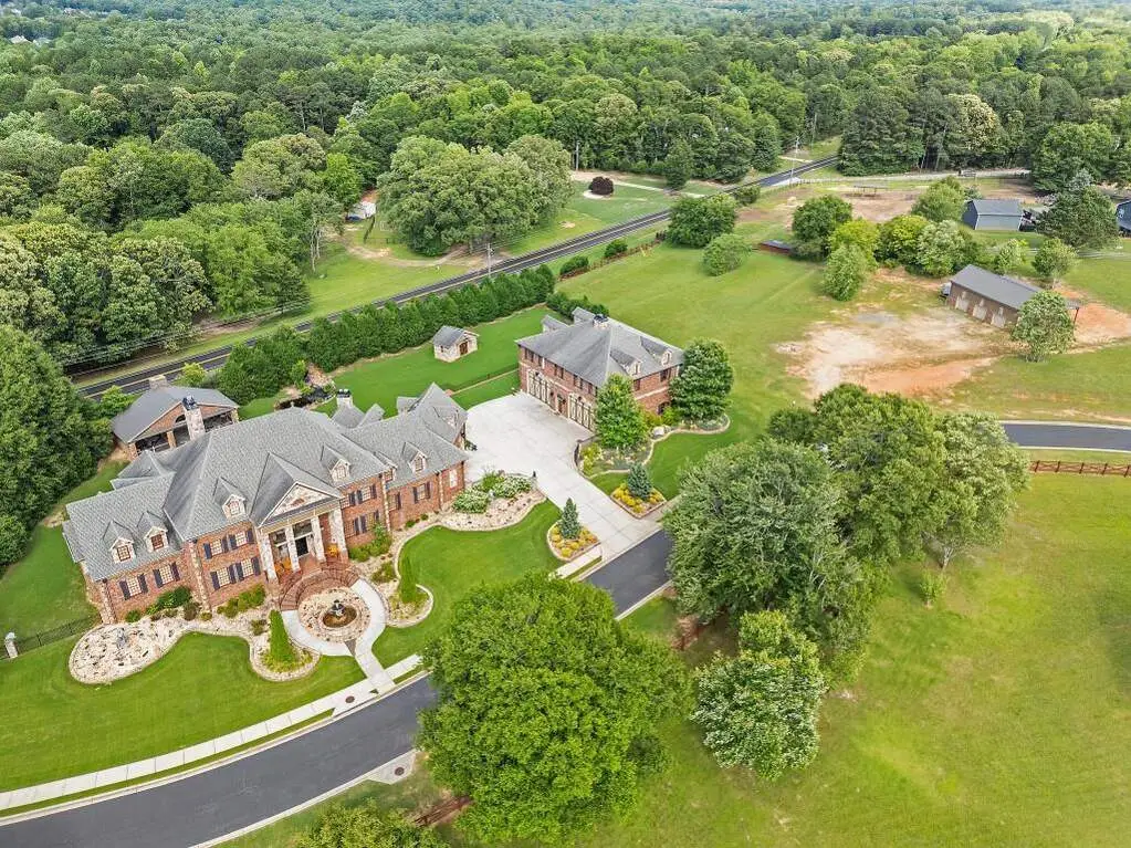 A magnificent estate where timeless architecture meets exceptional craftsmanship. Set on lush, rolling acres, this brick and stone masterpiece offers both grand entertaining spaces and serene outdoor retreats. A courtyard-style entry with a central fountain and dual staircases sets a dramatic tone. Inside, a soaring foyer with mirrored staircases leads to a formal living room featuring a stone fireplace and built-in bookcases, with direct access to a tranquil screened-in porch. The formal dining room impresses with coffered ceilings and intricate molding, ideal for elegant dinners. A hidden prep kitchen with double ovens, ice maker, and fridge adds convenience. The chef's kitchen boasts an oversized stone island with prep sink, 8-burner cooktop, double ovens, and wine storage, flowing into a sunny breakfast room and informal living area with a cozy fireplace.The main-level primary suite is a spacious, private retreat with a fireplace, morning bar, sitting area, and oversized windows. The spa-like bath features double vanities, a soaking tub, and a luxurious wraparound shower. Upstairs are four guest bedrooms with en-suite baths, connected by a dramatic open bridge hallway. A large storage closet and half bath add function. A stunning library-style study, adorned with rich wood paneling and custom murals, offers a refined escape. The terrace level is perfect for entertaining, with exposed beams, a cozy living room with fireplace, full bar and kitchenette, and lounge area with outdoor access. A half bath with mahogany paneling, large game room, and custom Georgia Bulldogs-themed home theater enhance the experience. A spacious gym and second half bath complete the level. Outside, a resort-style pool and hot tub create the ultimate retreat. The cabana features two grills, a microwave, counter space, and a fireplace. A koi pond adds tranquility. The carriage house sits above an oversized garage with space for large vehicles or a car collection. It offers a full kitchen, living and dining areas, and two private bedrooms with full baths-ideal for guests. Surrounding the home, manicured gardens and mature trees enhance the setting. A charming barn adds versatility, perfect for storage or a workshop, blending seamlessly into the estate's classic aesthetic.