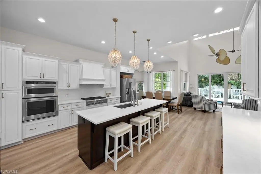 This beautiful Old Naples Key West architectural gem, recently renovated, reflects today's lifestyle. Just steps from the white sugar sand beaches of the Gulf and a short stroll to both 5th Avenue and 3rd Street quaint boutiques and upscale restaurants, the home has over 3,600 square feet of interior living space. Beyond an expansive front porch, you enter through large glass double doors into a foyer with soaring ceilings leading to a formal living room with fireplace, adjacent study, separate dining room, powder room, and an upgraded kitchen with stainless steel chef's appliances and large center island. The kitchen opens to a large family room with double volume ceilings and French doors leading out to a sparkling new saltwater pool and luxurious spa with surrounding deck. Upstairs are three large bedrooms including a sumptuous primary suite with balcony and luxurious bath with separate shower, soaking tub and double vanities. Two additional en suite bedrooms and a large front patio complete the upstairs. Large two car garage with lots of storage is accessed by an alley. Don't miss this opportunity to enjoy the superb Naples lifestyle.