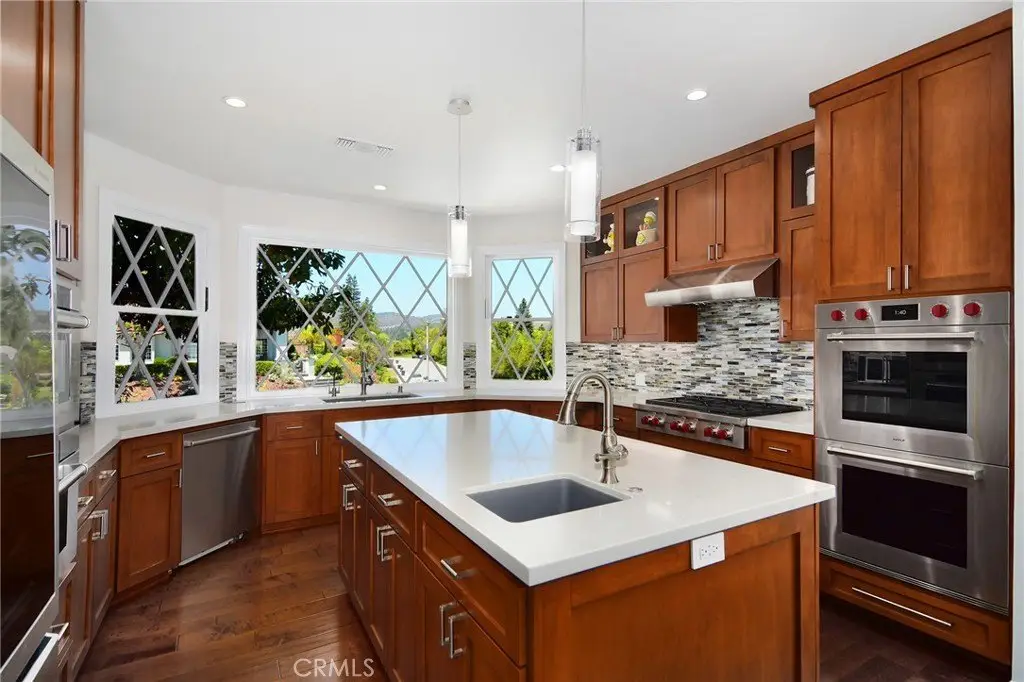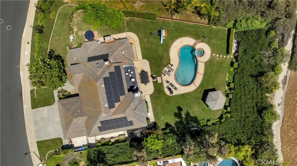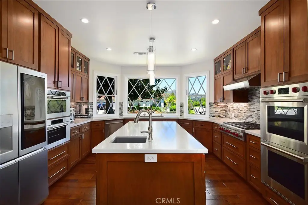 Welcome to this exceptional residence nestled in the prestigious Morrison Highlands community. Situated on a spacious lot with panoramic views, this beautifully upgraded home offers the ultimate in comfort, technology, and indoor-outdoor living. Enjoy resort-style amenities in your expansive backyard featuring a sparkling pool and spa, gazebo with lighting, lush lemon and grapefruit trees, a fire pit, and a natural gas BBQ. A removable pool fence ensures flexibility for family fun or elegant entertaining. Inside, the completely remodeled chef’s kitchen is a culinary dream, boasting custom maple cabinetry, quartz countertops, a large center island with sink and storage, and premium Wolf and LG Signature appliances—including four ovens, a built-in steam convection oven, and a see-through refrigerator with an auto-opening door. A butler’s pantry adds even more functionality. The luxurious upstairs primary suite is a true retreat, with a private balcony, a custom walk-in closet with built-in dresser, and a spa-inspired bathroom complete with soaking tub, steam shower, dual water closets, and Toto bidet washlets. This home also features a professionally built, 10-seat home theater—featured in two audio-video magazines—fully equipped with Apple TV, Xbox, a popcorn machine, and smart iPad controls. The theater equipment was upgraded just four years ago. Designed with smart living in mind, the home includes motorized shades in the primary bedroom, a Ring alarm system, smart controls for lighting, thermostats, irrigation, and pool equipment, as well as digital locks on all exterior doors. The garage is wired for EV charging and supported by owner-owned solar panels. Located in the highly regarded Las Virgenes School District, this rare offering blends luxury, innovation, and timeless comfort in one of the area’s most coveted neighborhoods.