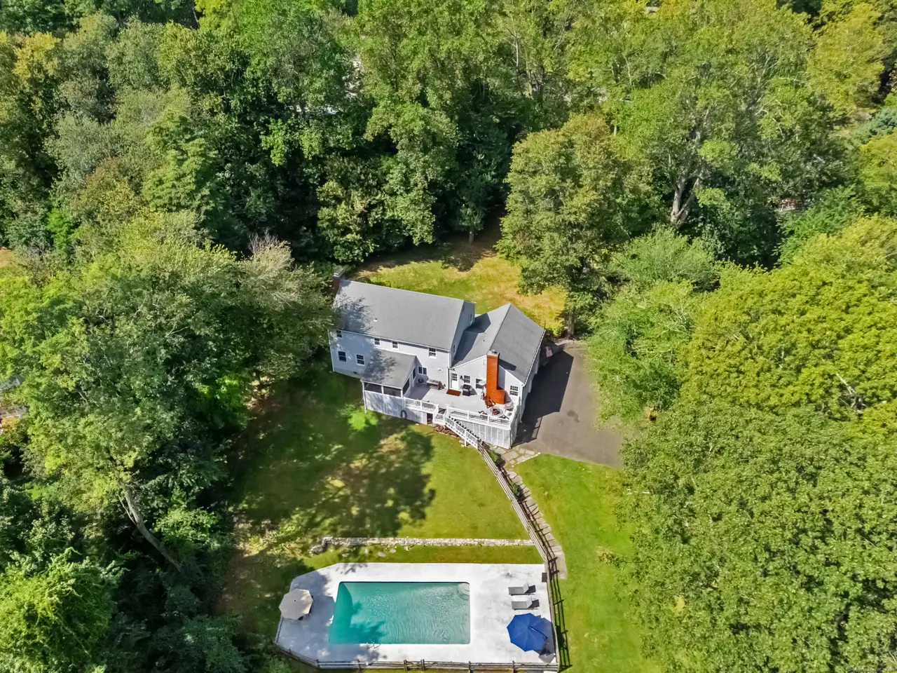 Welcome to 21 East Hill Road, a timeless New England Colonial tucked away on a quiet North Stamford cul-de-sac. Perfectly situated in a sought-after location, this home rests on 1.36 acres of parklike grounds, framed by mature greenery and highlighted by a heated pool. The setting is both peaceful and serene, offering a true retreat. Inside, spacious rooms and a functional floor plan are accented by hardwood floors and two fireplaces that add warmth and character. The eat-in kitchen is a standout, adjoining the gracious front-to-back living room on one side and a generous yet cozy family room on the other. A formal dining room adds elegance for entertaining, while casual kitchen dining flows to the screened porch and Trex deck, where sweeping views of the rear yard and pool set the stage for gatherings or quiet evenings outdoors. With four bedrooms plus a main-floor flex room/office, the home adapts seamlessly to today's lifestyle-ideal for a guest suite or work-from-home space. The primary suite features a spacious bath, while the finished walkout lower level provides abundant space for recreation, fitness, or media. All this in a prime location with convenient access to downtown Stamford, local beaches, shopping, dining, and the train station. With New York City within easy reach, the home offers the best of both worlds, elbow room to relax, yet close to everything. Set in a peaceful, versatile, and desirable neighborhood, this property delivers both everyday comfort and the refined Fairfield County lifestyle.