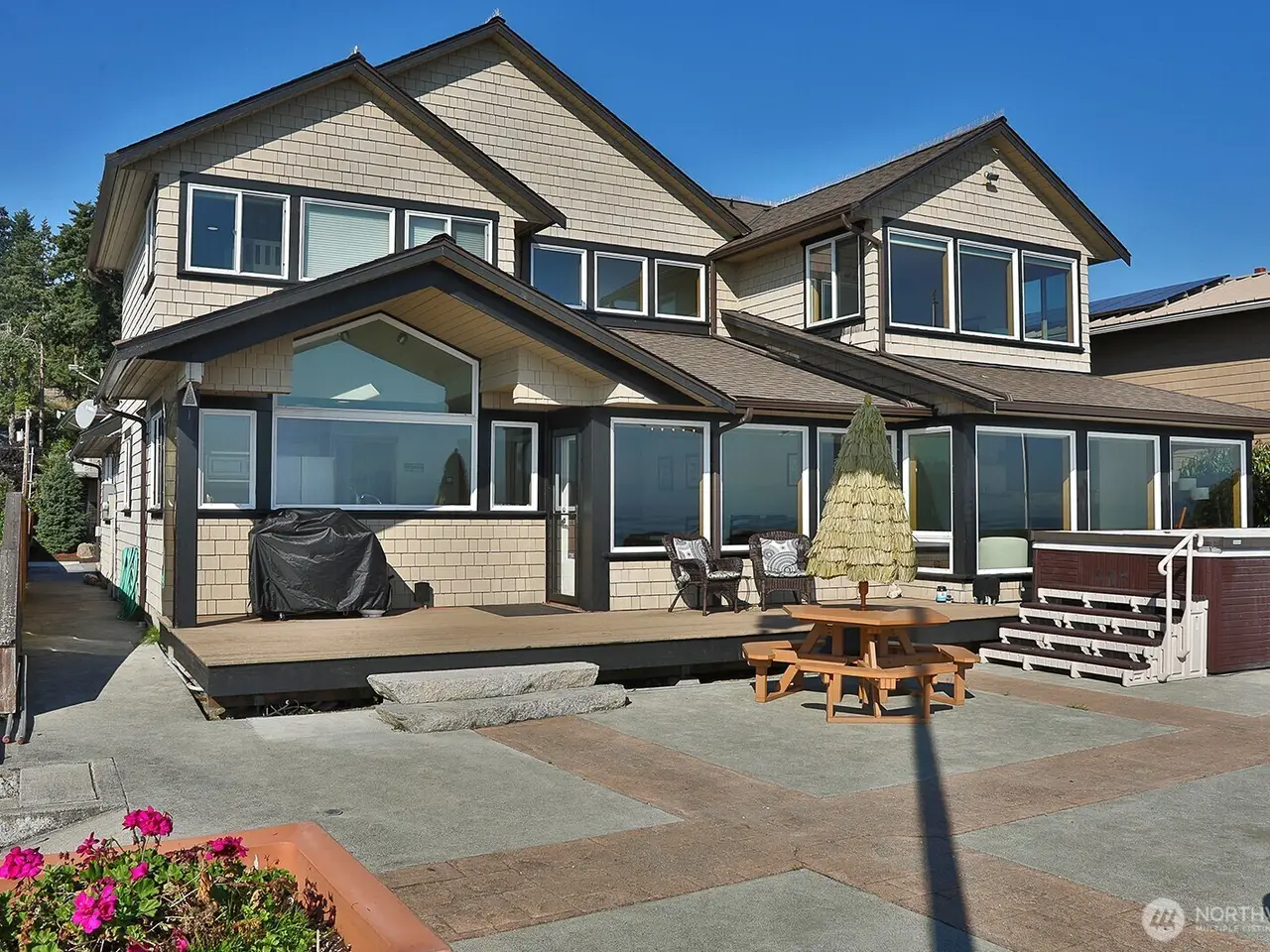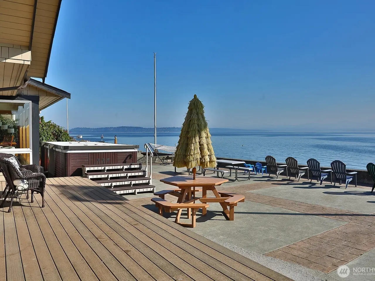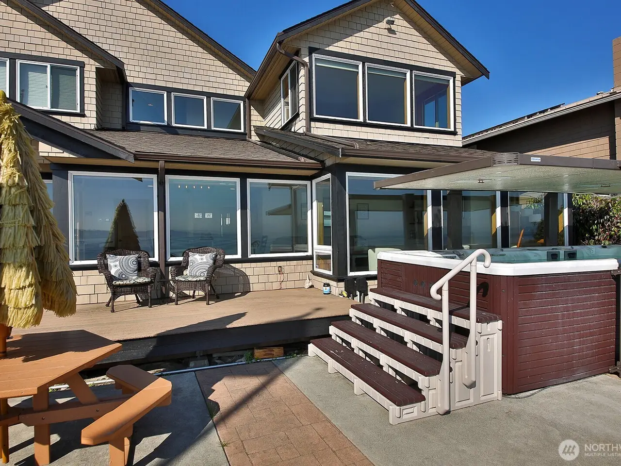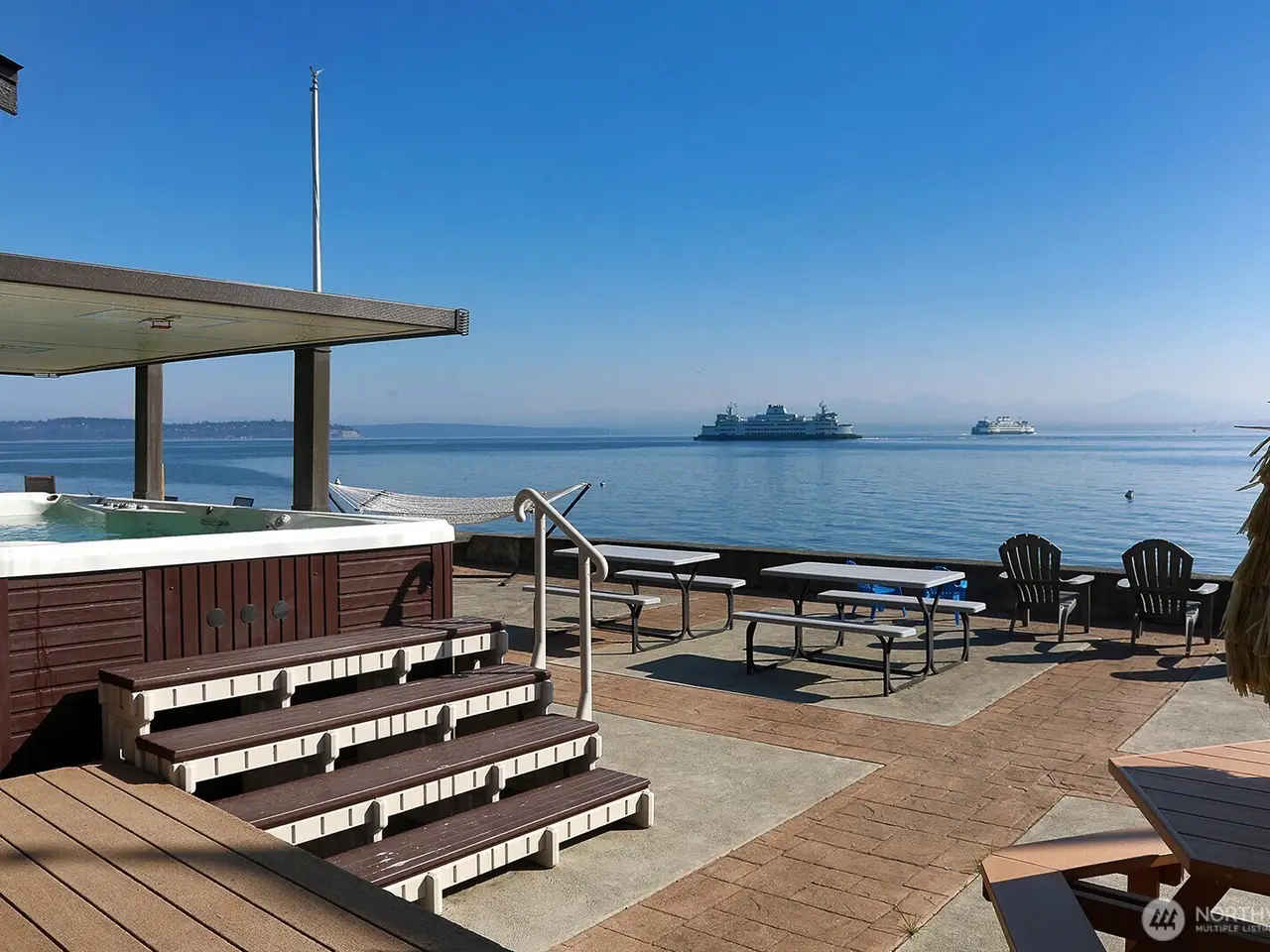 Immaculate waterfront living in Clinton! This beautifully maintained home offers sweeping views of the Cascades, Mt. Baker and the sparkling city lights from across the Sound. Private steps to the beach grant easy access to your mooring ball and vessel for premier crabbing and fishing. Enjoy the spacious concrete patio, perfect for entertaining guests and extremely easy to maintain. The open floor plan is filled with natural light and finished with quality details throughout. This 2-bedroom home offers 3 sleeping areas for larger gatherings. Relax in the 2-in-1 swim spa/hot tub while soaking up the panoramic vistas. Just minutes from the Clinton ferry for a quick commute, and proven short-term rental history adds investment potential.