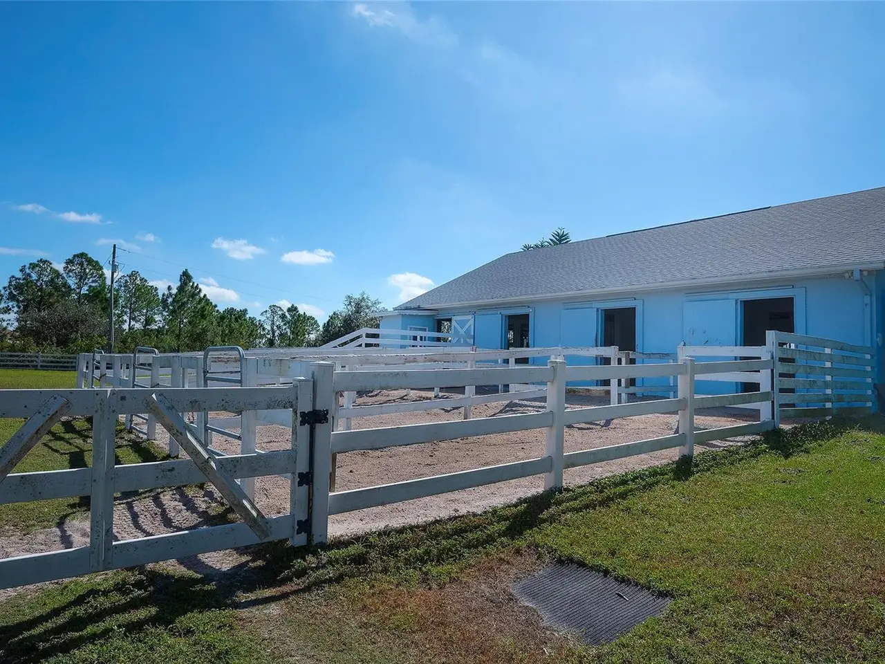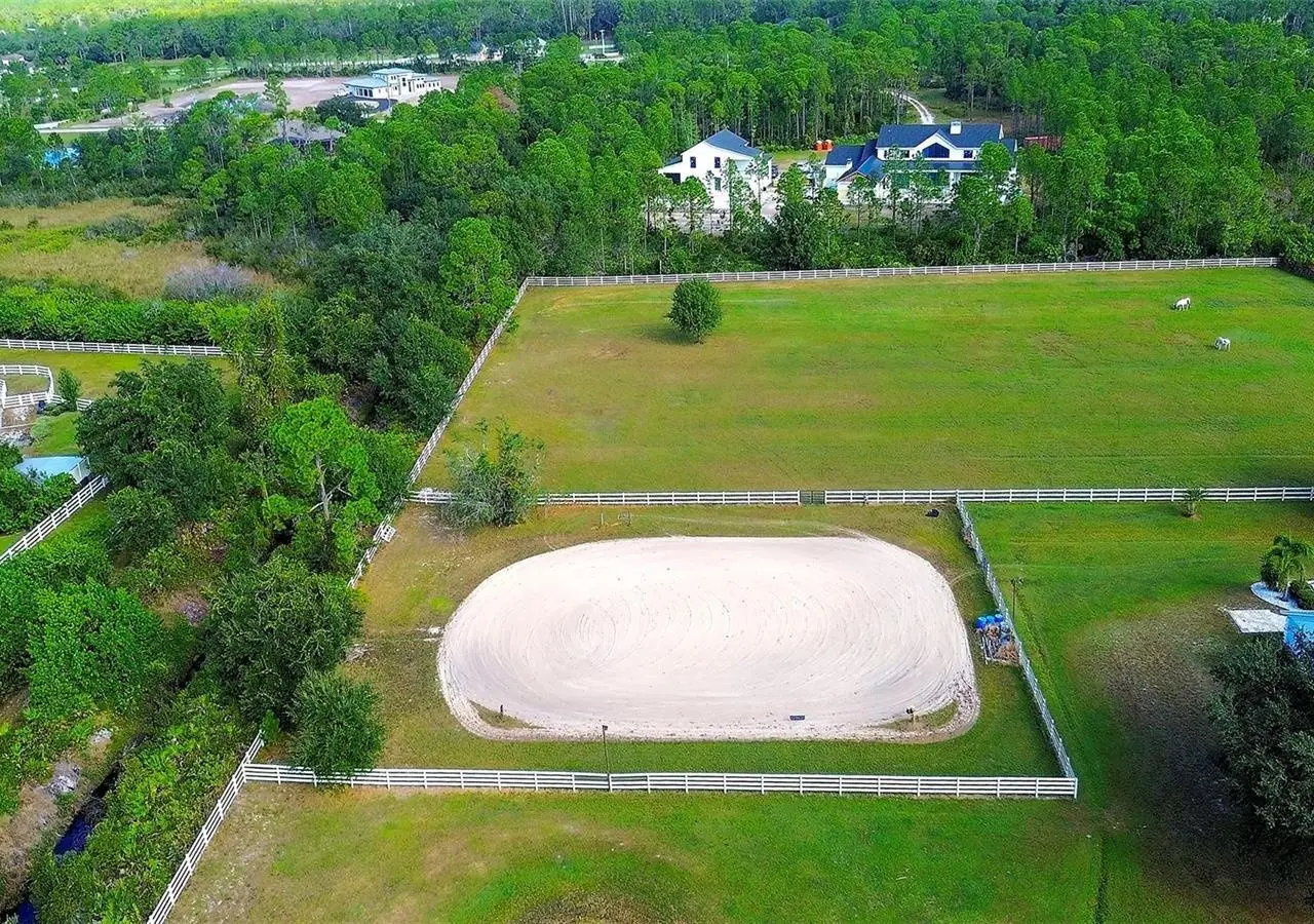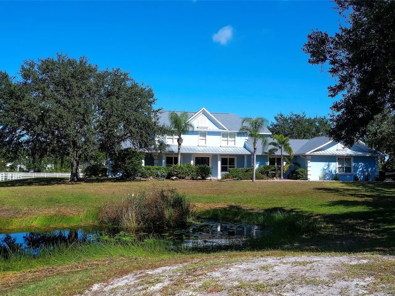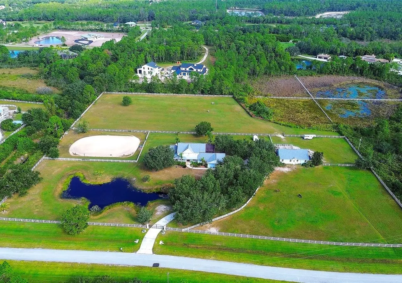 Gated and completely fenced, this elegant traditional home is in the highly sought after neighborhood of Foxwood in Panther Ridge. Its storm ready and perfectly positioned in Zone X, sitting high and dry, with no flood insurance required. Adding to your peace of mind, the house and barn have new roofs in 2025, each with a transferrable warranty. This country estate offers enduring craftmanship. Arrive through the automatic gate to the oak tree lined driveway. The view of pasture and block barn on right and pond on left make for beautiful curbside appeal. Step onto front porch and enter the marble foyer. Once inside you will find an impressive gourmet kitchen with cherry cabinetry, Cambria quarts, a 6 burned DACOR gas range, Sub-Zero refrigerator, Miele dishwasher-ideal for those who love to cook. The kitchen is light and airy with breakfast bar and plenty of room for table to view the saltwater pool with Baha shelf. The first-floor primary suite features a gas fireplace, spa-inspired bath with Mr. Steam shower and brass clawfoot tub, and custom closets with locking cabinetry. The great room has 20-foot ceilings, gas fireplace, marble floors and poplar built-ins open to a screened lanai with an automatic shade for effortless indoor-outdoor living. Additional rooms on first floor are spacious dining room, office, and private bedroom with ensuite bath. Featured upstairs is a large bonus room with bar connecting to a TREX deck overlooking pool with generous travertine surround. Two additional bedrooms and bathroom complete the second floor. The block barn designed with 4 stalls, individual turnouts, automatic fly system, fans, tack room, feed room, wash racks, and RV outlets. The barn offers infinite flexibility and could be converted into a guest house, workshop, or space for a car collector. Both the home and barn feature Miami-Dade hurricane rated windows and doors. For year-round comfort and security, a 30KW Generac generator and Martin garage doors have been installed. It is important to note that Panther Ridge offers miles of groomed private trails with bridges, oak hammocks, pine forests. Horseback riding, hiking and biking are allowed with no motorized vehicles to disturb the beauty of Mother Nature. Panther Ridge is a prime location for the Florida country living lifestyle. The serene setting and proximity to hospitals, schools, shopping, sports parks and only 8 miles from I-75. Bordering on the West side of the community is The Concession Golf Club designed by Jack Nicklaus and Gary Player. Don't miss the opportunity to live and enjoy this home in a unique setting. Places like this are not being built with everything this extraordinary home and property have to offer.