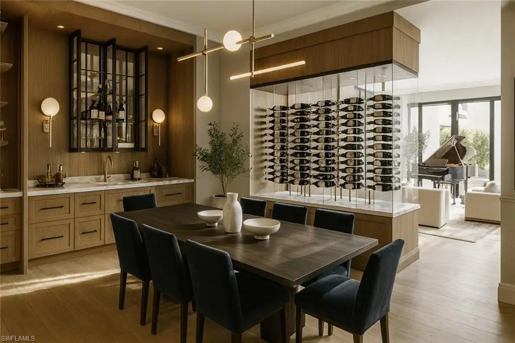 Commanding a rare, western lakefront view in Old Naples, this new construction estate redefines scale, craftsmanship, and architectural clarity. Encompassing over 9,400 square feet of interior living space, the home was conceived as a private resort - where every element supports both the grand and granular aspects of daily living. Twin infinity-edge reflecting pools frame the entrance, opening into a dramatic two-story great room with precision millwork, architectural symmetry, and a sculptural floating staircase. Adjacent, a formal dining room is anchored by a custom, glass-enclosed wine wall integrated into bespoke cabinetry. The kitchen, defined by a curved steel-and-glass partition, includes Wolf/Sub-Zero appliances, dual Miele coffee stations, and a concealed butler's pantry equipped for large-scale entertaining. Subtle finishes and architectural restraint elevate the overall atmosphere. The first-floor primary suite is entirely self-contained, featuring a private study, two oversized dressing rooms, a discreet laundry center, and a marble-clad bath with indoor/outdoor showers. Upstairs, five additional bedroom suites are complemented by a media lounge and a concealed club room with full bar and humidor. Outdoor architecture is equally refined. A 60-foot negative-edge pool extends across the rear elevation, interrupted by a series of stepping-stones that lead to a sunken firepit lounge surrounded by water. An elevated spa, covered loggia, and summer kitchen complete the space. Above it all, a detached fitness pavilion with breathtaking wide lake vistas, introducing a compelling architectural counterpoint. Additional features include 13x Toto Neorest toilets, three laundry stations, a commercial-grade sheet ironer, full-home generator, elevator, and a five-car split garage designed for collectors. A comprehensive smart home system governs all functions discreetly. Realized by New England based developer EMB Custom Homes, and executed by MHK Architecture, Lotus Construction, and Freestyle Interiors, this fully furnished residence is a singular opportunity in the Naples luxury market. An unrivaled legacy property. Completion is scheduled for October 2025.