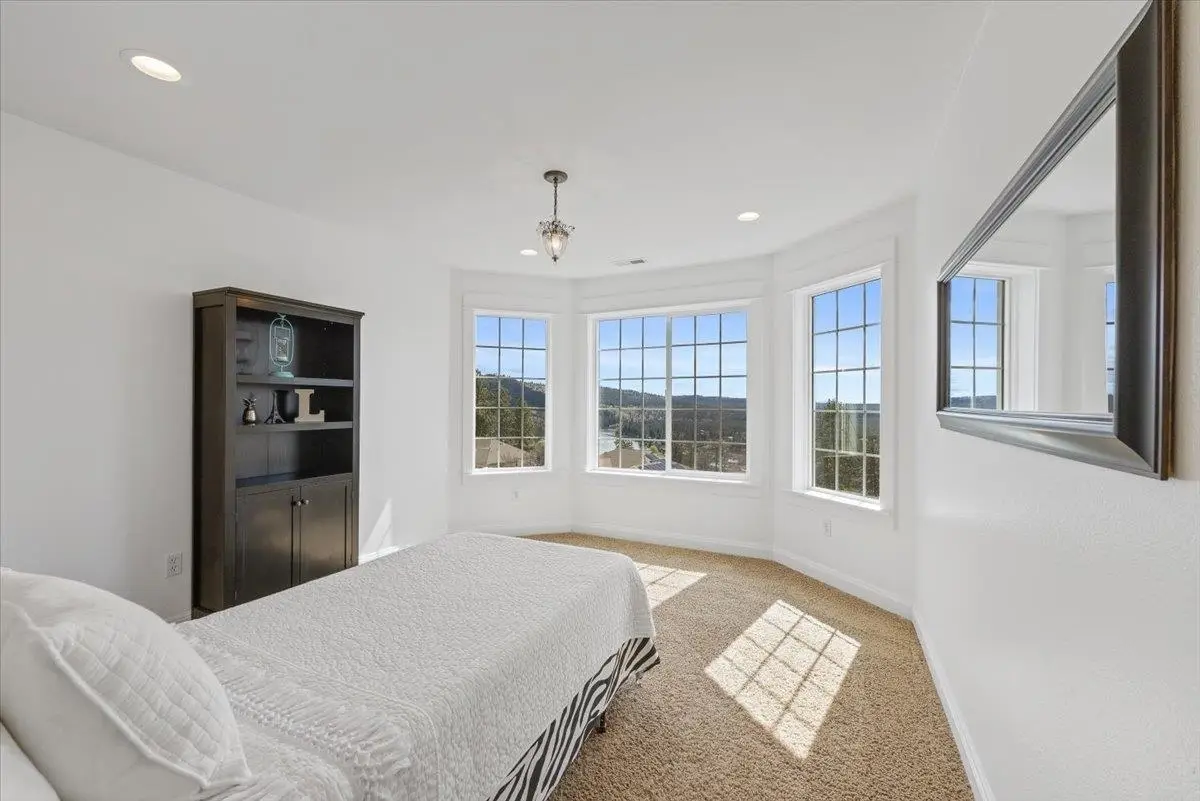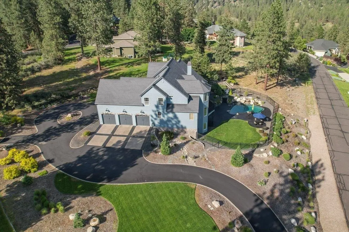 Custom built two-story with daylight walkout basement modern farmhouse style home on 1+ acre lot with an incredible lake view! There is so much to love in this home that has an open floor plan, floor to ceiling windows and newer LVP plank flooring. Solid alder wood doors. Spacious kitchen with granite counters, built-in gas range, new dishwasher and a huge island. Main floor primary suite with a walk-in closet and full bath. Formal dining room plus an office/library. Second floor features 3 bedrooms and 2 bathrooms along with a bonus play room over the garage. Lower level family room has a wet bar, workout room, plus a home theater room along with a 5th bedroom and bathroom. Wait there's more! A salt-water pool with a waterfall feature. 3-car oversized garage and plenty of driveway parking. Newer HVAC system (01/2025). HardiePlank siding & shake accent. All in a gated neighborhood with amazing views of Lake Spokane that's conveniently located to shopping, dining & an easy commute to Spokane.
