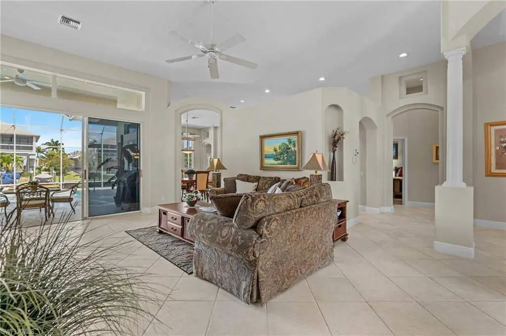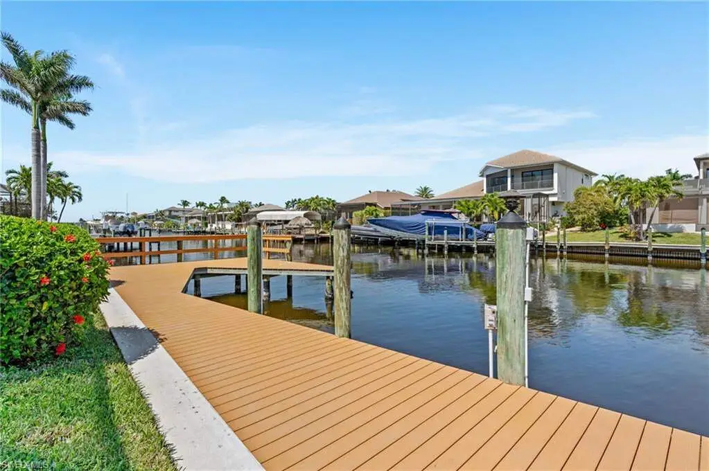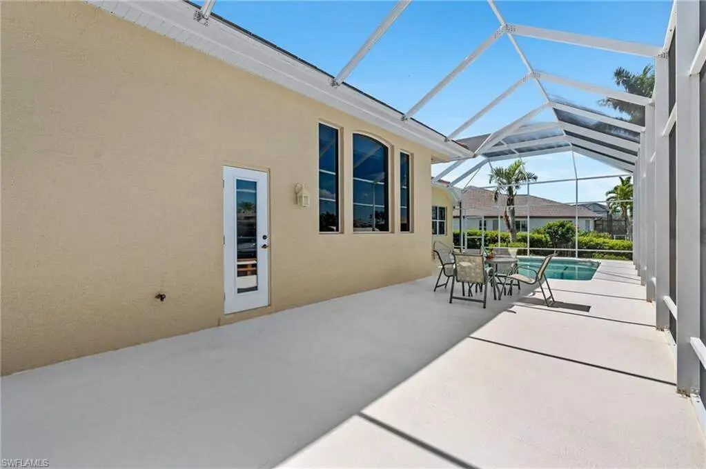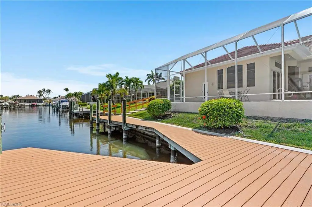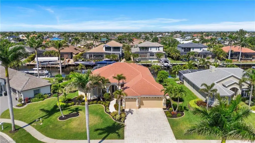 Welcome to your dream home in Cape Harbour, where luxury, comfort, and coastal living come together in perfect harmony. Nestled within one of Southwest Florida's most prestigious waterfront communities, this stunning pool home offers the ideal blend of elegance and ease. Known for its scenic canals and direct Gulf of Mexico access, Cape Harbour is a paradise for boaters and water enthusiasts alike. As you arrive, you'll be captivated by the curb appeal of this expansive 4-bedroom + den, 3.5-bath, 3-car garage residence, offering over 5,000 square feet of indoor and outdoor living space. Step through custom etched glass French doors into a grand formal living area where soaring ceilings and sliding glass doors frame views of the pool and canal. A built-in wet bar with a beverage refrigerator makes entertaining effortless. The updated kitchen is a chef's delight, featuring shaker-style cabinetry, a custom range hood, tile backsplash, granite countertops, stainless steel appliances, a pantry, and a large center island perfect for gatherings. The kitchen opens seamlessly to a bright eat-in area and spacious family room, where disappearing sliding glass doors invite the outdoors in and fill the space with light and tranquil waterfront views. The home also features a formal dining room, a versatile den or home office, and a stylish half bath for guests. The primary suite is a private retreat, featuring new plank tile flooring, a tray ceiling, a generous sitting area, and private pool access through an etched glass door. Wake each morning to water views and unwind in the spa-inspired bath, complete with two walk-in closets, an oversized soaking tub, dual vanities with new sinks, and a walk-through shower with a teak seat. The guest bedrooms are equally inviting, with two sharing a Jack-and-Jill bath and the third enjoying a private ensuite that also serves as the pool bath. All guest rooms feature wide plank tile flooring, and two have walk-in closets. Step outside to the oversized screened lanai, which spans the full length of the home and offers ample space for lounging, dining, and entertaining under the Florida sun. A short stroll takes you to your private composite boat dock, where you're just minutes from open water-perfect for boating and fishing. Recent updates include a new roof ('23) and new AC system '(24), providing peace of mind and long-term value. Located on a quiet cul-de-sac, this home also offers access to Cape Harbour's resort-style amenities, including a marina, pools, fitness center, and a vibrant social scene. Stroll through the walkable waterfront village, featuring boutique shopping, waterfront dining, live music, and spectacular sunsets-all just steps away. This home is being sold turnkey and includes a transferable flood policy, so you can move right in and start enjoying the Florida sunshine. More than just a residence, this is a lifestyle-where every day feels like a vacation!