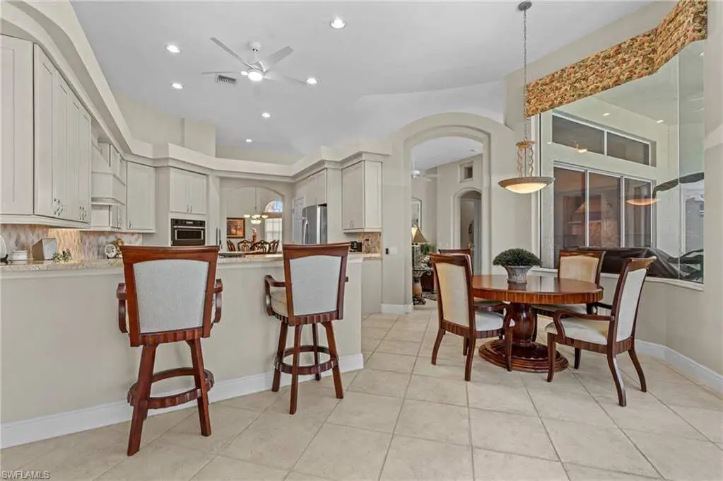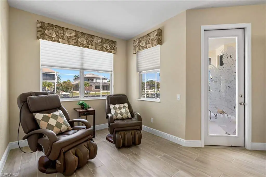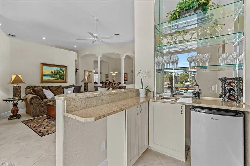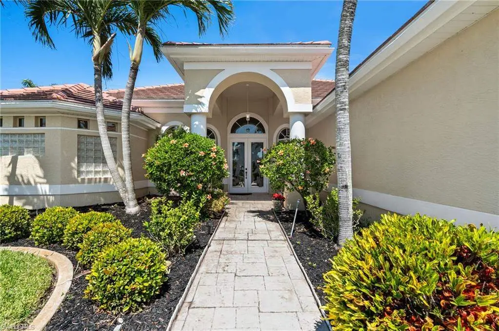 Welcome to your dream home in Cape Harbour, where luxury, comfort, and coastal living come together in perfect harmony. Nestled within one of Southwest Florida's most prestigious waterfront communities, this stunning pool home offers the ideal blend of elegance and ease. Known for its scenic canals and direct Gulf of Mexico access, Cape Harbour is a paradise for boaters and water enthusiasts alike. As you arrive, you'll be captivated by the curb appeal of this expansive 4-bedroom + den, 3.5-bath, 3-car garage residence, offering over 5,000 square feet of indoor and outdoor living space. Step through custom etched glass French doors into a grand formal living area where soaring ceilings and sliding glass doors frame views of the pool and canal. A built-in wet bar with a beverage refrigerator makes entertaining effortless. The updated kitchen is a chef's delight, featuring shaker-style cabinetry, a custom range hood, tile backsplash, granite countertops, stainless steel appliances, a pantry, and a large center island perfect for gatherings. The kitchen opens seamlessly to a bright eat-in area and spacious family room, where disappearing sliding glass doors invite the outdoors in and fill the space with light and tranquil waterfront views. The home also features a formal dining room, a versatile den or home office, and a stylish half bath for guests. The primary suite is a private retreat, featuring new plank tile flooring, a tray ceiling, a generous sitting area, and private pool access through an etched glass door. Wake each morning to water views and unwind in the spa-inspired bath, complete with two walk-in closets, an oversized soaking tub, dual vanities with new sinks, and a walk-through shower with a teak seat. The guest bedrooms are equally inviting, with two sharing a Jack-and-Jill bath and the third enjoying a private ensuite that also serves as the pool bath. All guest rooms feature wide plank tile flooring, and two have walk-in closets. Step outside to the oversized screened lanai, which spans the full length of the home and offers ample space for lounging, dining, and entertaining under the Florida sun. A short stroll takes you to your private composite boat dock, where you're just minutes from open water-perfect for boating and fishing. Recent updates include a new roof ('23) and new AC system '(24), providing peace of mind and long-term value. Located on a quiet cul-de-sac, this home also offers access to Cape Harbour's resort-style amenities, including a marina, pools, fitness center, and a vibrant social scene. Stroll through the walkable waterfront village, featuring boutique shopping, waterfront dining, live music, and spectacular sunsets-all just steps away. This home is being sold turnkey and includes a transferable flood policy, so you can move right in and start enjoying the Florida sunshine. More than just a residence, this is a lifestyle-where every day feels like a vacation!