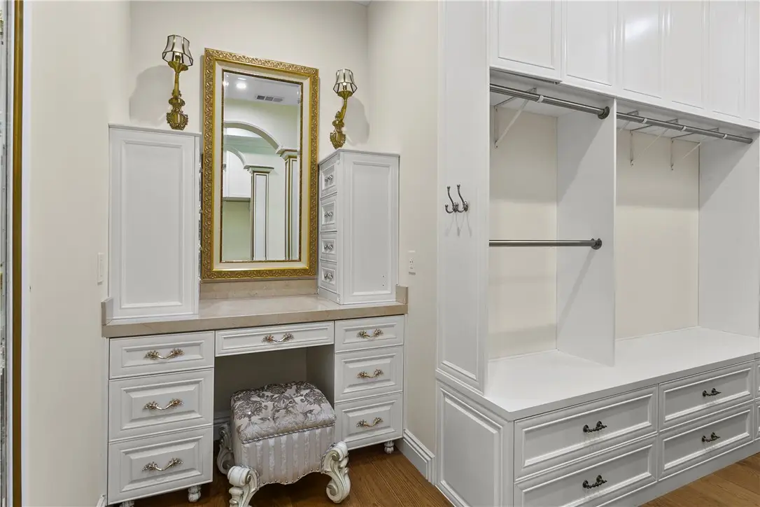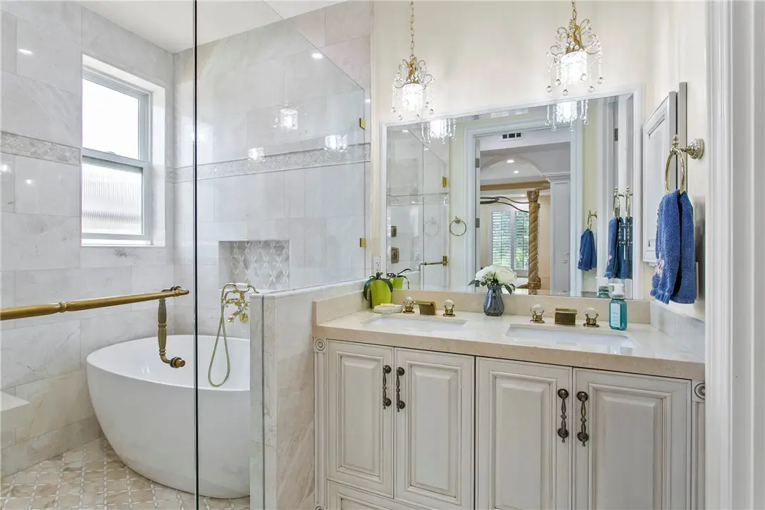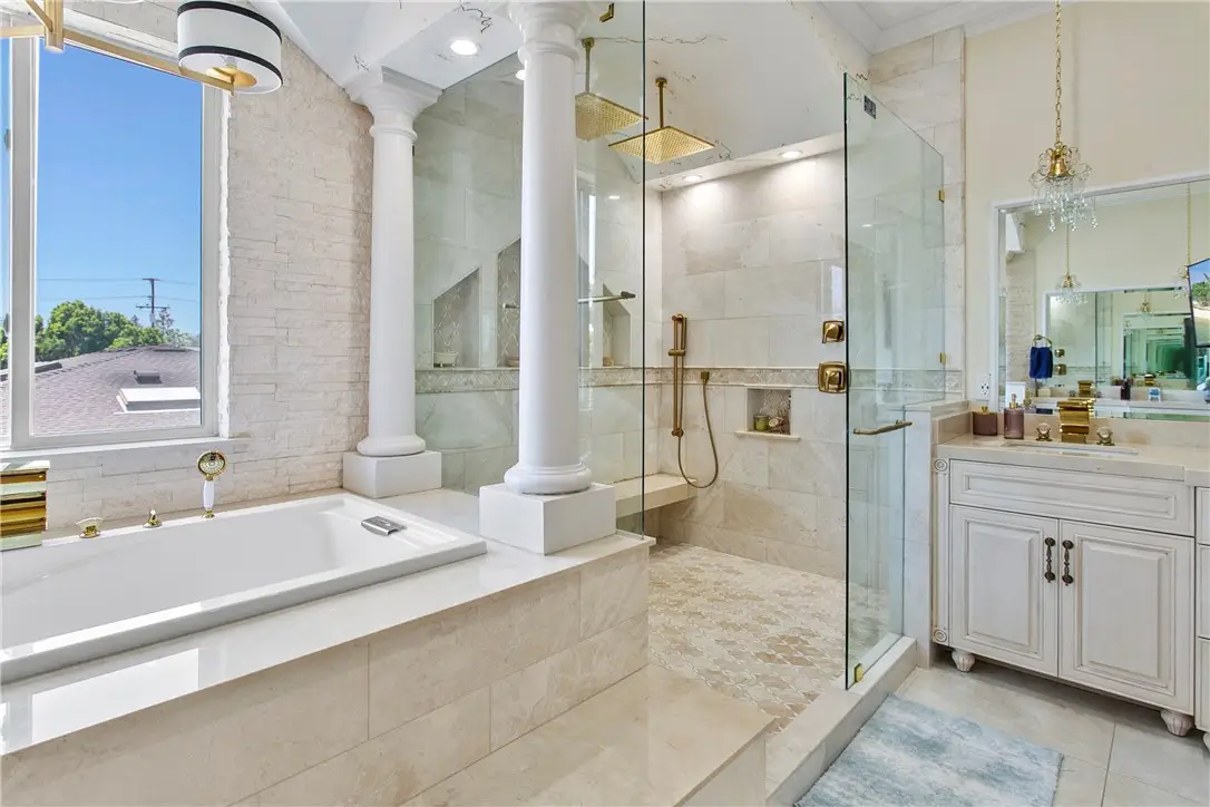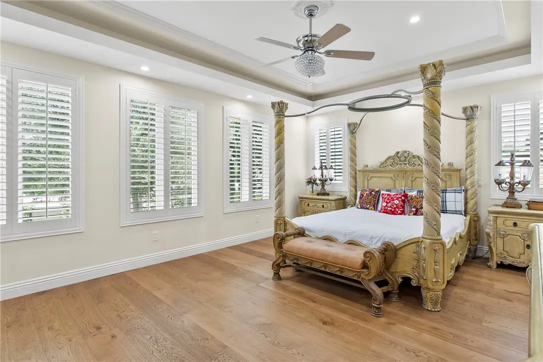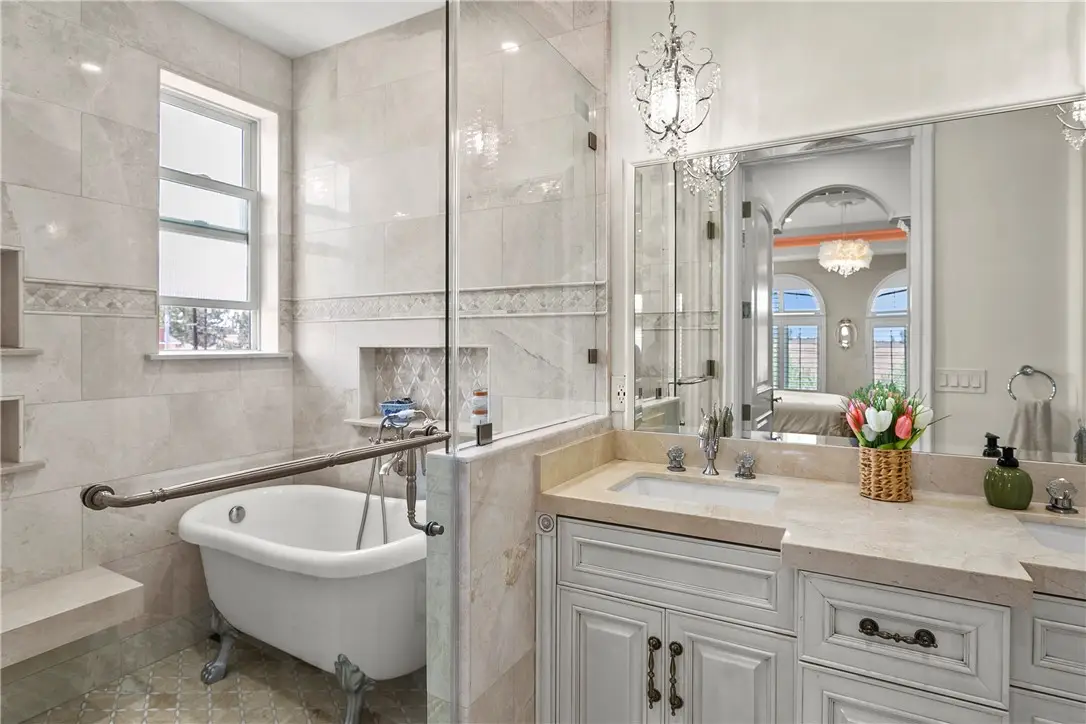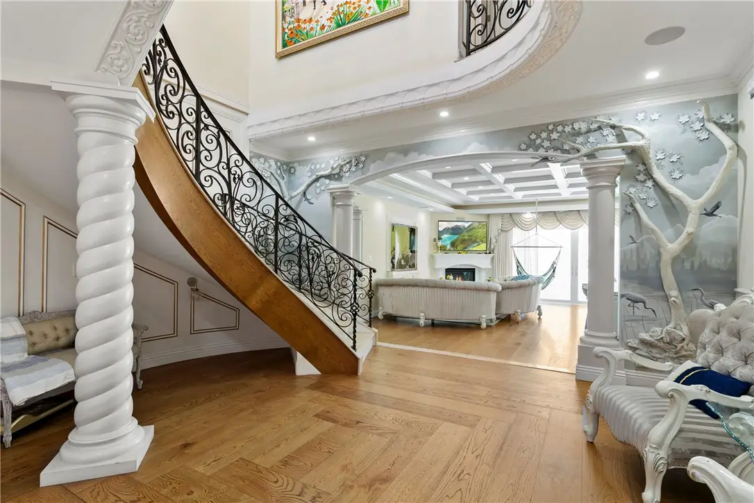Stunning Mediterranean-Style Luxury Smart Home, Custom Built by Loving Father for Family. This extraordinary custom-built home blends top-tier craftsmanship with unparalleled comfort, style, and functionality, offering a fully integrated Smart Home experience and every amenity imaginable for modern luxury living. Every inch of this home was built with meticulous care and loving devotion. Inside, you'll find solid-core 8 ft tall wood doors, dual-pane fiberglass windows, high-end wood & stone flooring, coffered 10 ft tall ceilings, custom-built crown moldings, golden accents, and an intercom system throughout rooms. In Living Room built into wall is Custom See-Through Salt Water Fish Tank with Exotic fish! Upon entering is wonderful Art Wall depicting landscape and concrete branch design with molded flowers-- A Delightful Artistic Touch. All Bedrooms are Master Bedrooms, featuring en-suite baths, free standing tubs in showers, wet room, Crema Merfil bathroom counters, decorative soffits, walk-in closets, chandeliers, LED remote controlled ceiling lights, bluetooth speakers, and casement double-pane windows with shutter blinds. Upstairs Master Suite features two walk-in closets, gas fireplace, jacuzzi tub, balcony overlooking Oasis, and the Most Enchanting Custom-Design Ceiling Decor! Ceiling above Master Suite jacuzzi is beautiful Venetian Plaster with Golden Veins. Gorgeous Gourmet kitchen with expensive Quartz counters, high-end stove with pot filler and hood, beautiful built-in cabinets in Antique White, spice drawers, eating bar, and thick, durable glass sliding pocket doors overlooking the pool. Enjoy a lush salt-system pool and adjacent jacuuzzi all year long, with water-heating system and waterworks all controlled via phone-- including waterfall, water jets, and underwater LED color-changing lights. Beneath the cabana held up by custom murals is a built-in BBQ with mini fridge, installed bluetooth speakers, and Baja with built in bar stools. Elaborate Smart Home System nestled out of sight, yet easily accessible, manages all features of the home, which YOU can easily control via cell phone! 3 Car Garage includes RV hook ups and Electric Car Charger. A Variety of fruit trees are planted in large pots-- already giving fruit! Access to Bonus Room is in upstairs laundry room. And to wrap it all up, an Underground Lock Safe is nestled below 8 inches of concrete for secure, personal use. This House has it all. Truly, a One-of-a-Kind Home.