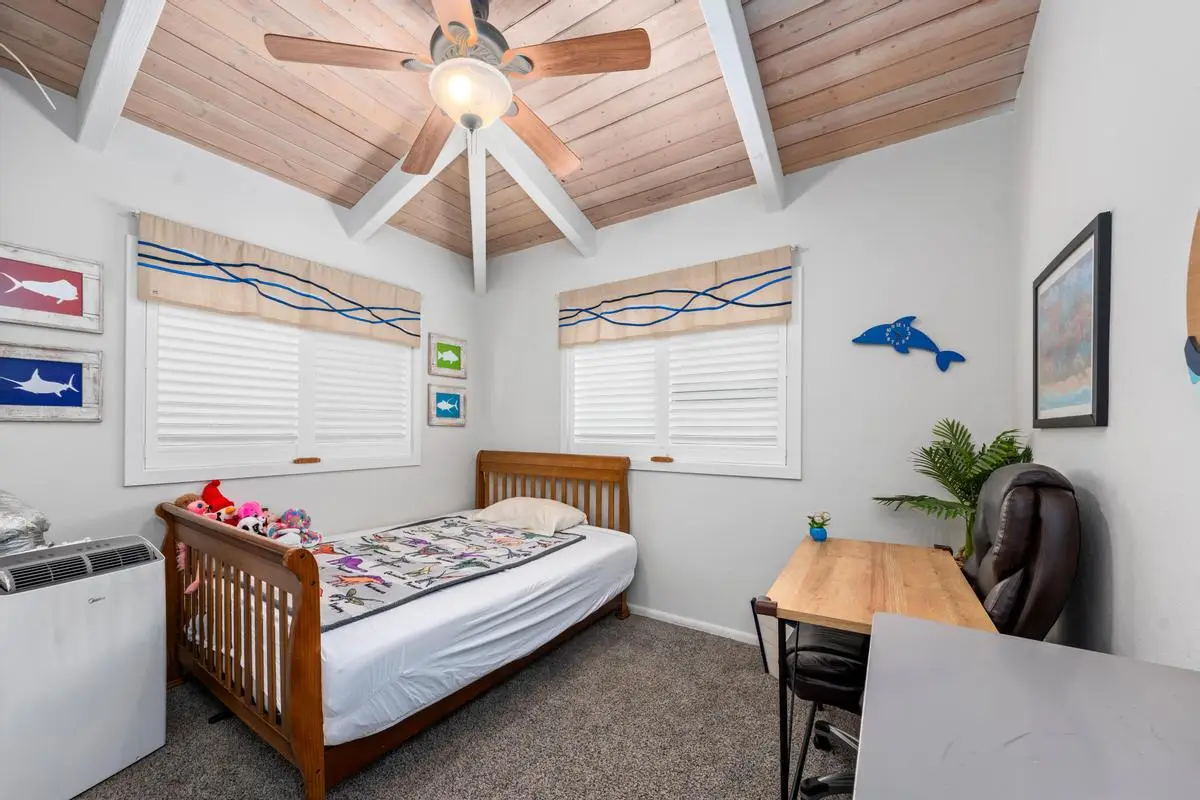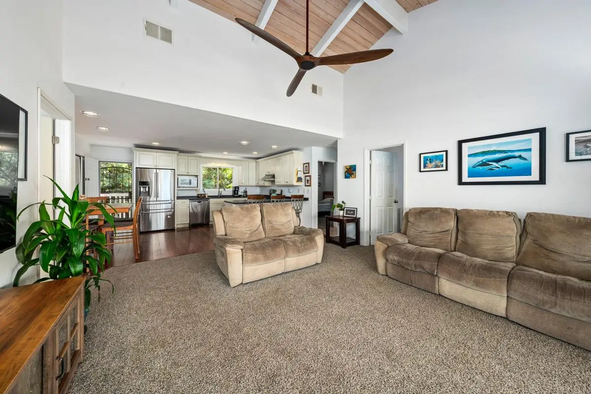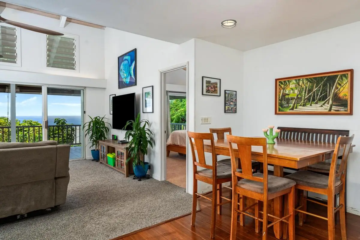 Spacious almost 2,300sf home on a private approximately half-acre flag lot with mature trees and a nice grassy fenced yard. Features two separate living areas with ocean views from both levels. Upstairs (3 bed/2 bath): Main home, Open-concept living with vaulted wood open-beam ceilings, granite kitchen counters, split floor plan with primary and guest rooms separated by living space and large lanai perfect for watching year round sunsets. Downstairs (2 bed/1 bath): Separate entrance, full kitchen (stove not included), washer/dryer, and lanai with hot tub and ocean views. Outdoor Features: Two expansive lanais, Fruiting Mangos, apple bananas, Lime, Samoan coconut… grassy yard, raised garden bed, fenced in back yard area and ample parking with an 864 sq ft carport and cement driveway. Energy Efficient with Owned, grid-tied solar system for very low electric bills. Perfect for multi-generational living or rental potential! Great location and Very low HOA fees in Komohana kai II of only $75/year. There is a Separate Tiny house on property and it is not included in the price but can be purchased separately.
