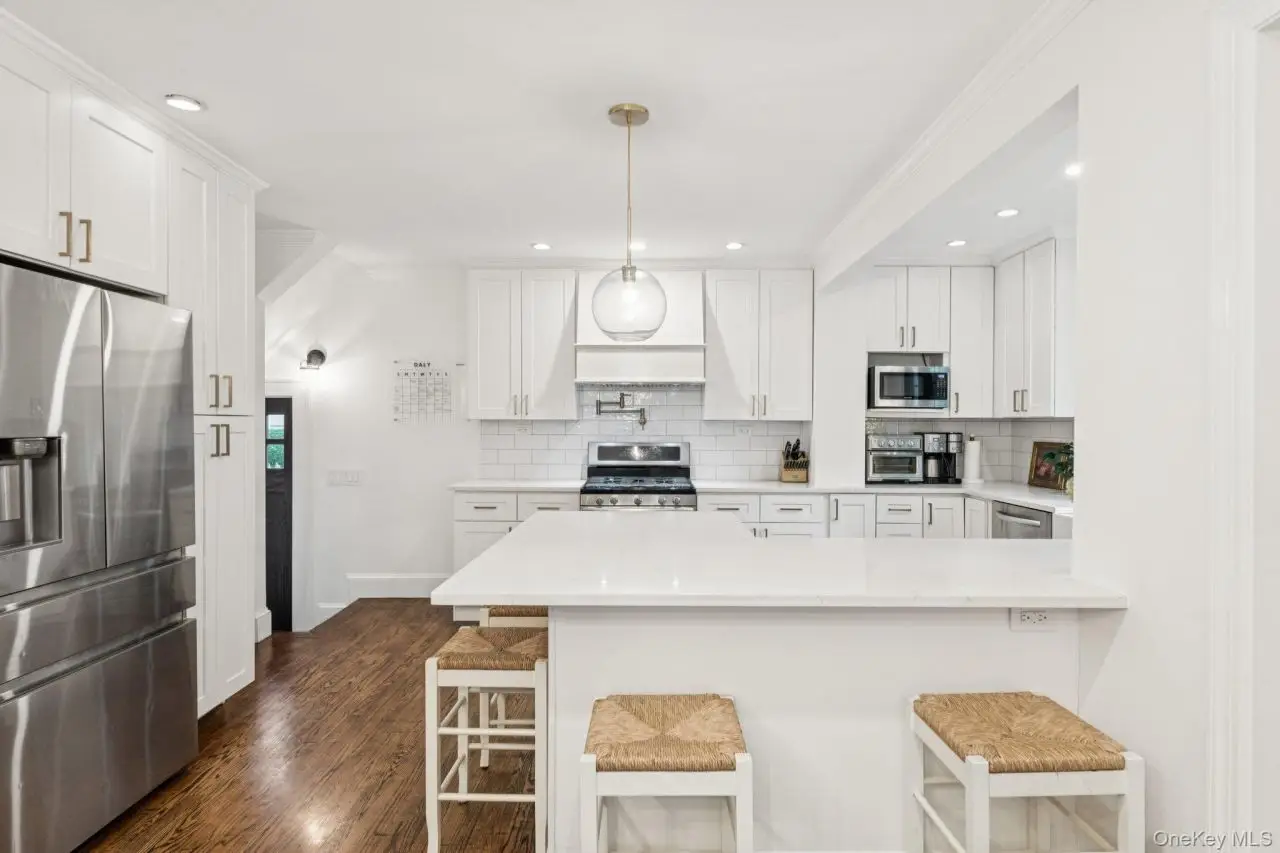 Welcome to this charming Tudor style home, in the heart of East Williston, offering 3 bedrooms and 1.5 baths in pristine, move in ready condition. The inviting living room features a cozy fireplace and sun-filled sunroom, while the beautiful kitchen with breakfast bar flows seamlessly into a dining and living spaces. Hardwood floors run throughout the home, adding warmth and elegance. Upstairs you'll find three generously sized bedrooms and a full bath. Outdoor entertaining is a breeze with a private cozy patio-perfect for relaxing or hosting.