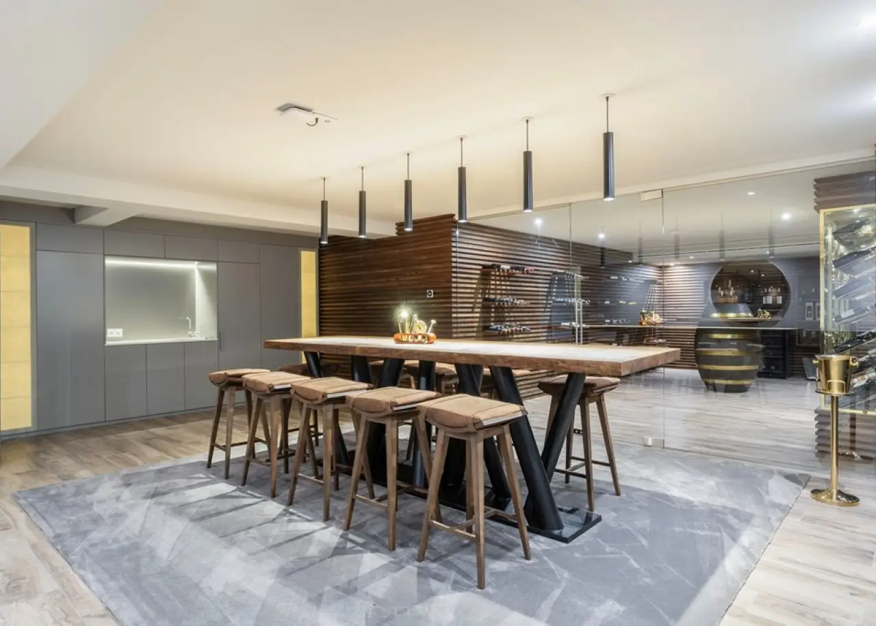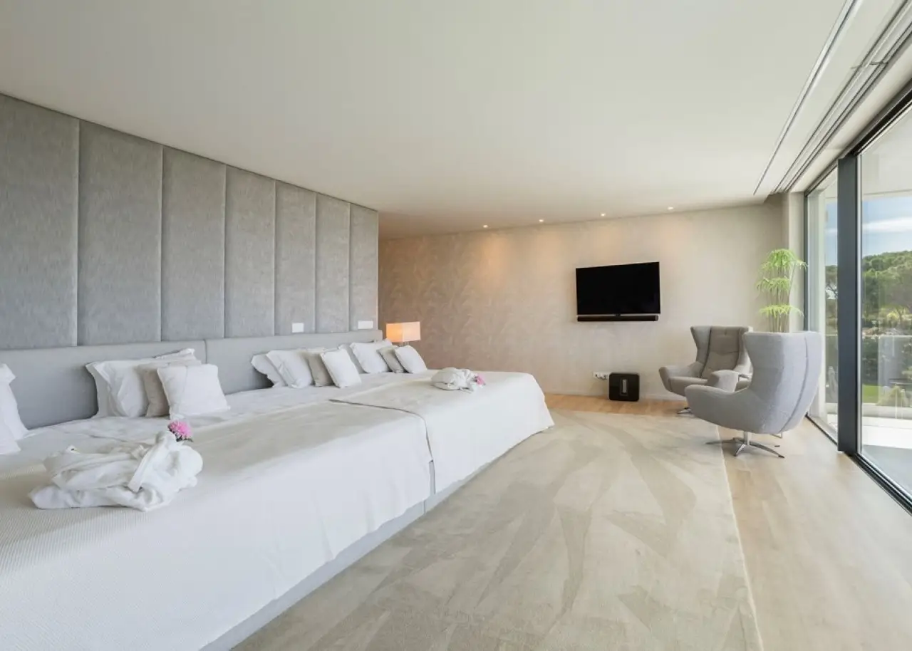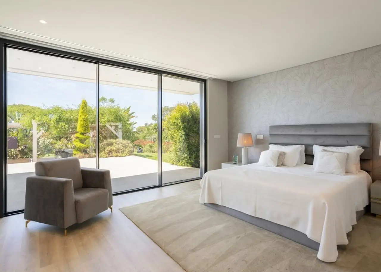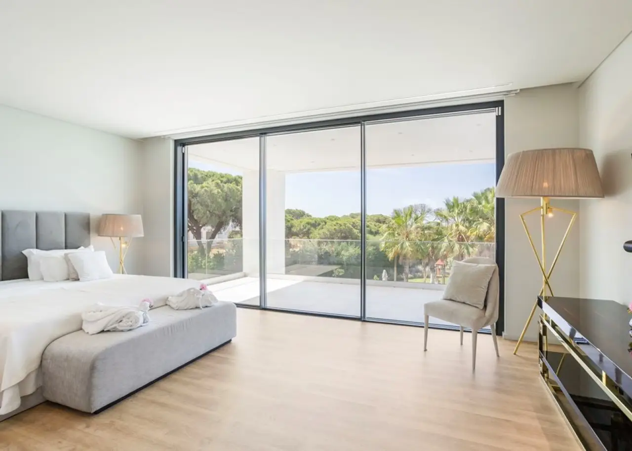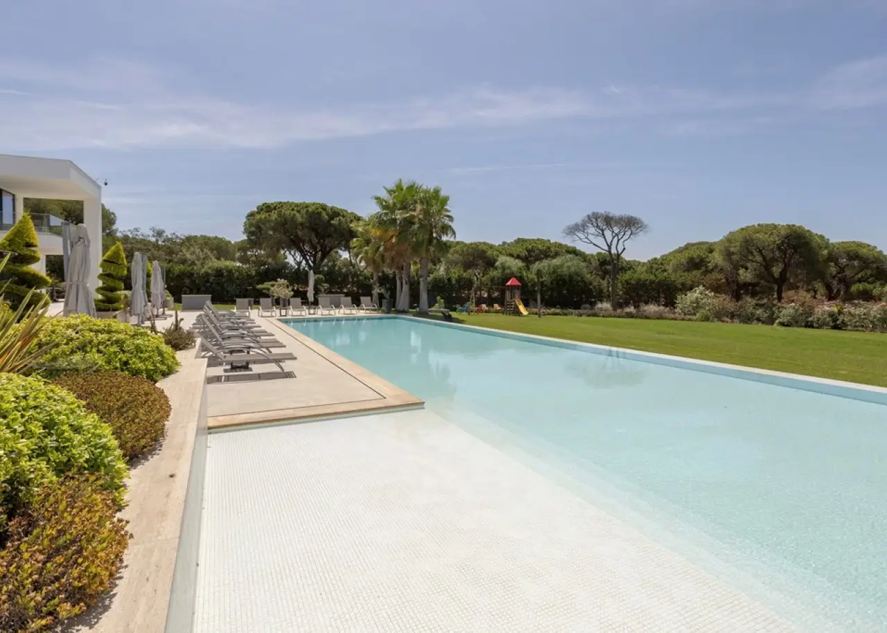 Located in one of Vilamoura 's most prestigious areas - Pinhal Velho, in the Algarve 's Golden Triangle - this 8-suite villa stands out for its balanced combination of comfort, discretion and build quality. The first floor is marked by a large, bright room, with living and dining areas in harmony with the exterior surroundings. The modern , fully-equipped kitchen is open-plan and extends to the outdoor area, creating a fluid connection between the spaces. This floor also includes three suites and a laundry room. On the second floor, the master suite stands out for its comfort and privacy, with a walk-in closet, generous bathroom and terrace overlooking the garden. Two other suites, both with private terraces, complete this area. In the basement, the villa offers several additional features: a games room, bar, wine cellar, gym with Turkish bath, two suites, a large storage area and a garage with capacity for several vehicles. With its contemporary architecture and clean lines, it was built with quality materials and attention to detail. It has central air conditioning, solar panels for water heating and a central vacuum system. Surrounded by an extensive, mature and well-kept garden, the property offers several outdoor areas designed for peaceful enjoyment: a swimming pool, outdoor dining area, barbecue area, children's playground and garden nooks ideal for relaxing or socializing. Set in a calm and private environment, this house combines functionality with elegance. It is located a short distance from Vilamoura Marina, the beaches of the Golden Triangle, leading golf courses and the International College of Vilamoura. CHARACTERISTICS: Plot Area: 6 859 m2 | 73 830 sq ft Useful area: 957 m2 | 10 296 sq ft Deployment Area: 463 m2 | 4 978 sq ft Building Area: 1 168 m2 | 12 577 sq ft Bedrooms: 8 Bathrooms: 10 Garage: 4 Energy efficiency: A FEATURES: Luxurious Villa 8 suites Vilamoura Golden Triangle Laundry room Games room Bar Wine cellar Gym Private terraces Comfort Privacy Contemporary architecture Garden Swimming pool Children's playground