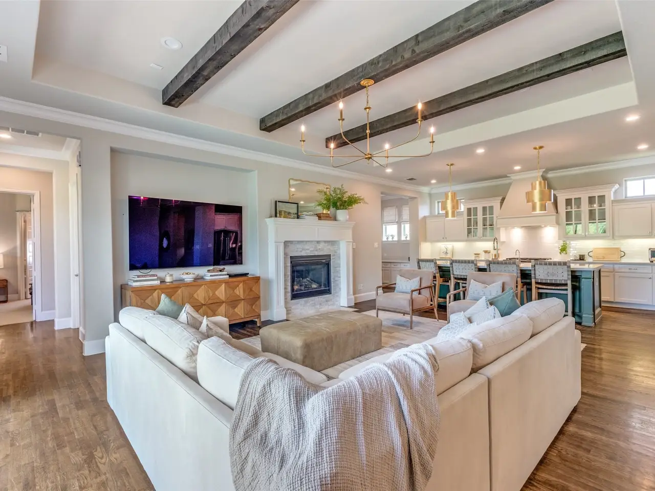 Stunning two-story modern Craftsman, nestled in the beautiful Canals at Grand Park. This beautifully designed home offers four spacious bedrooms with an additional space off the Primary Bedroom that could be used as an office, nursery, or exercise room, four full bathrooms, and a 3-car garage. Elegant hardwood floors guide you through the main level and into a chefs kitchen featuring white cabinetry, stainless steel appliances with a gas cooktop, a classic white subway tile backsplash, and an oversized island ideal for gathering. Thoughtfully designed extras include a wine bar, a media room, and a cozy covered back patio with a fireplace. The generous side yard wraps around to the backyard, offering ample space for outdoor living or a future pool. All light fixtures were updated to visual comfort and Ralph Lauren lighting. All new custom draperies.