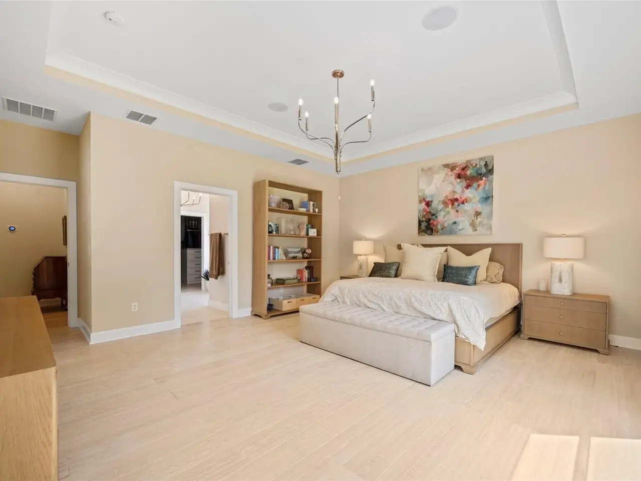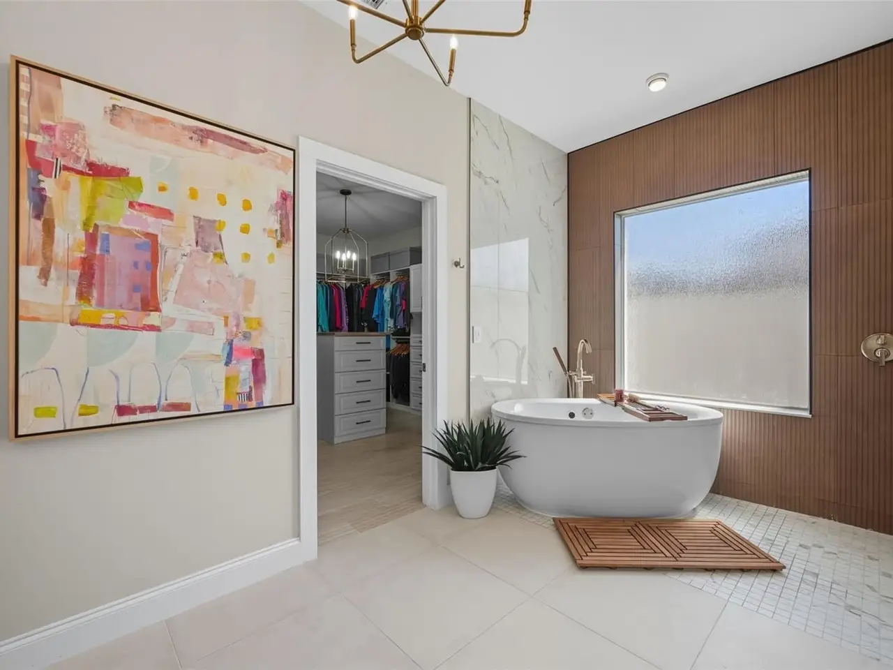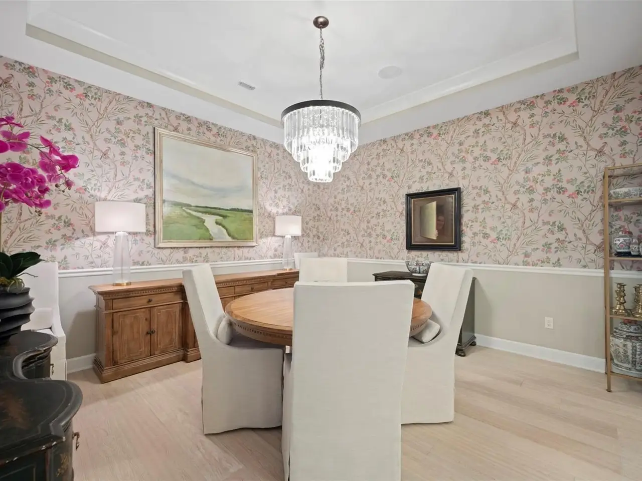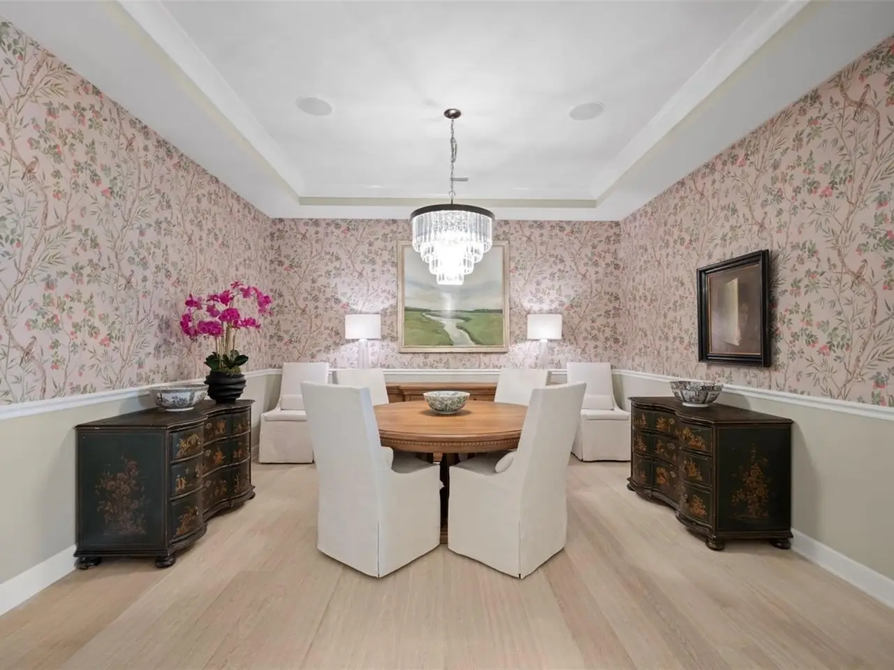 Automatic Hunter Douglas shades and artful chandelier