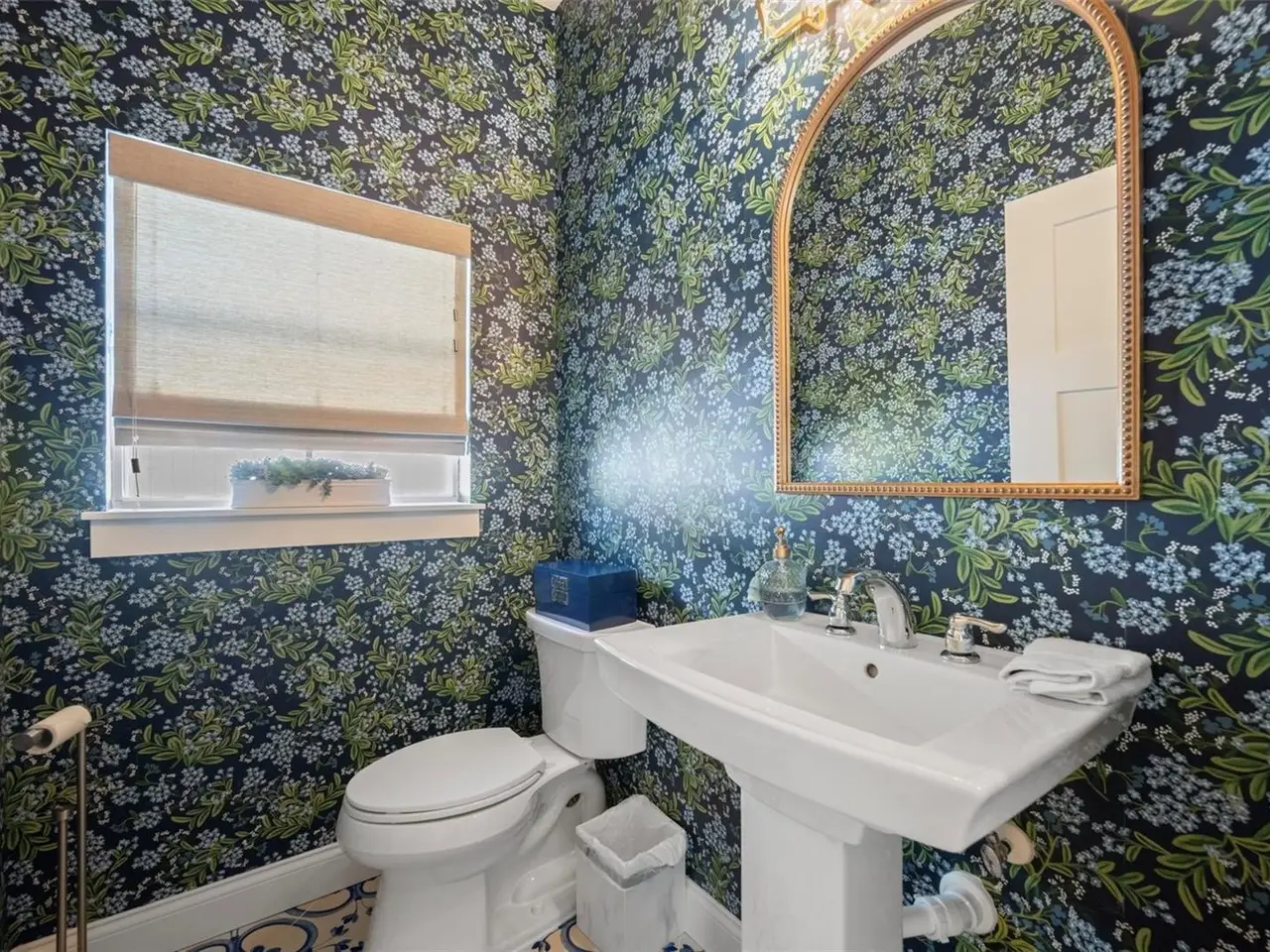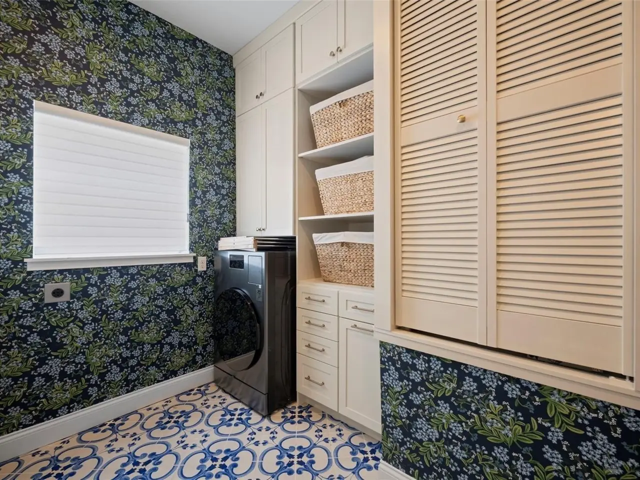 Redesigned laundry with designer wallpaper and tile