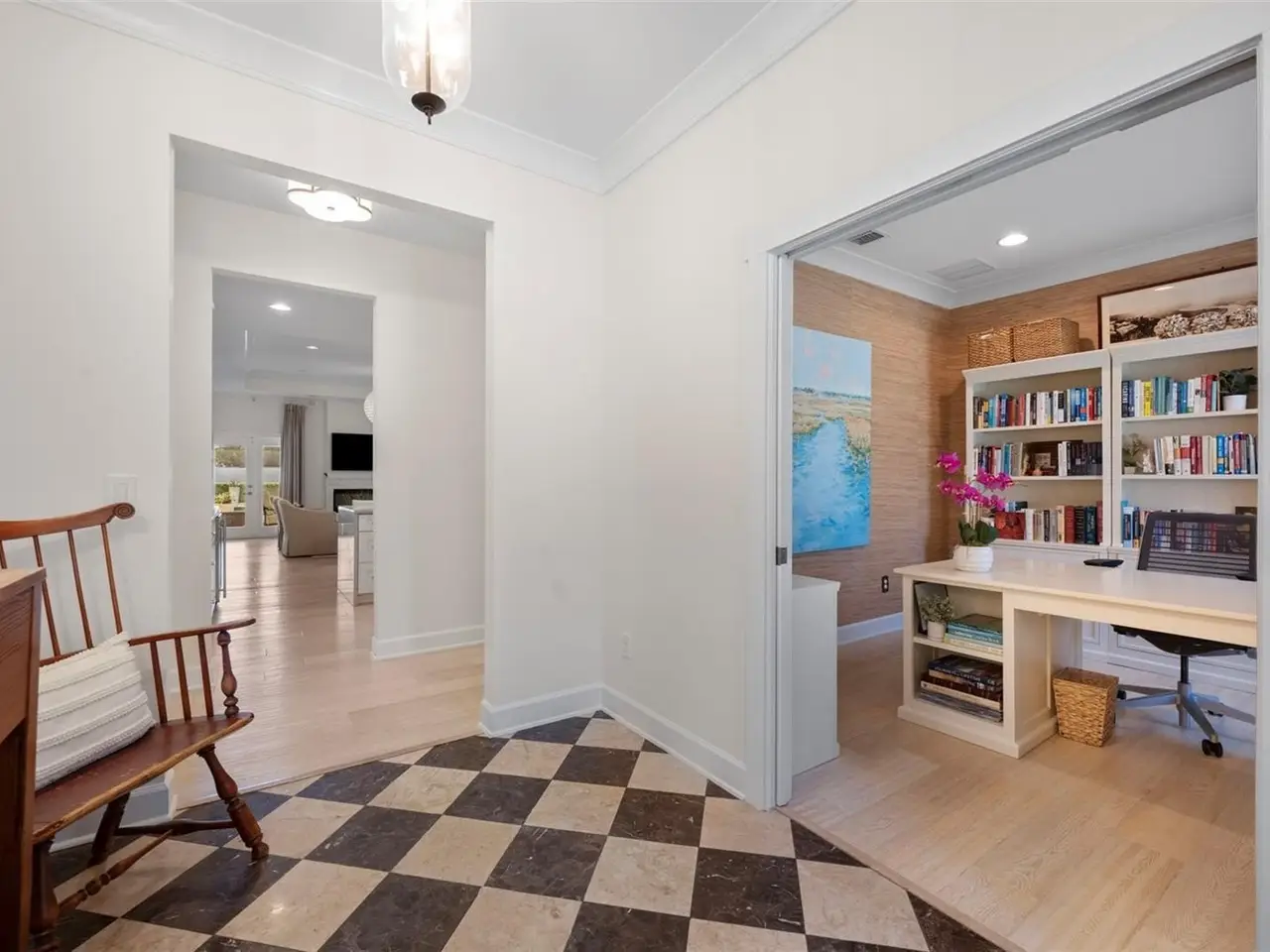 Marble foyer and white oak engineered wood flooring